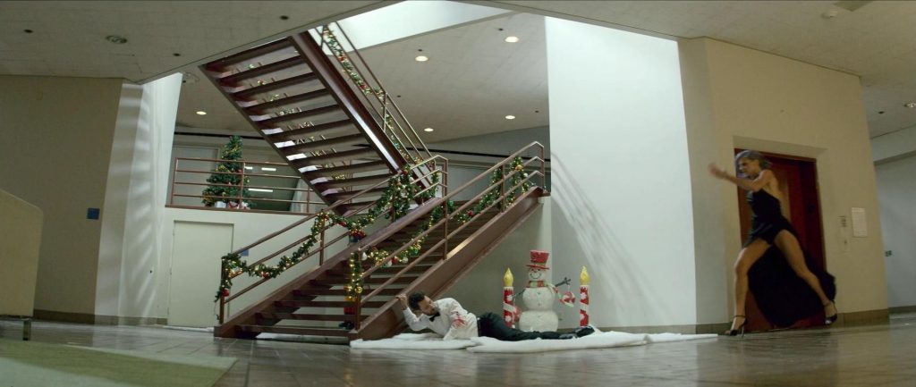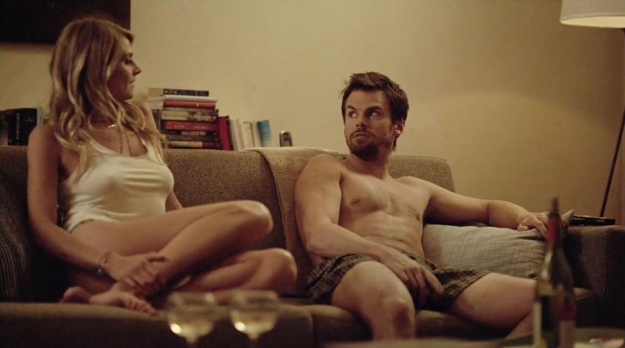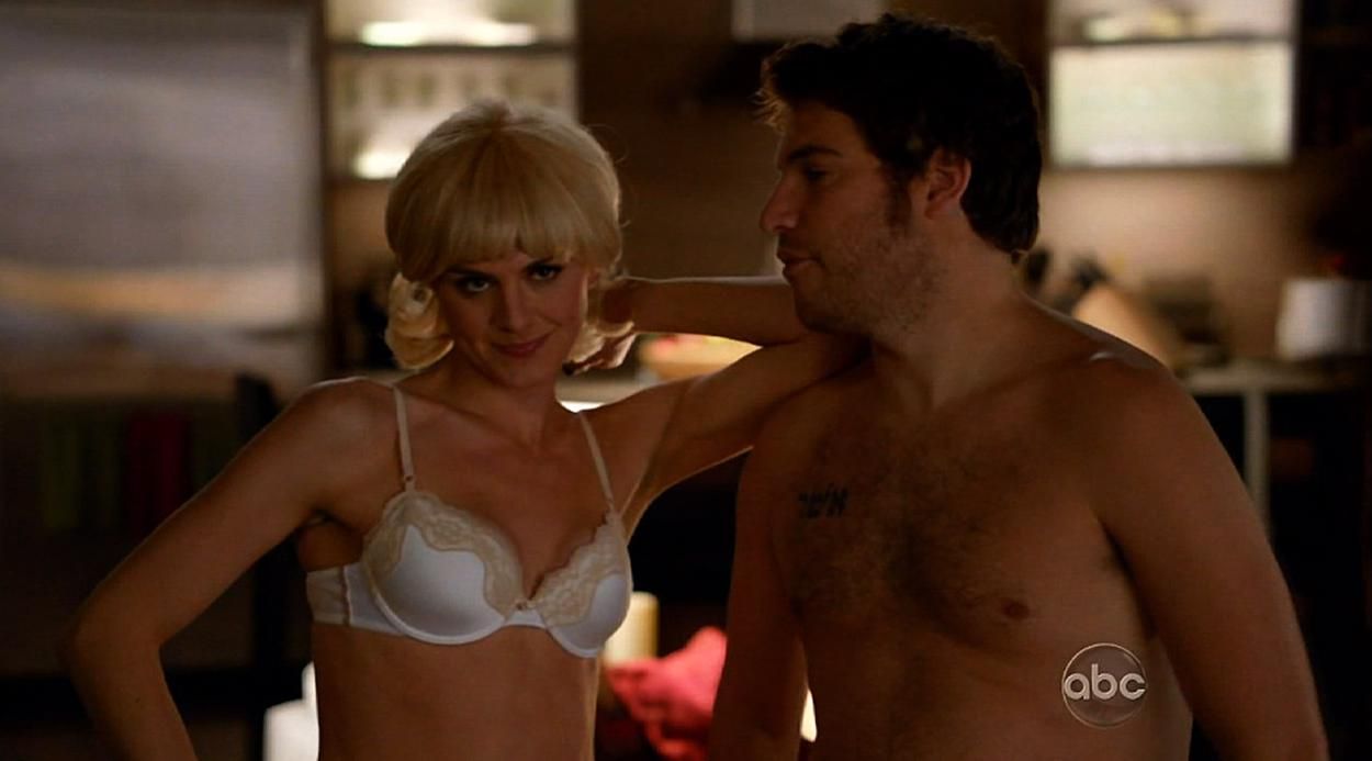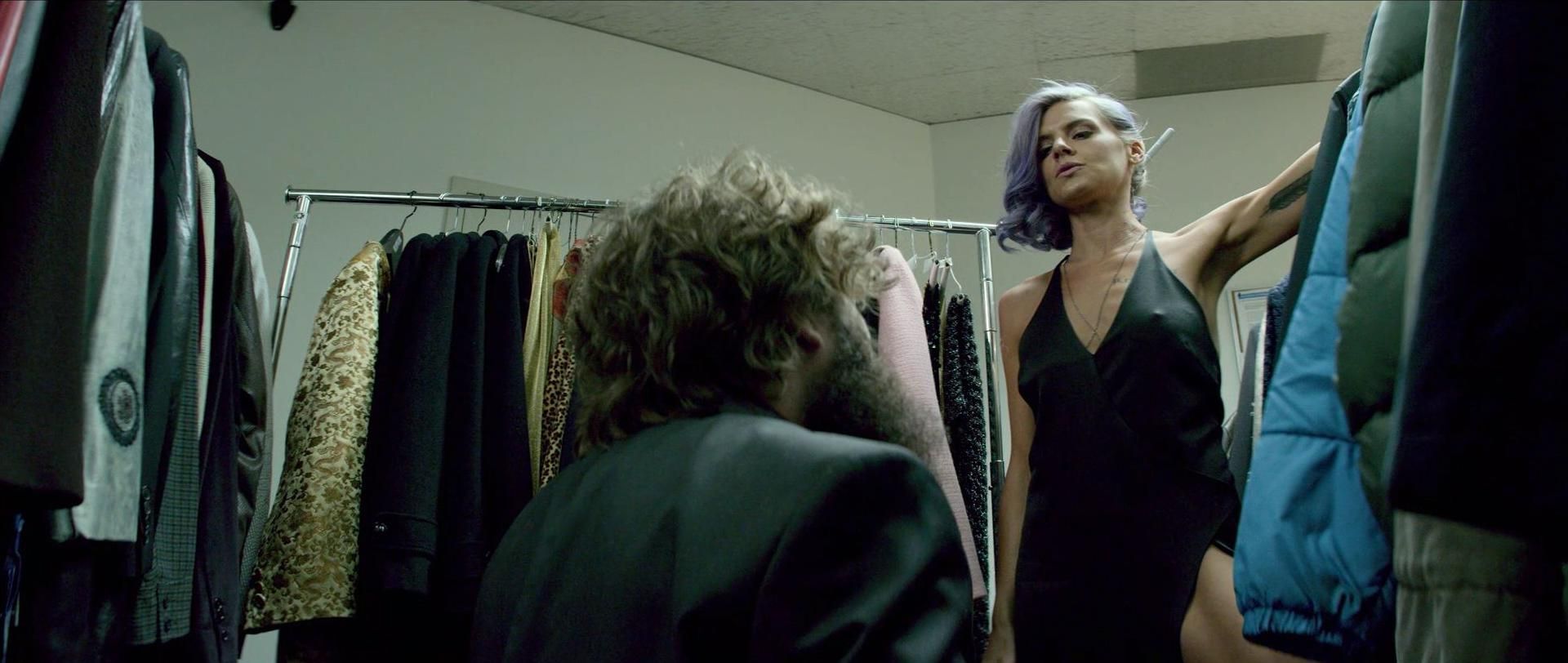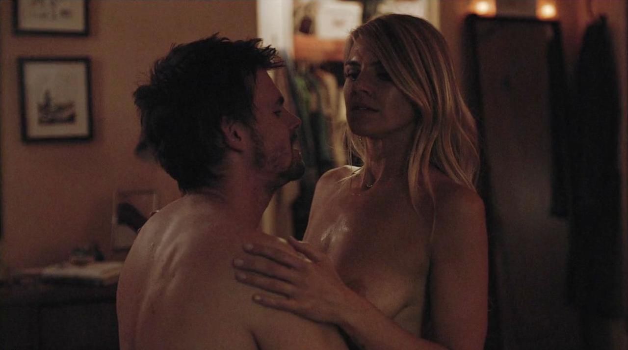 Eliza Coupe is having sex with a guy on the edge of a bed, naked in his lap as she rides him and we see her breasts and butt. She then dismounts and walks into another room naked to talk to a different guy. We see more of her breasts when she turns around and walks back to the bed, where she sits next to the first guy and wraps herself with the covers.