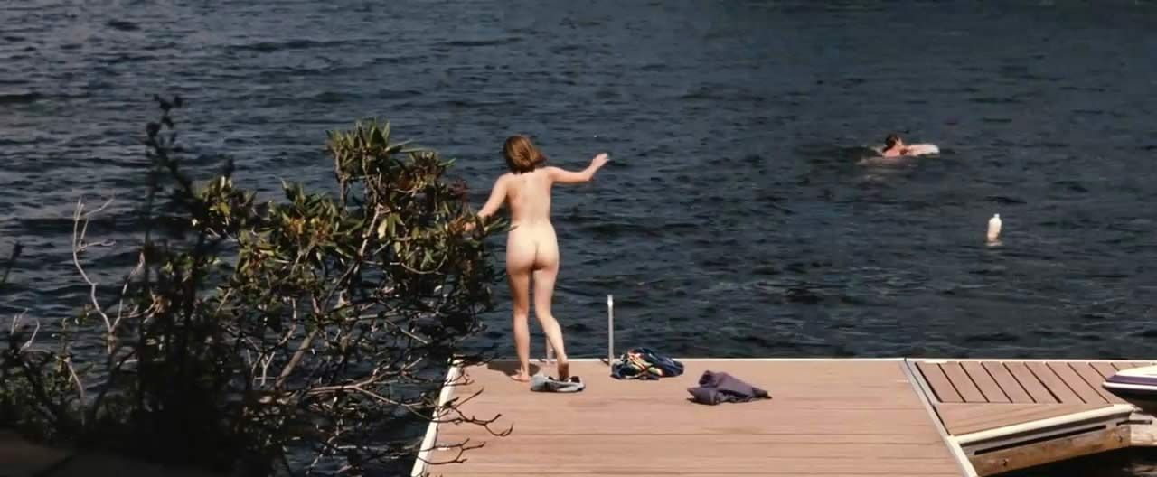 Elizabeth Olsen showed her tight ass and nude back as takes the clothes off on the dock and jumps into the lake. Then she is swimming a bit and leaving the water, showing her naked butt again!