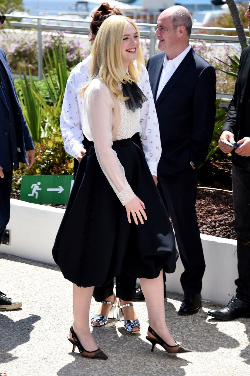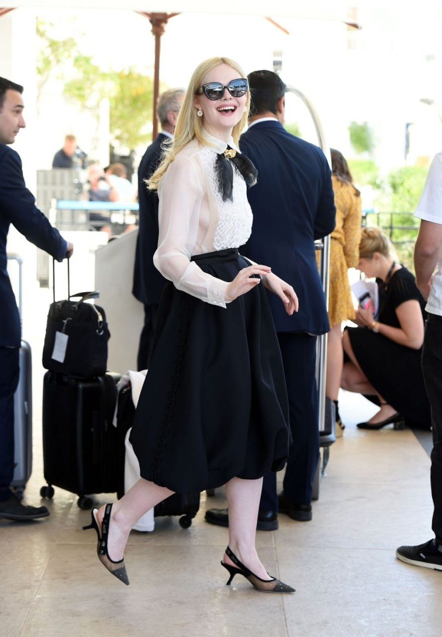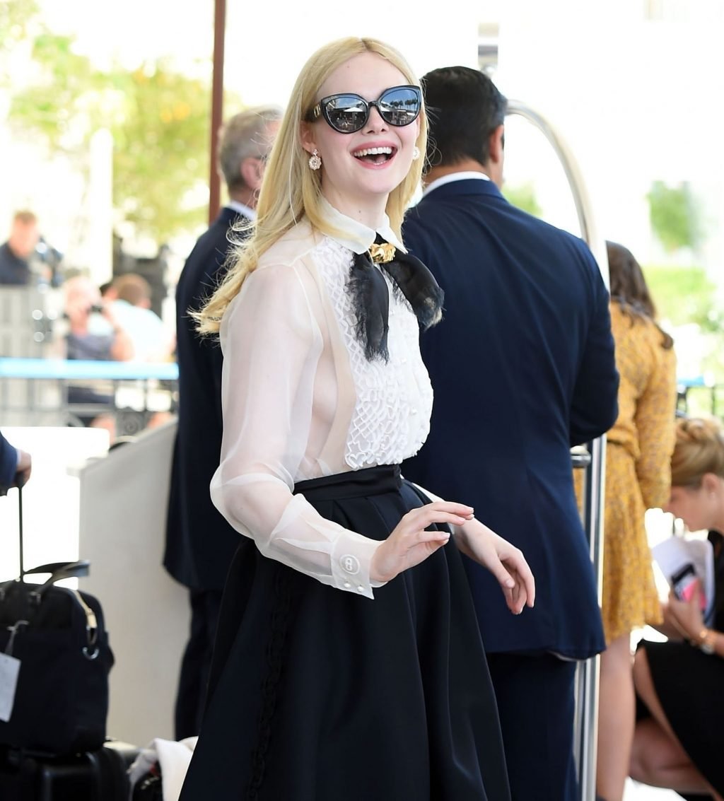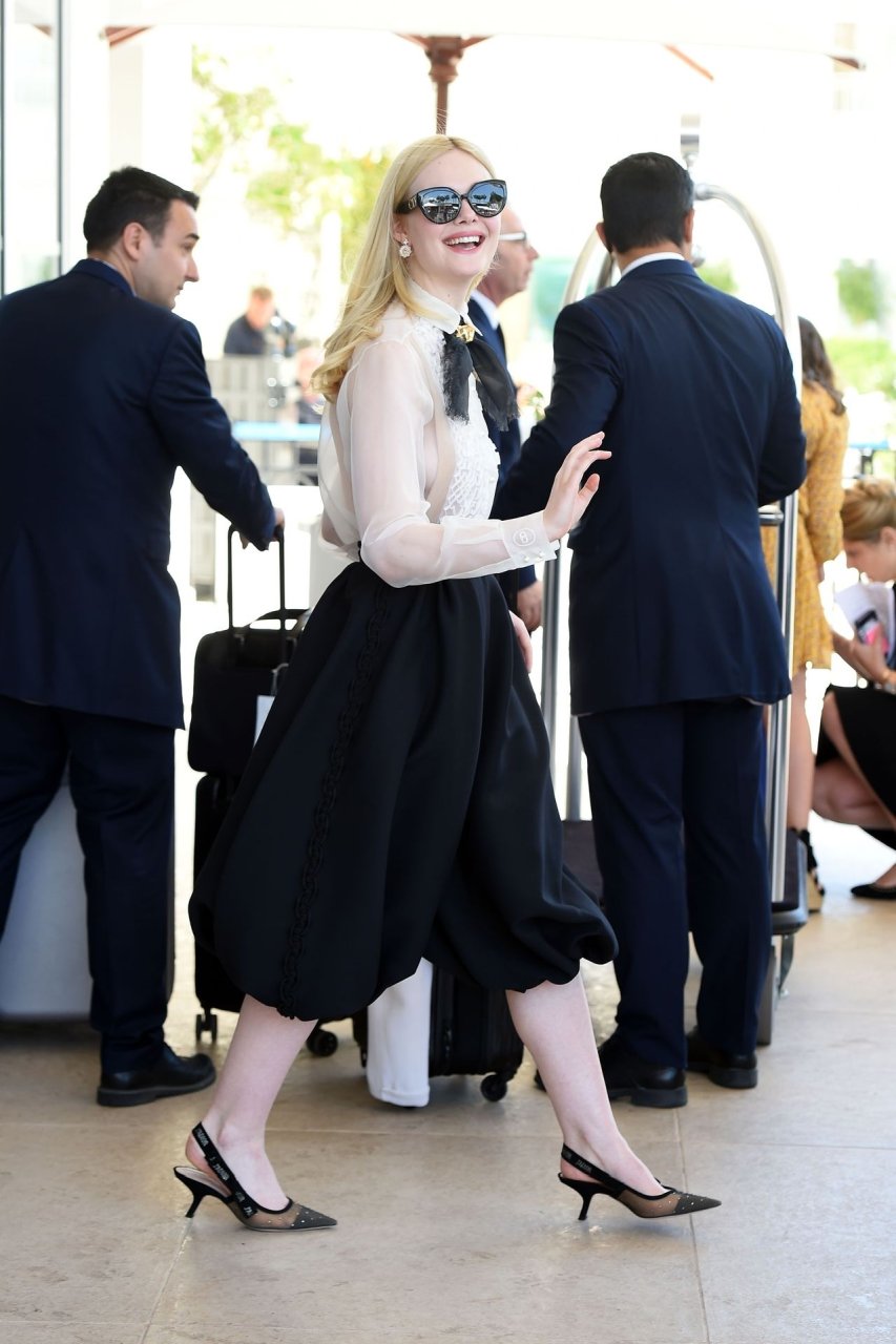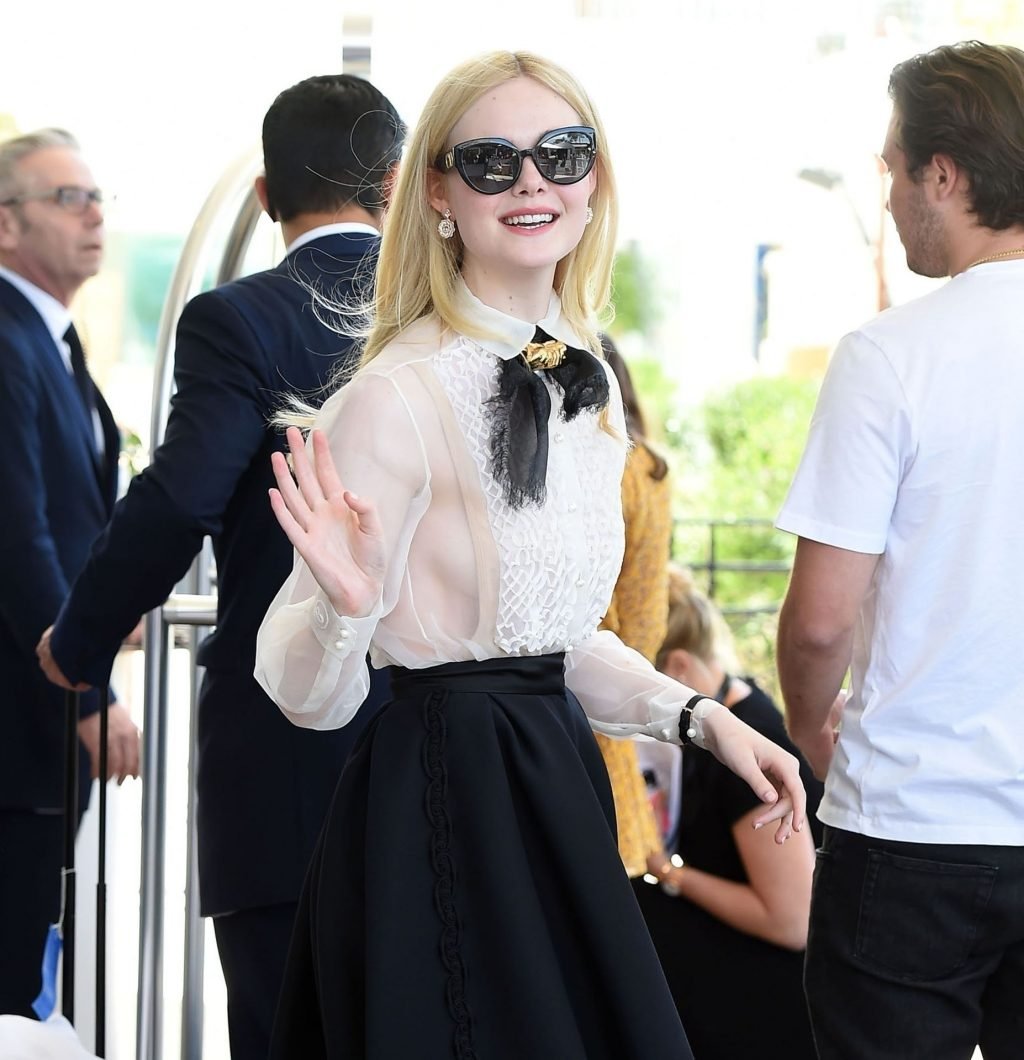 La actriz estadounidense Elle Fanning está sonriendo mientras sale del Hotel Martinez durante el Festival de Cine de Cannes 2019. Luego, Elle fue fotografiada posando en la sesión de fotos.