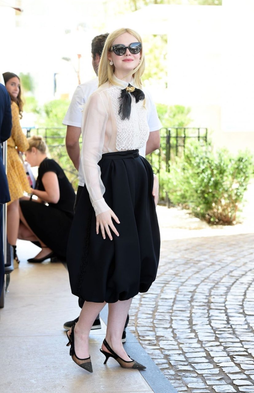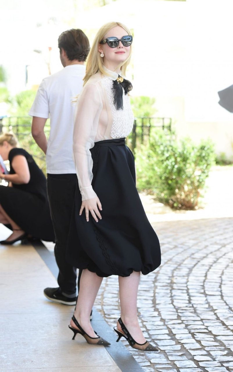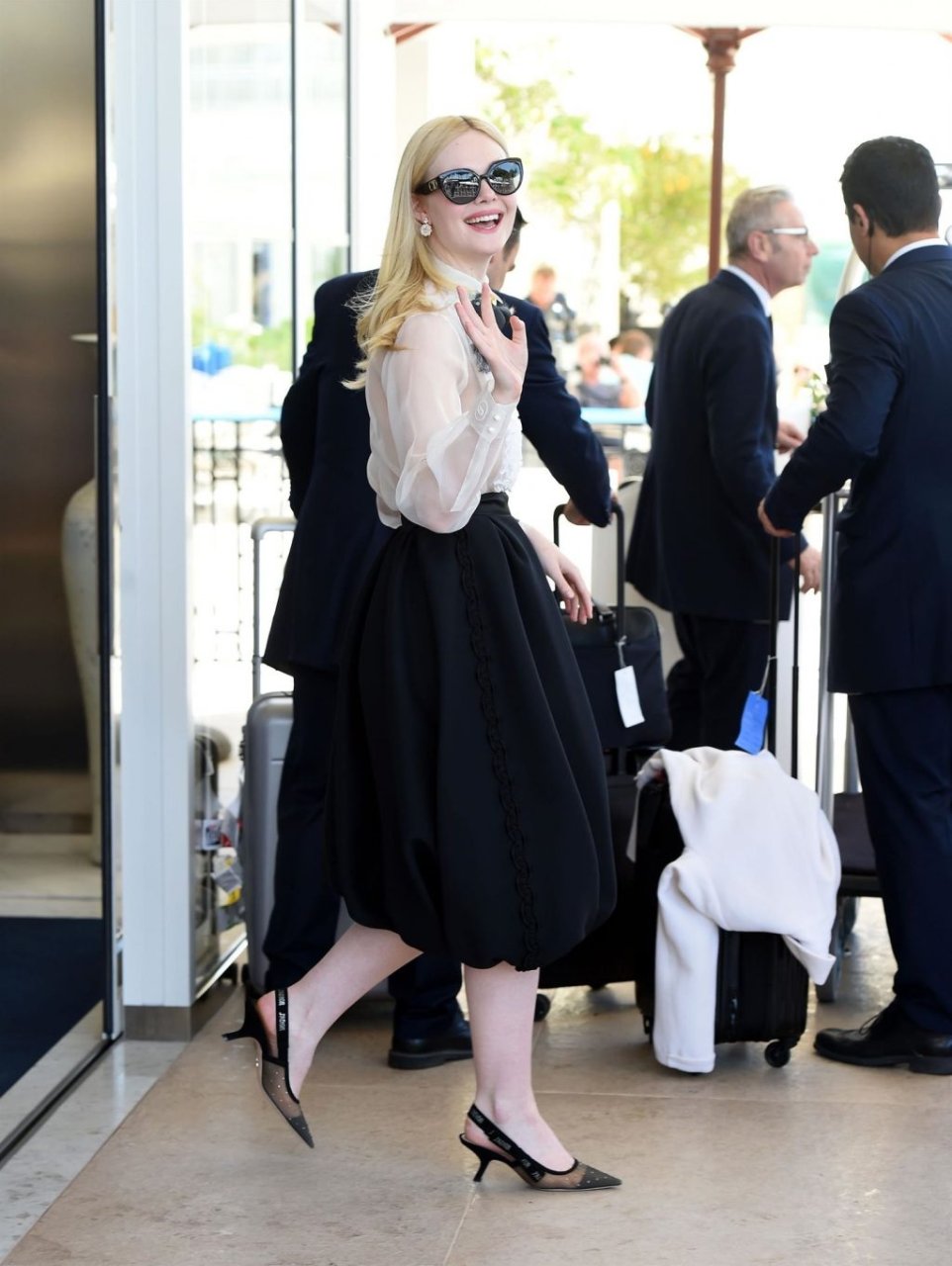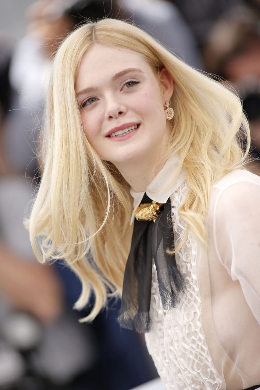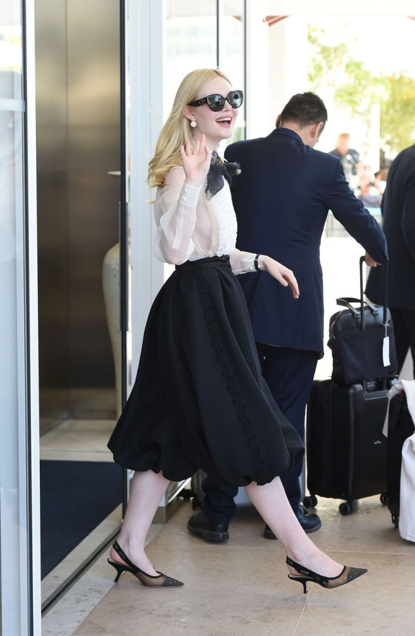 La actriz estadounidense Elle Fanning está sonriendo mientras sale del Hotel Martinez durante el Festival de Cine de Cannes 2019. Luego, Elle fue fotografiada posando en la sesión de fotos.