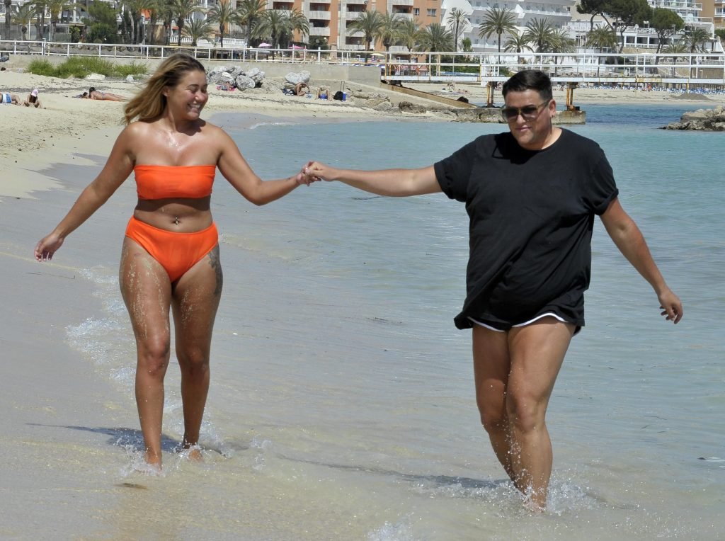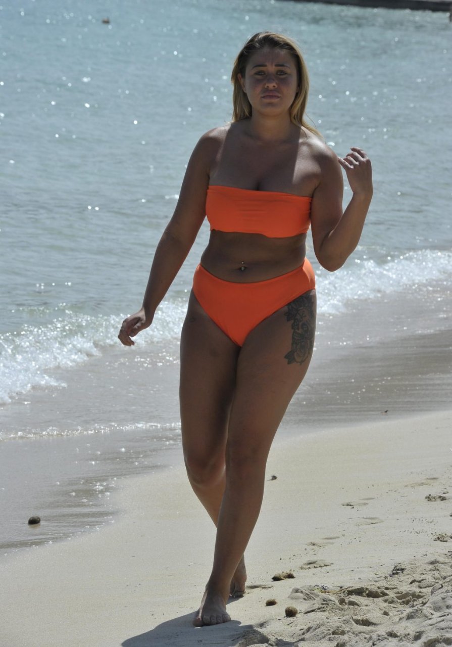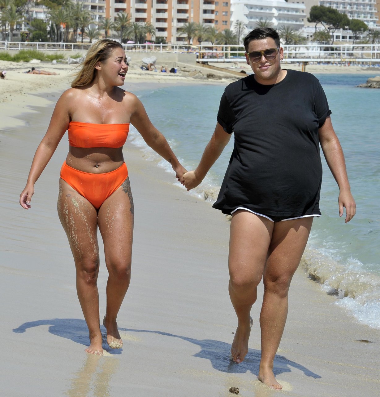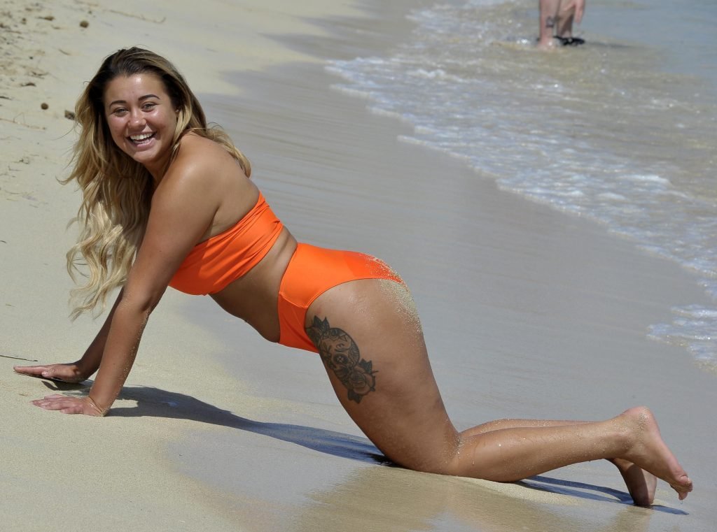Ibiza Weekender y Big Brother Ellie Young muestra un busto exuberante mientras exhibe escote con un bikini naranja brillante, mientras juega en la playa con su compañero de TV David Potts (David Weekender) – Magaluf, España (octubre de 2018).