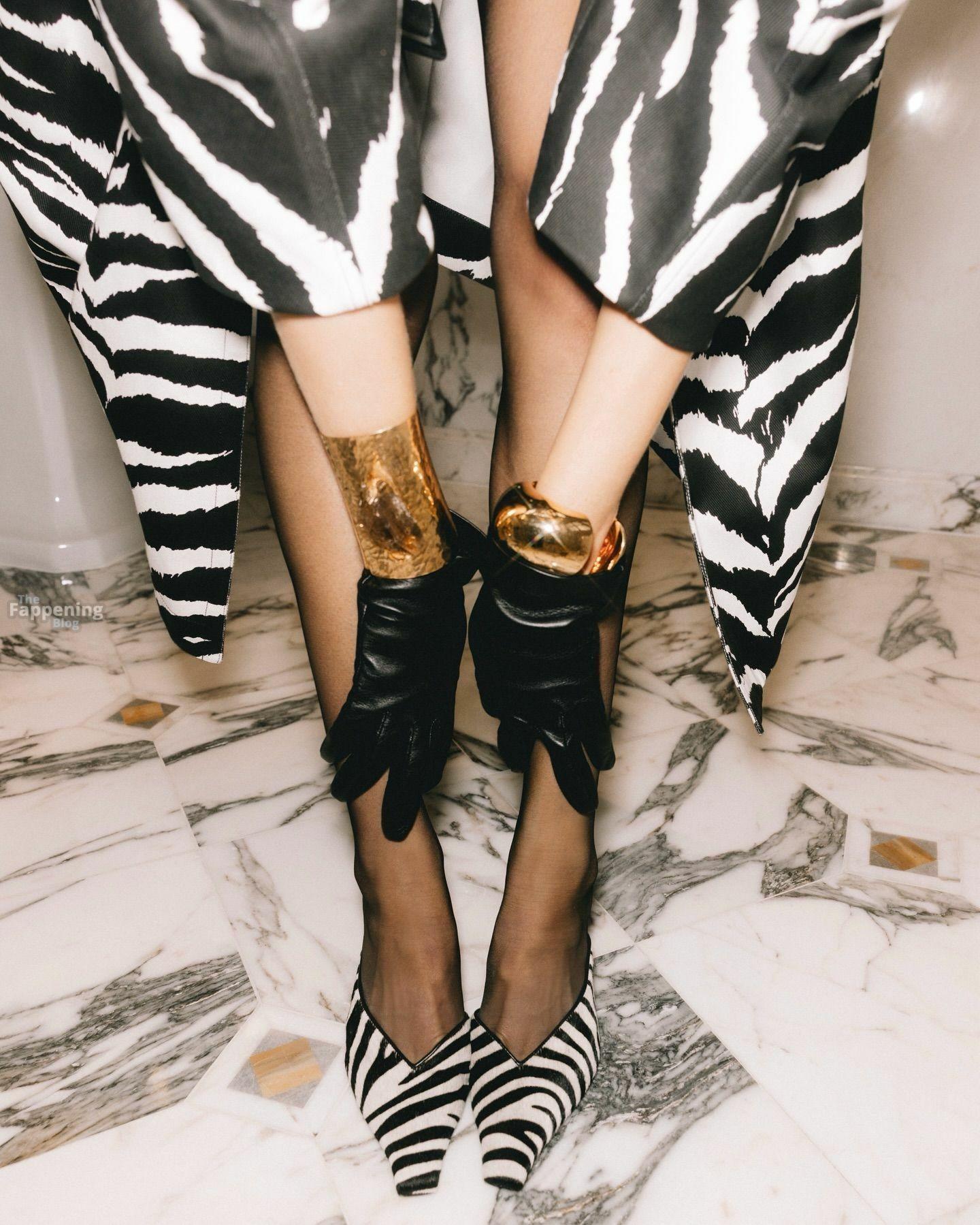 La sueca sexy Elsa Hosk presume sus increíbles y sexys piernas en medias transparentes y un abrigo de cebra para la colaboración de HELSA & GIABORGHINI.