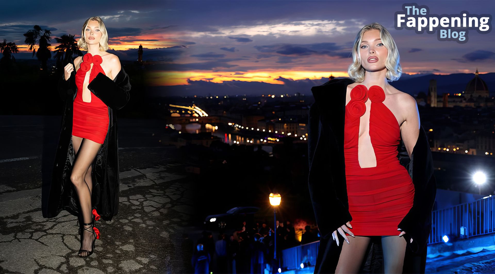 ¡Míralo! Elsa Hosk se roba totalmente el protagonismo en el evento de moda en Florencia, luciendo un mini vestido rojo fuego y medias negras. ¡Está a punto de dejarte sin aliento con su impresionante apariencia!