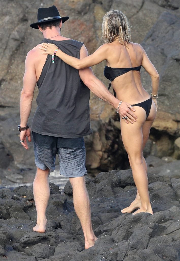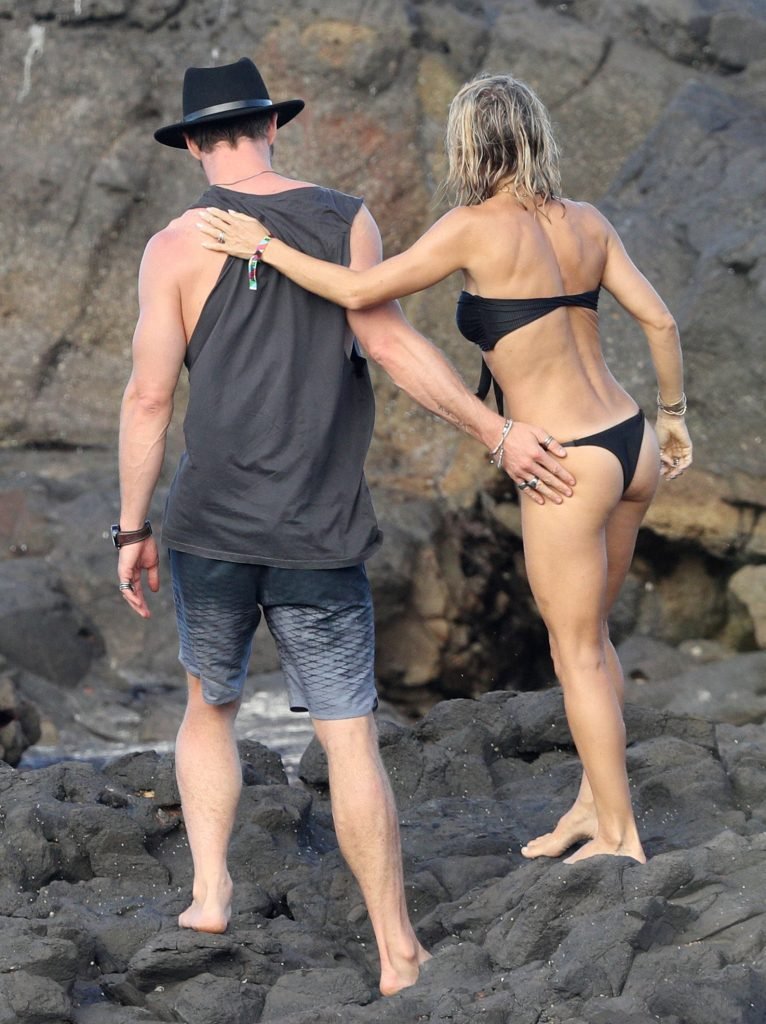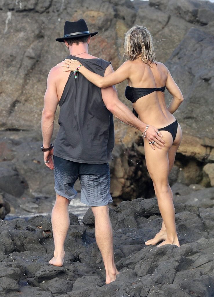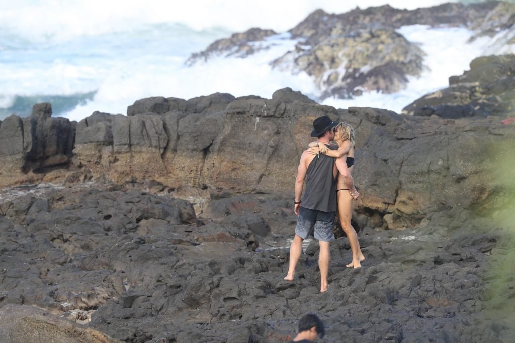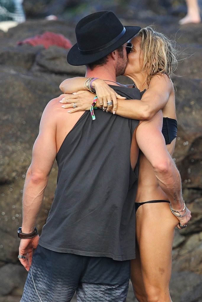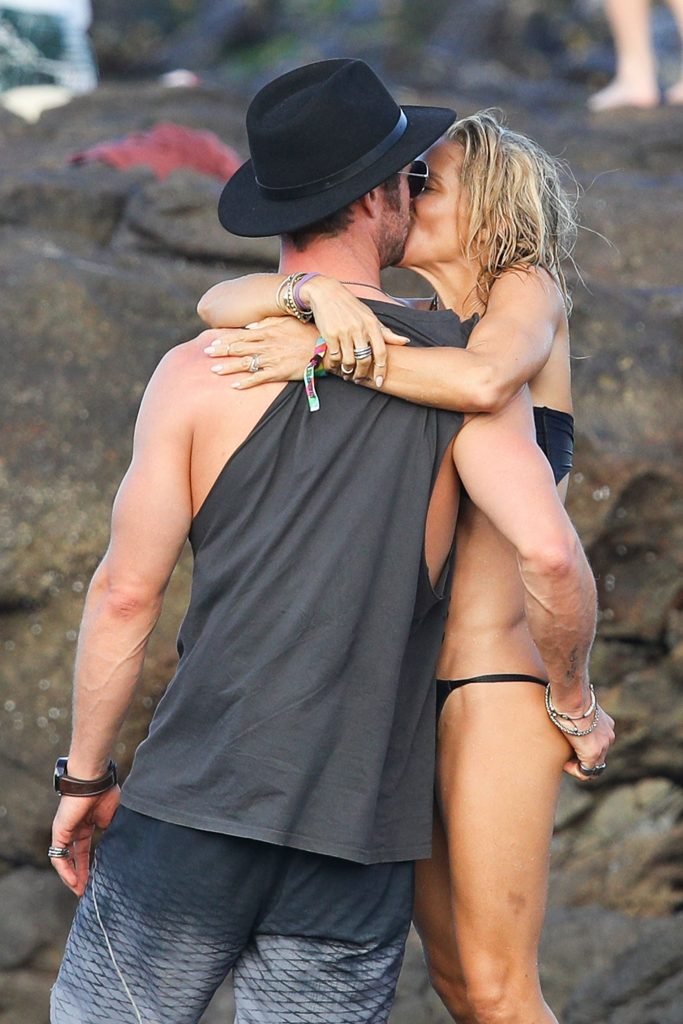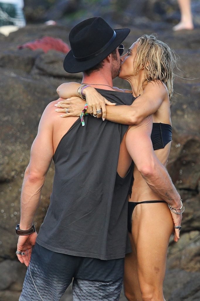 Los actores Chris Hemsworth y Matt Damon toman unas cervezas en la playa con sus esposas Elsa Lafuente Medianu y Luciana Barroso, y amigos en Byron Bay, 04/02/2018. Se vio a Chris dando un apretón cariñoso en el trasero de su esposa. Elsa Pataky es una actriz española (Fast & Furious 8), modelo y productora. Edad – 41 años.