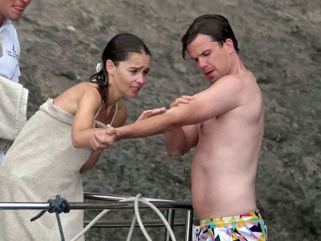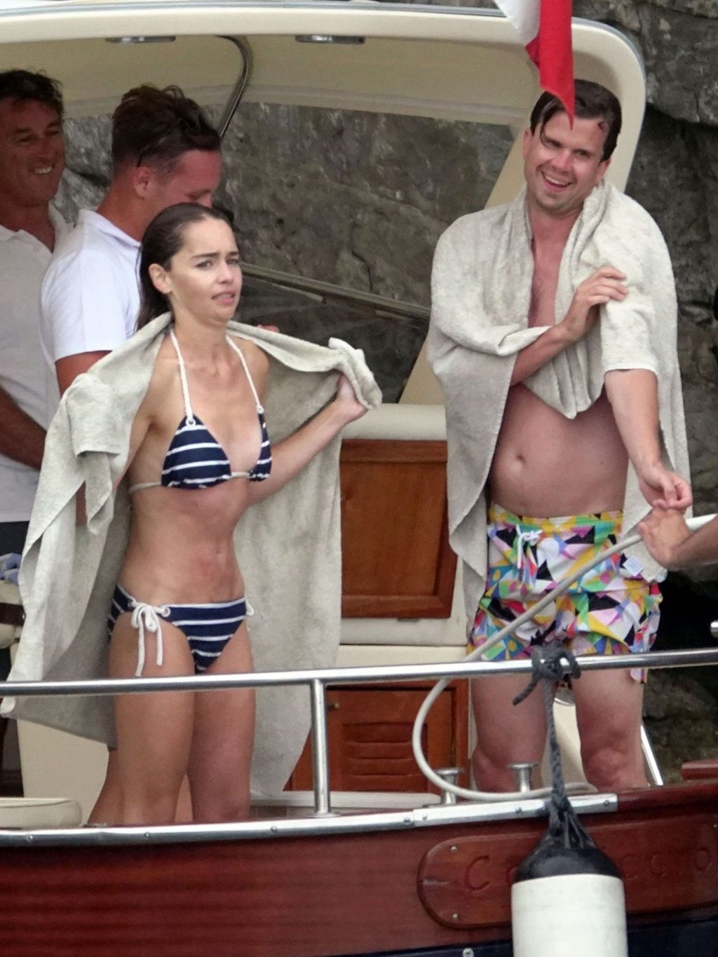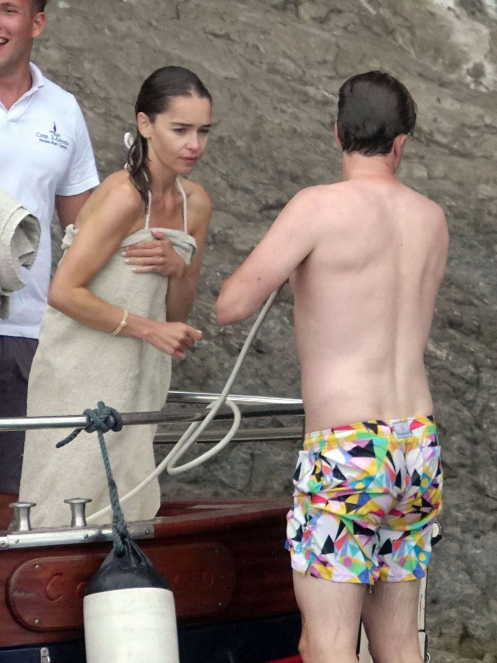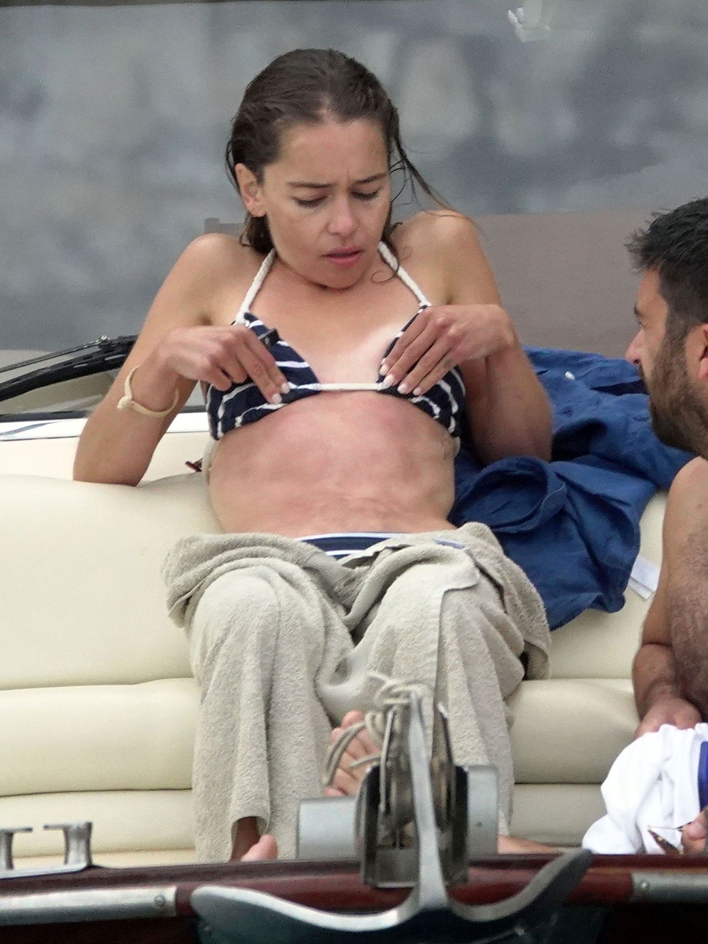 “Game of Thrones” actriz Emilia Clarke es fotografiada con amigos mientras disfruta de sus vacaciones de verano en Italia, 08/07/2020.