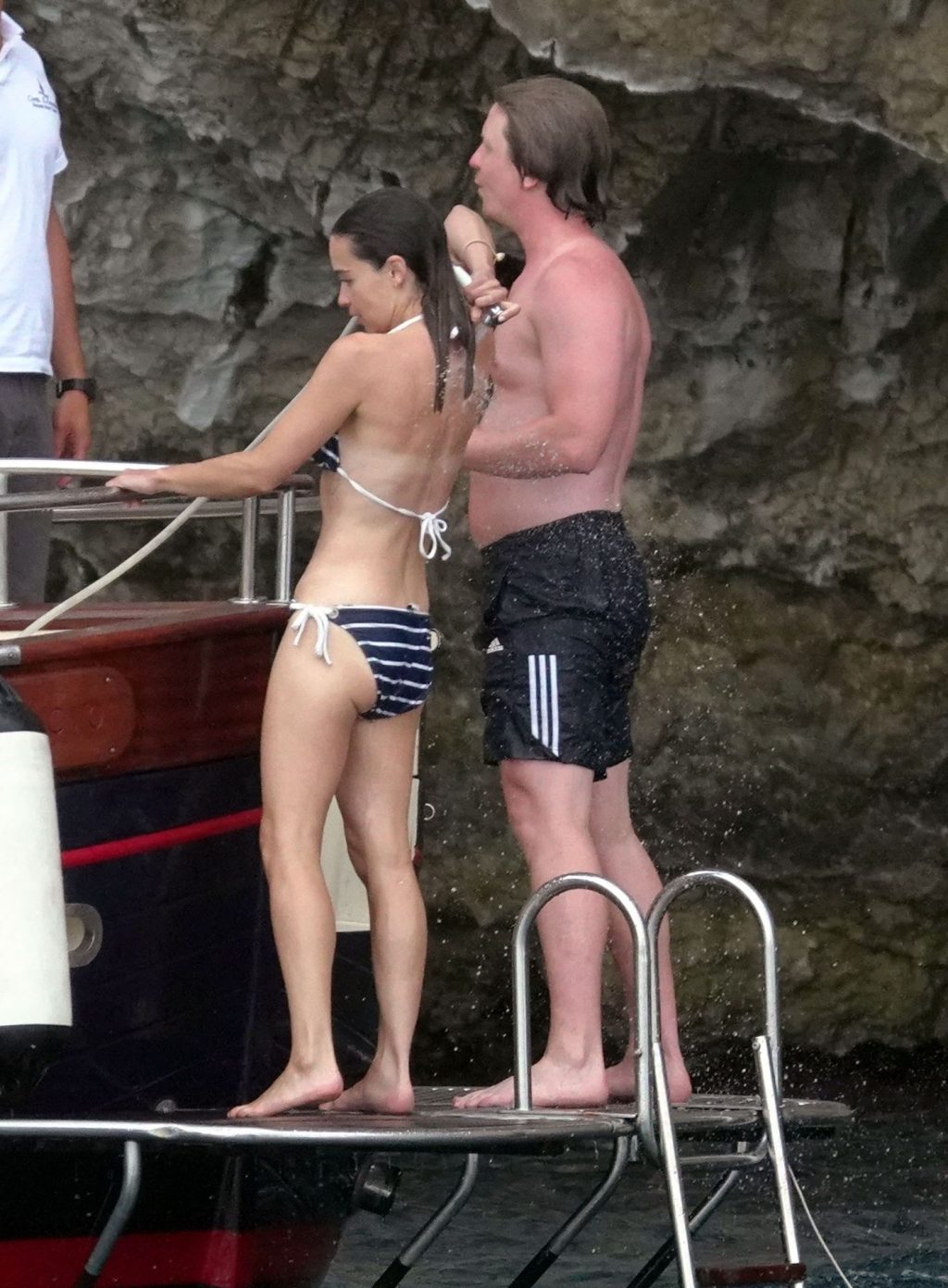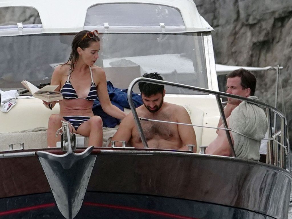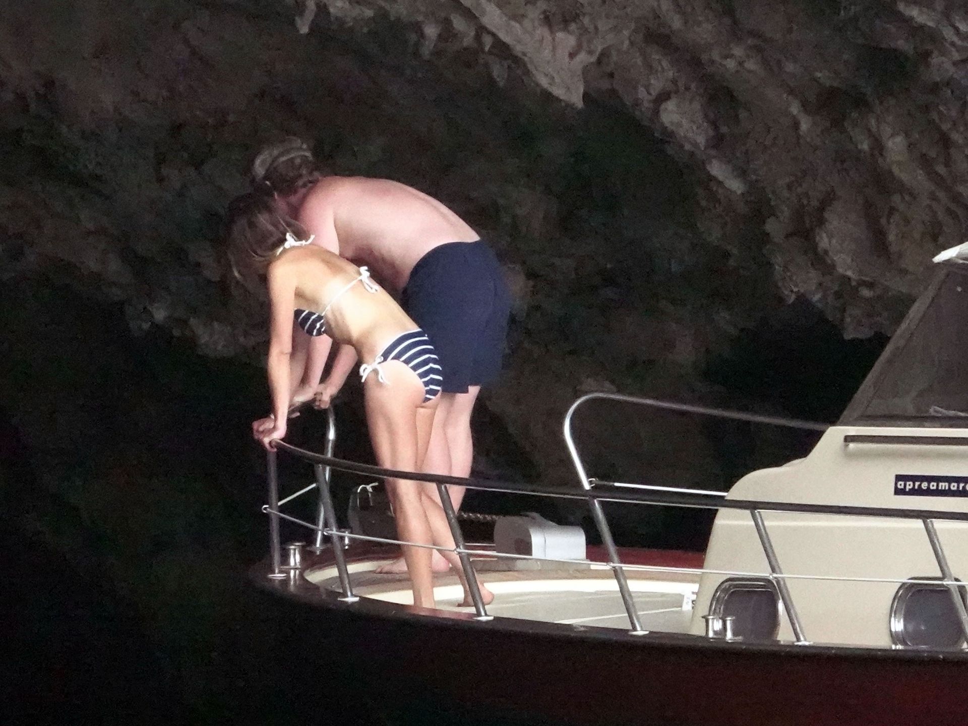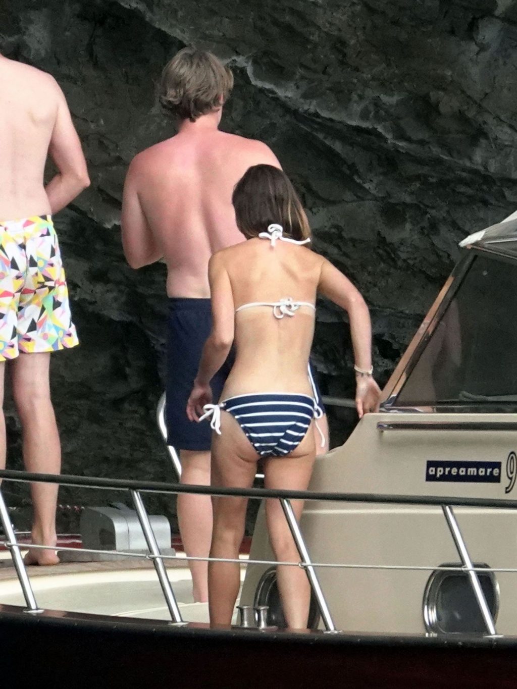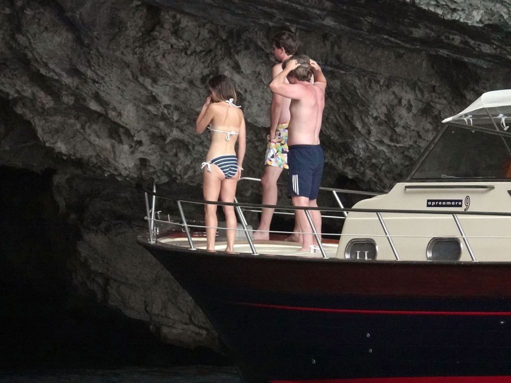 La actriz inglesa fue vista disfrutando de un paseo en barco con sus amigos masculinos y se dio un baño en bikini a rayas mientras el grupo visitaba algunas cuevas durante su paseo en barco disfrutando del verano en Italia!