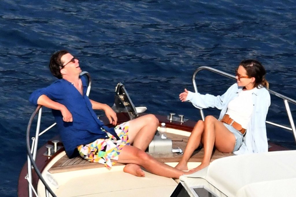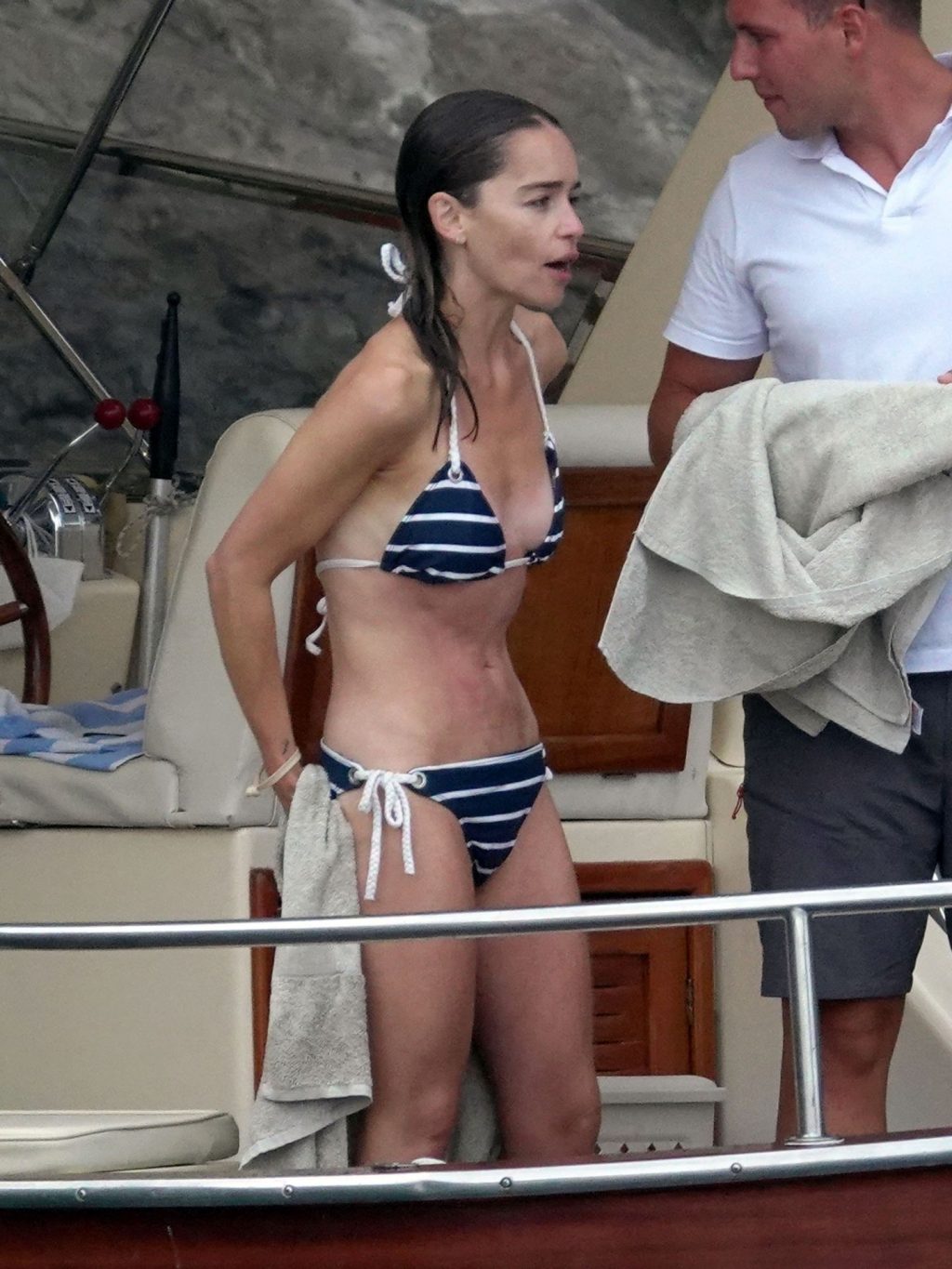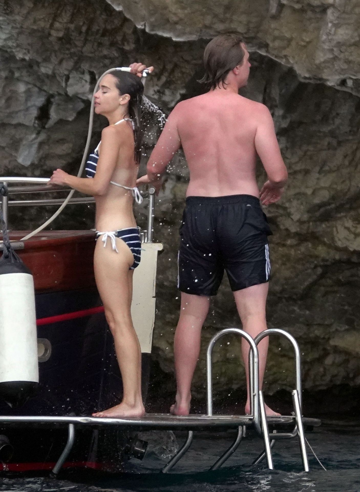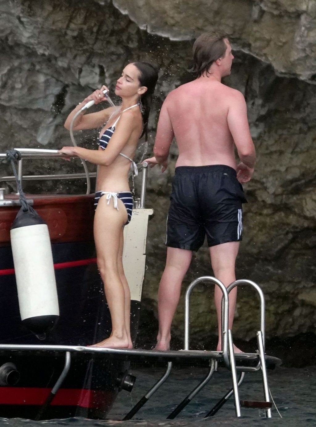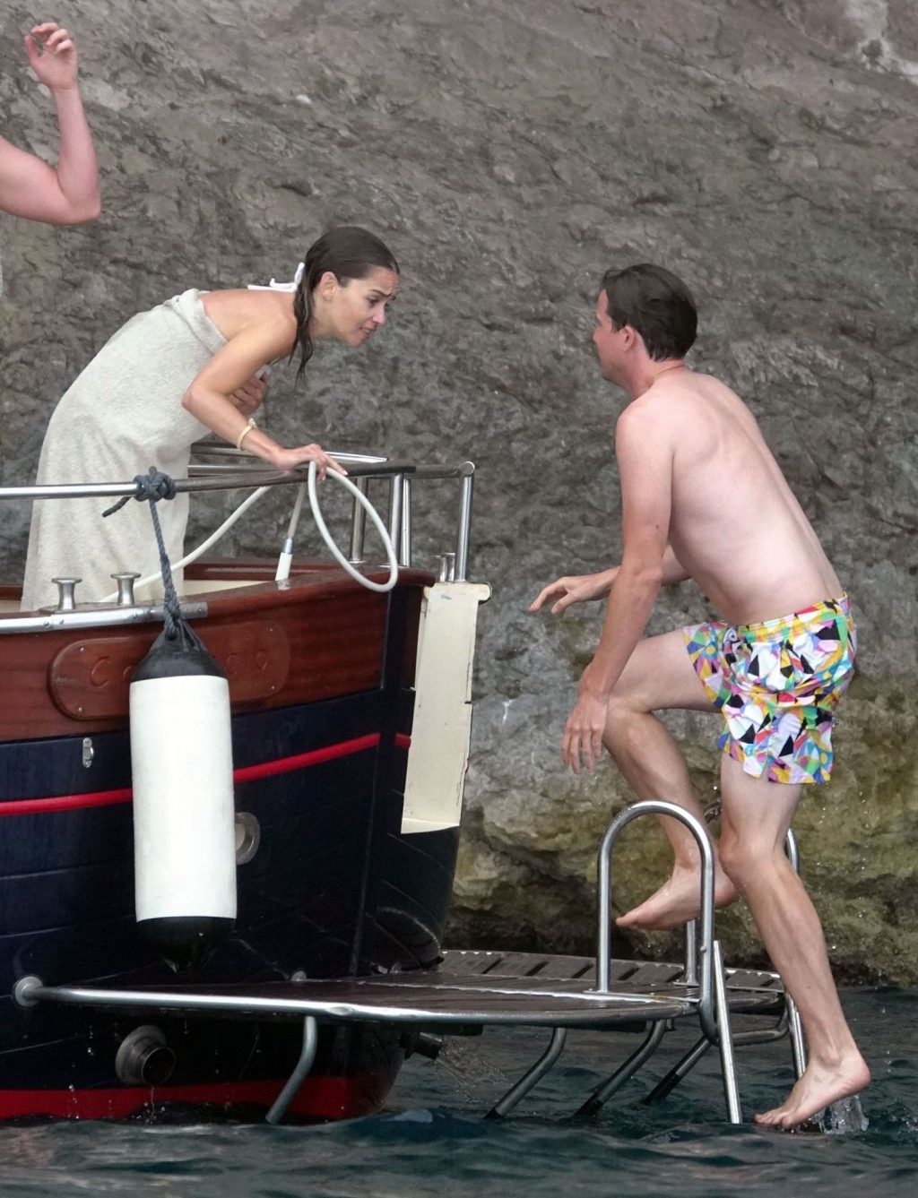 La actriz inglesa fue vista disfrutando de un paseo en barco con sus amigos masculinos y se dio un baño en bikini a rayas mientras el grupo visitaba algunas cuevas durante su paseo en barco disfrutando del verano en Italia!