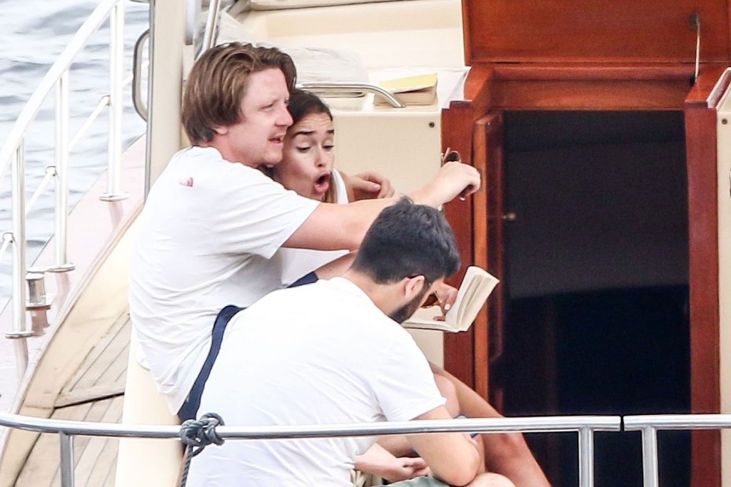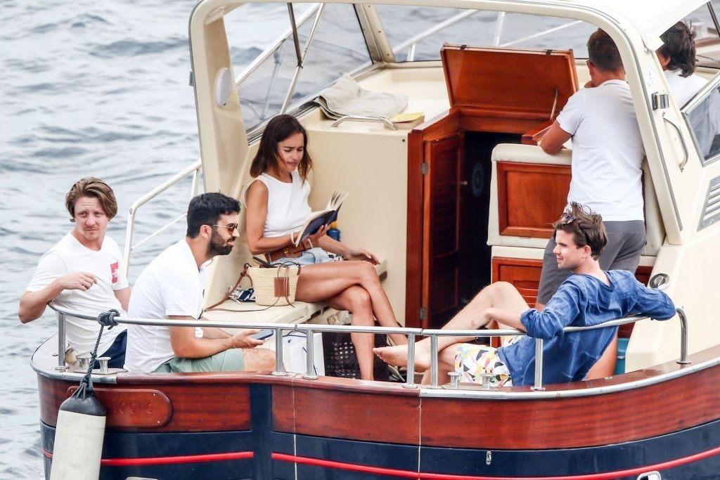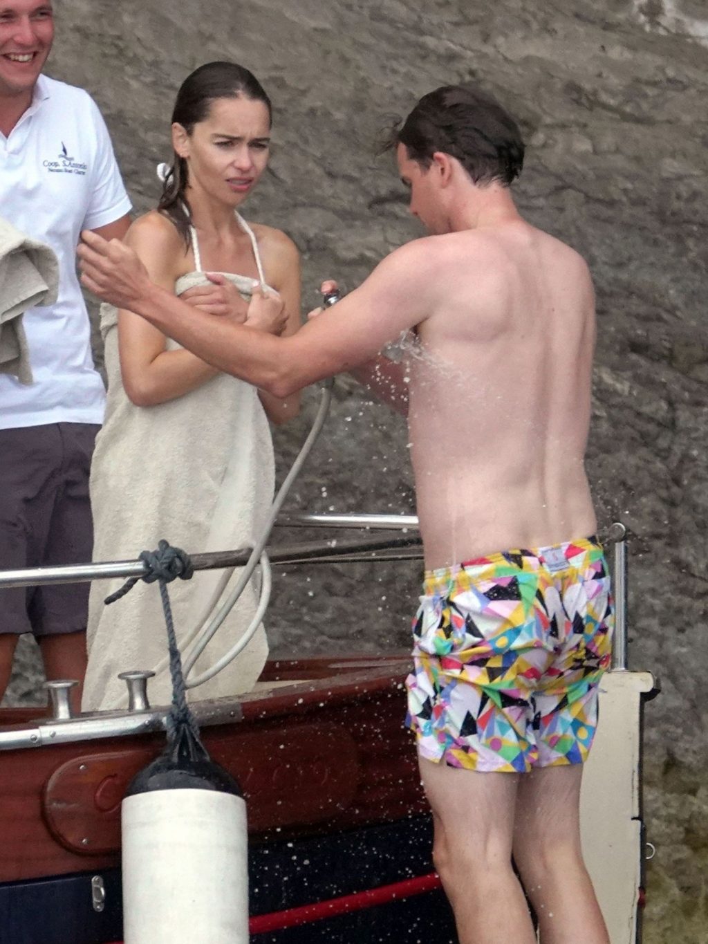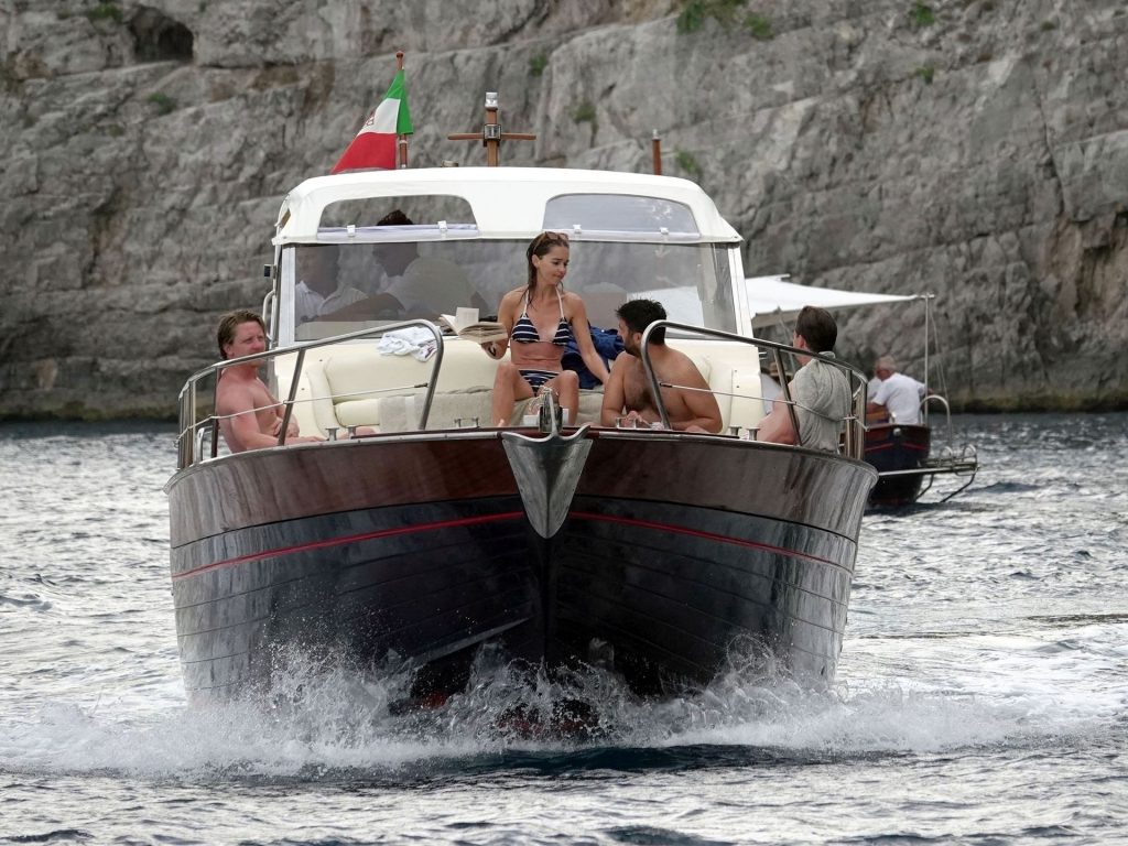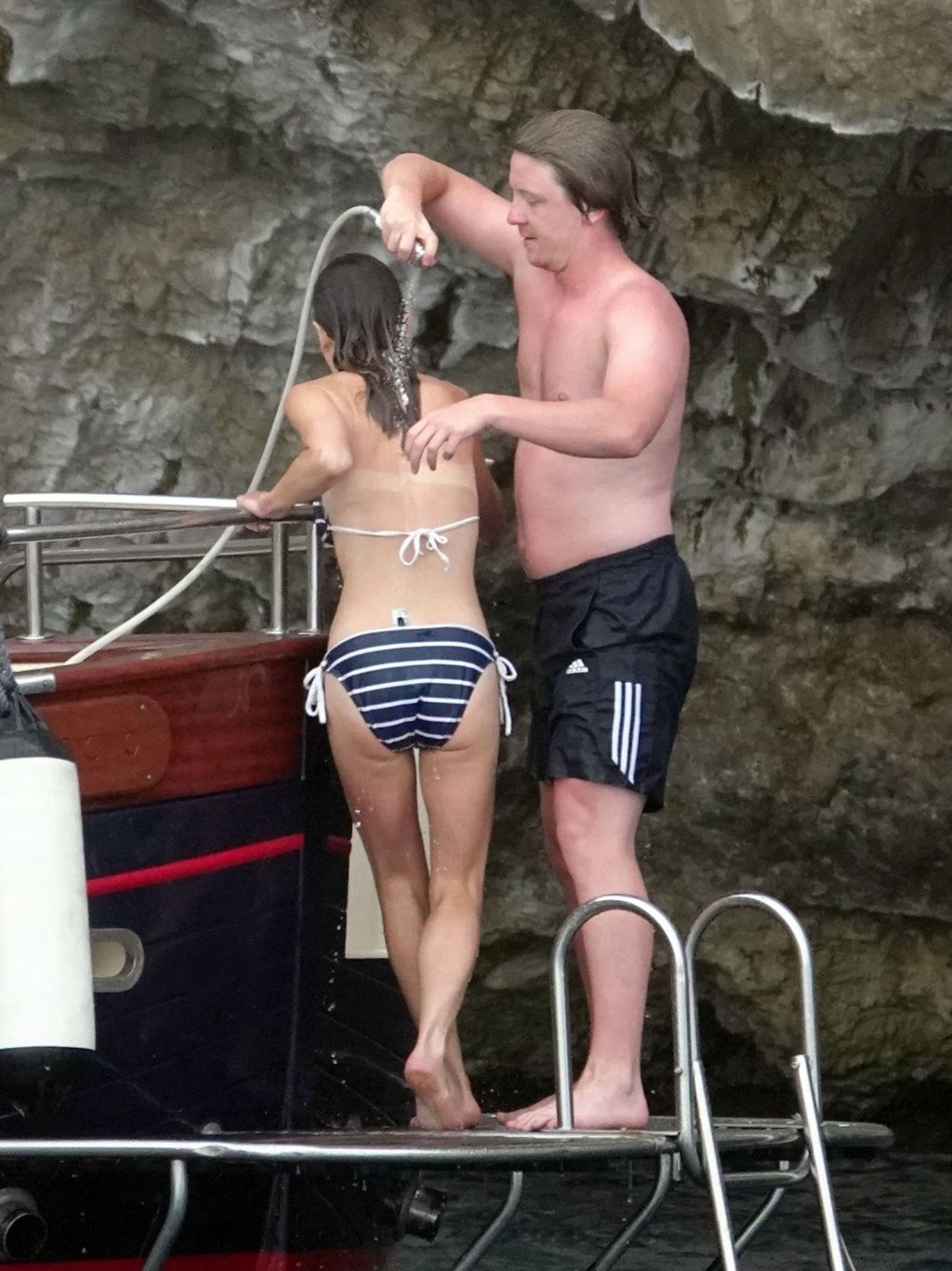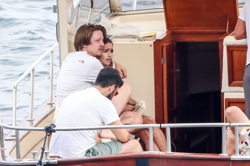 La actriz inglesa fue vista disfrutando de un paseo en barco con sus amigos masculinos y se dio un baño en bikini a rayas mientras el grupo visitaba algunas cuevas durante su paseo en barco disfrutando del verano en Italia!
