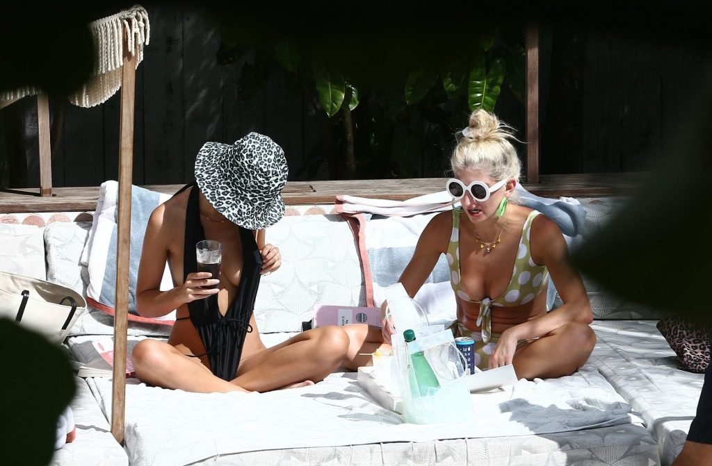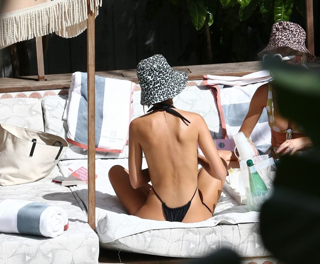 Emily Ratajkowski no deja mucho a la imaginación mientras se da un chapuzón con un monokini muy revelador. Se ve a Emily con una amiga junto a la piscina durante sus vacaciones en Miami. Emily y su amiga lucen sombreros tipo bucket con estampado de leopardo de la línea de ropa de Emily, Inamorata.
