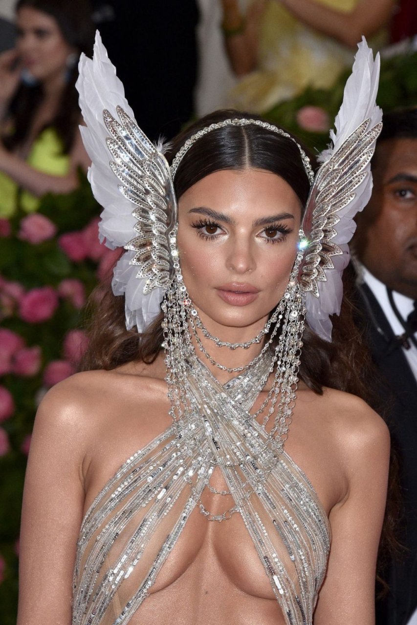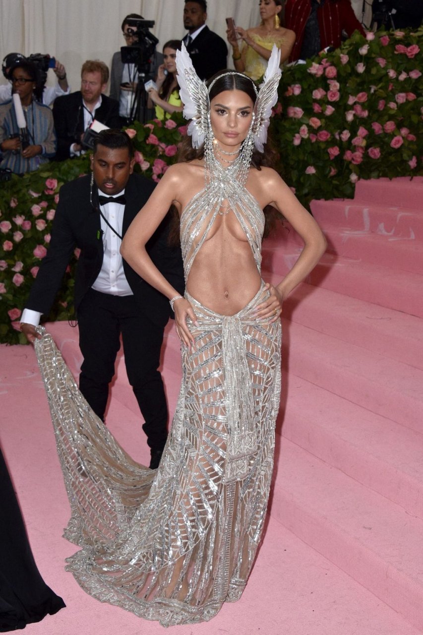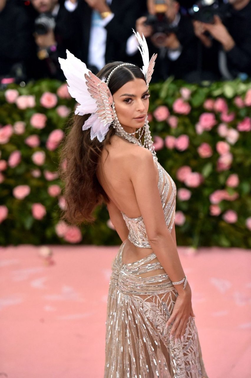 Model/modelo y actriz Emily Ratajkowski muestra su impresionante atuendo en la MET Gala 2019 en Nueva York, 05/05/2019. Emily apareció en la alfombra rosa con un vestido revelador, cubriendo solo lo más interesante. La MET Gala es una fiesta de disfraces, por lo que la modelo llevaba orejas de elfo.