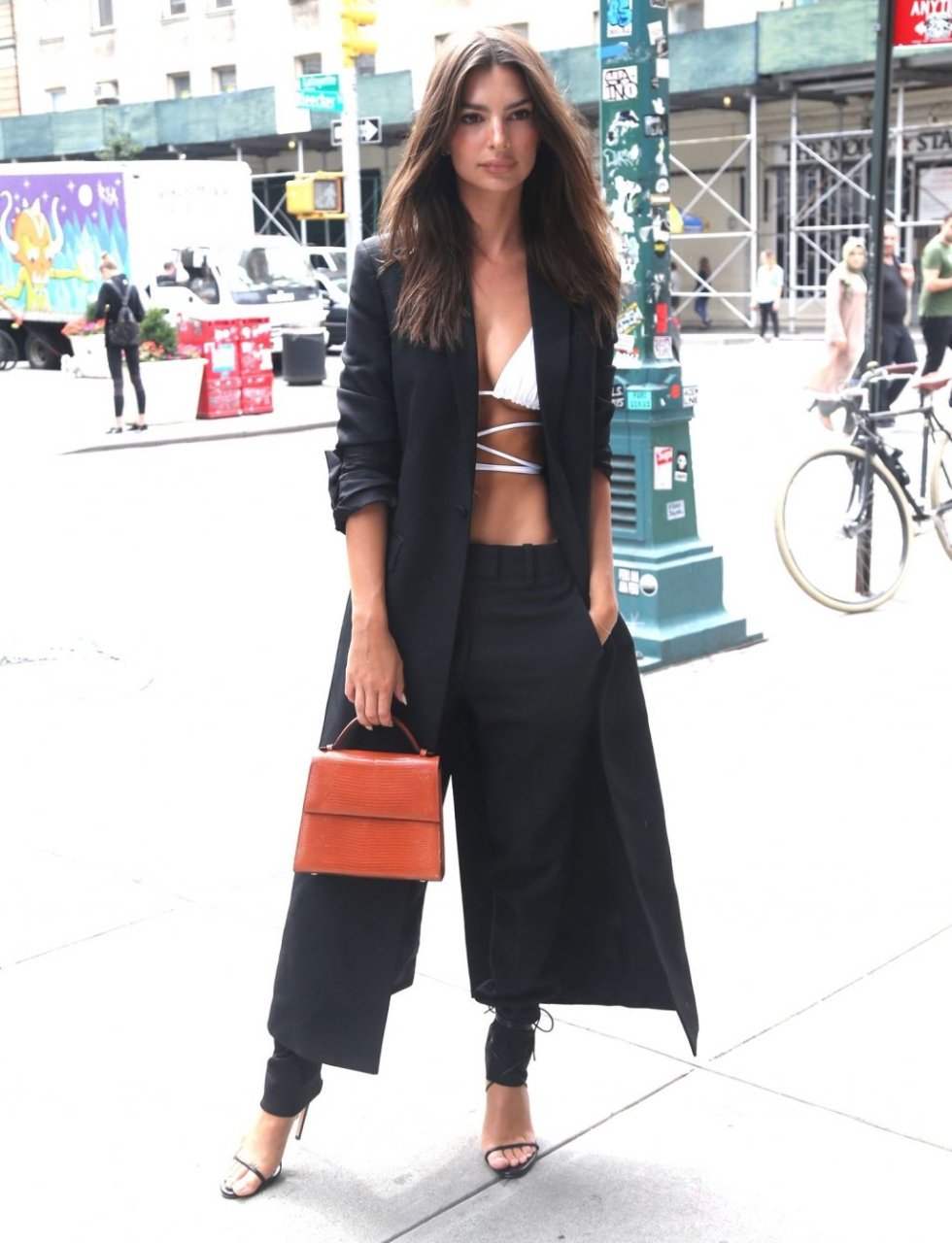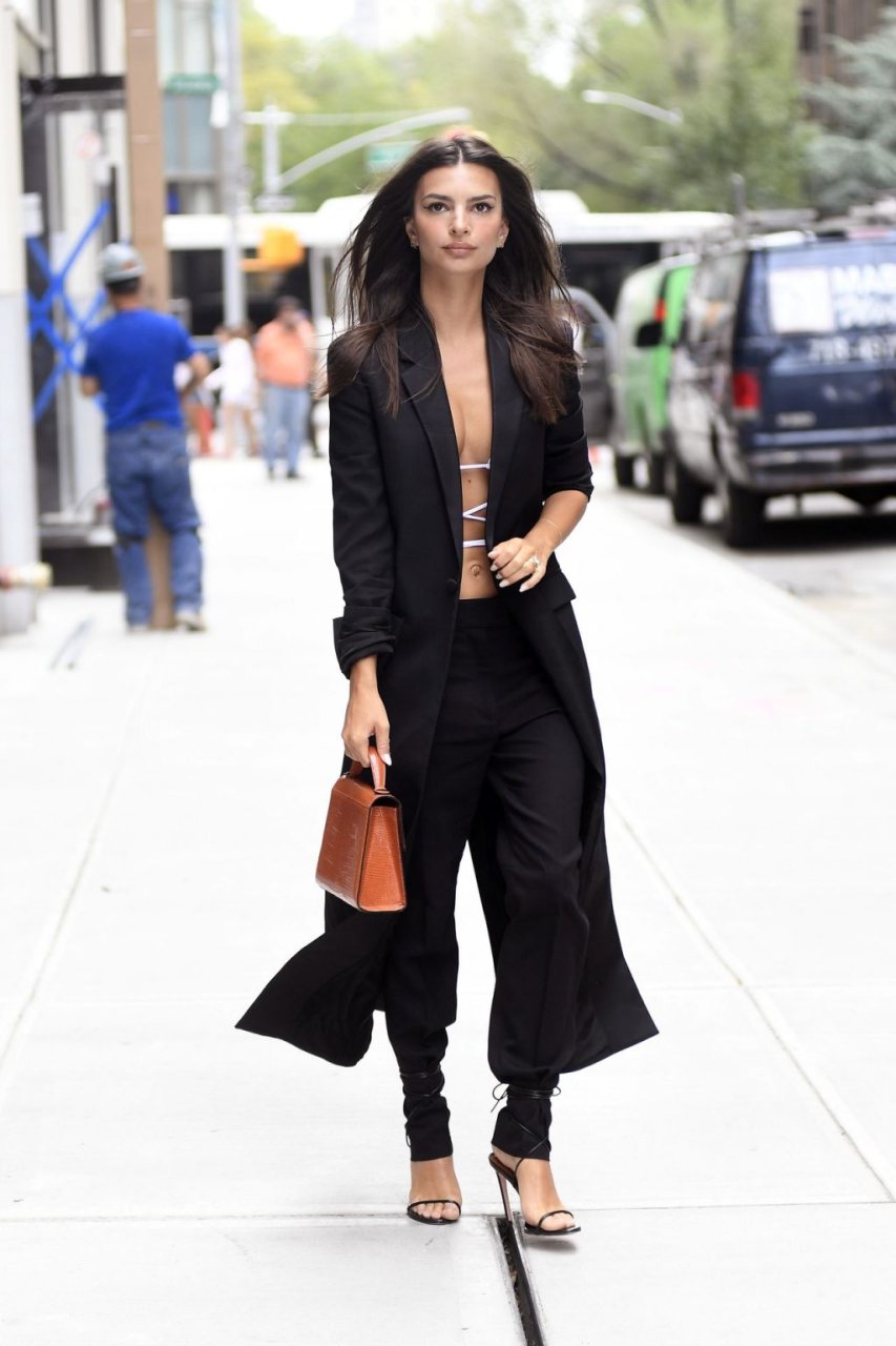 Model/modelo y actriz Emily Ratajkowski luce hoy especialmente elegante con una gabardina larga sobre un top casi inexistente que muestra su abdomen, combinada con pantalones negros y tacones durante un paseo por Nueva York, 05/09/2019.