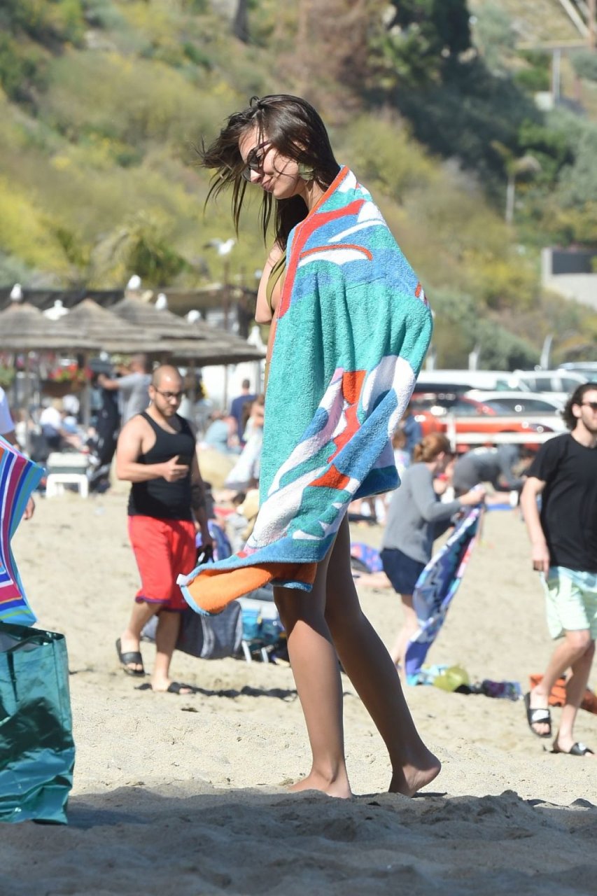 Emily Ratajkowski llega a la playa con su amiga en Malibu, 23/04/2019. La modelo de 27 años llevaba un bikini verde de su marca Inamorata. El dúo pasó 3 horas tomando el sol y en un momento, un joven se acercó solo para charlar con Emily y su amiga.