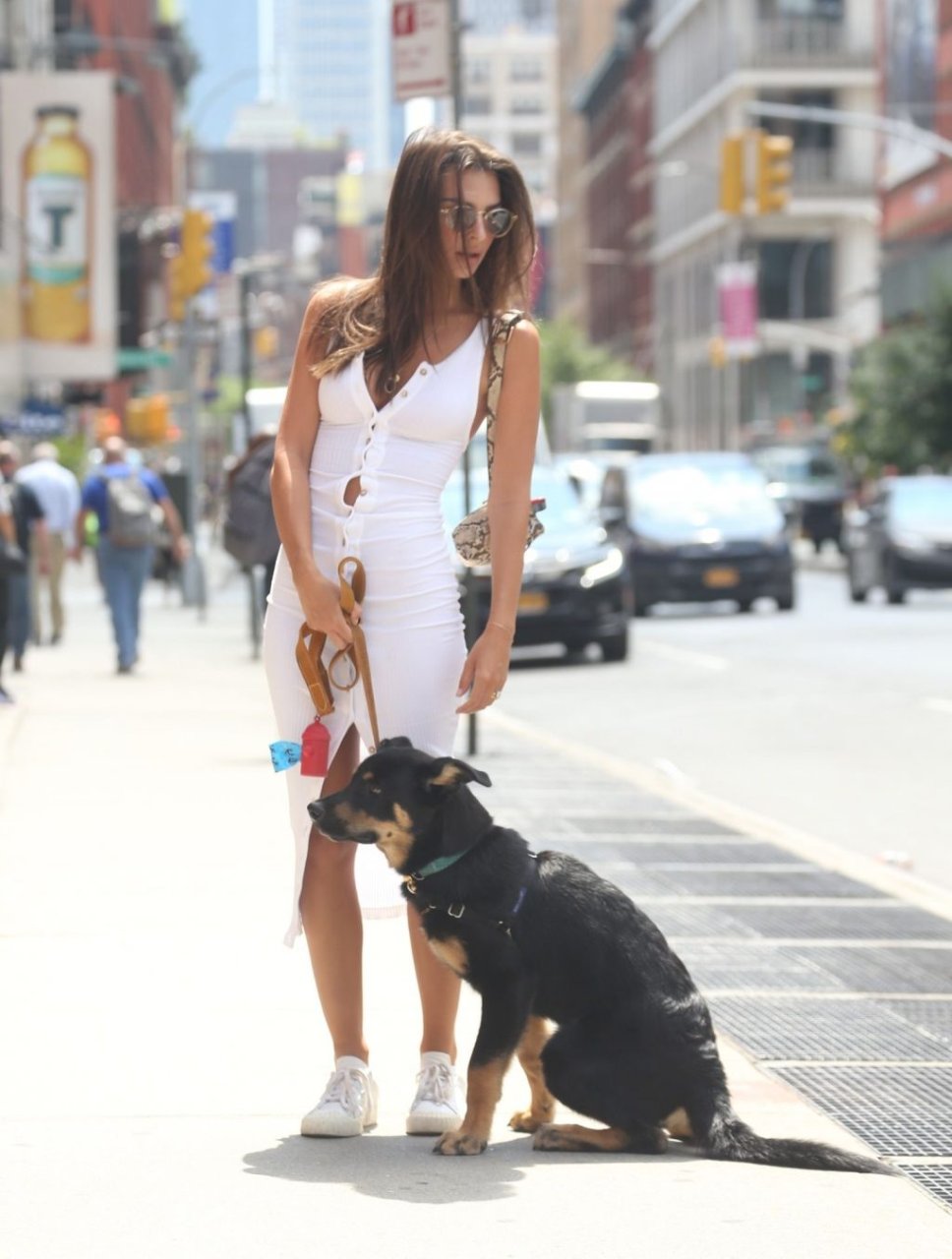 Model Emily Ratajkowski fue vista con un vestido blanco ajustado llevando a su cachorro, Colombo, a un paseo por el parque para perros en Washington Square Park, 01/08/2019.