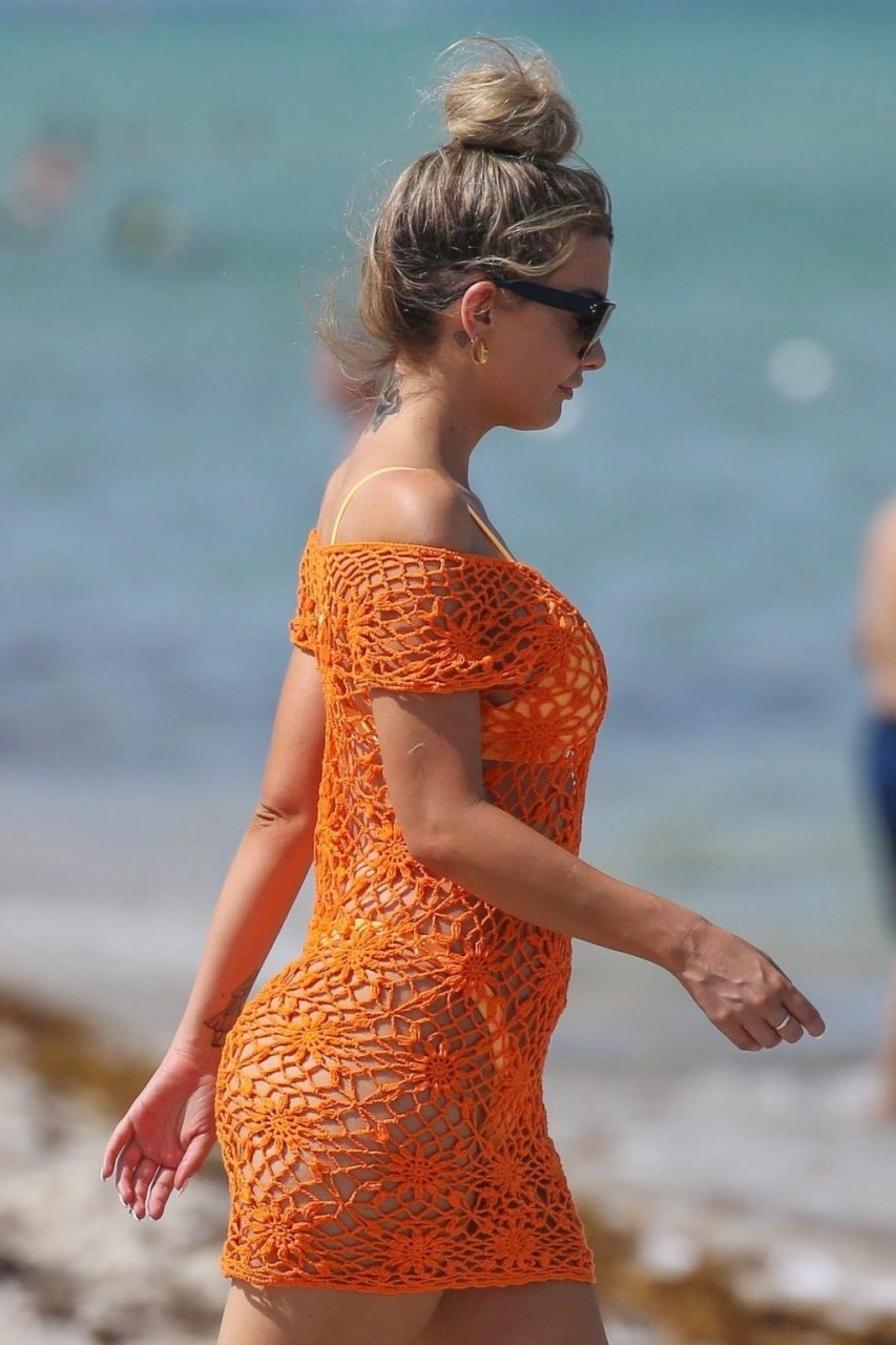La modelo australiana Emily Sears deslumbra con un vestido de crochet sin hombros y un diminuto bikini en la playa de Miami, 08/09/2018.