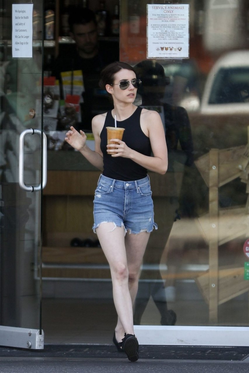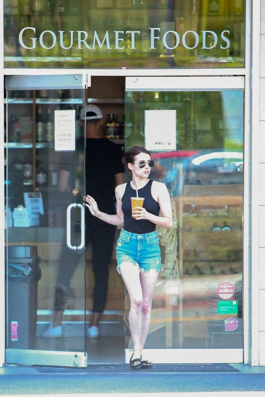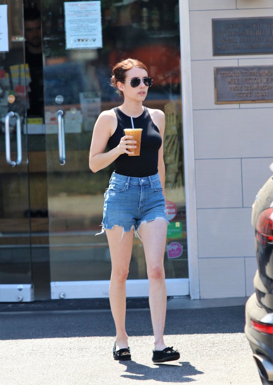 Emma Roberts combate el calor con un café helado mientras hace recados en Los Feliz, vistiendo shorts de mezclilla con una camiseta sin mangas negra y mocasines a juego, 25/07/2019.