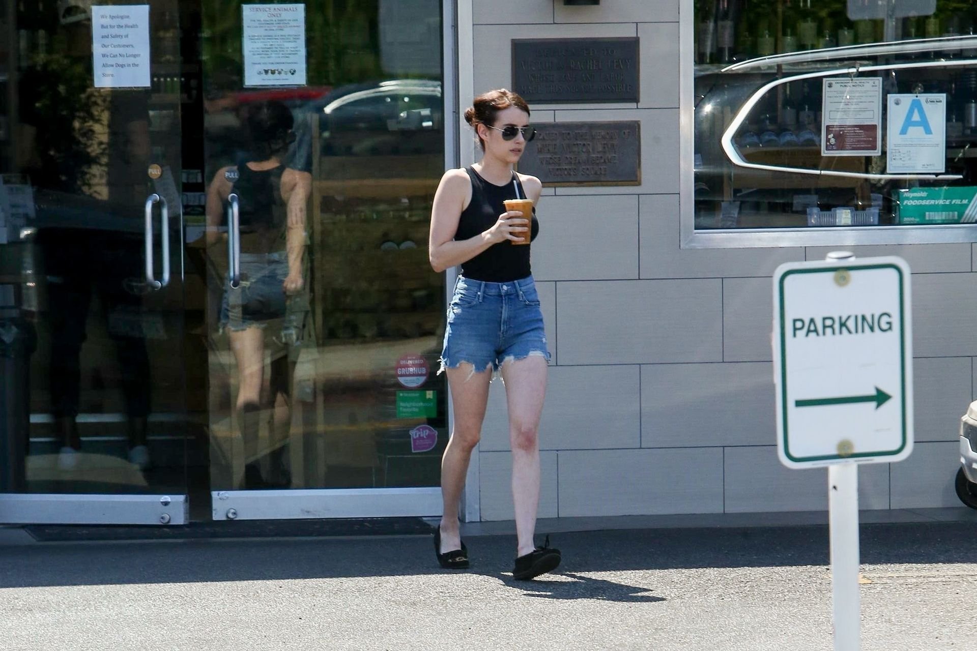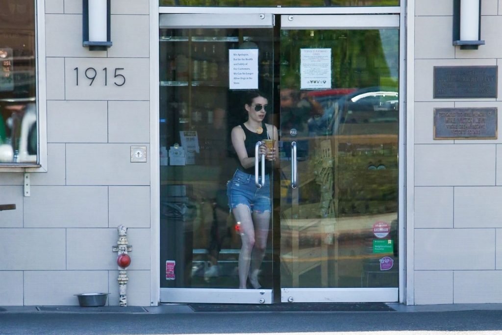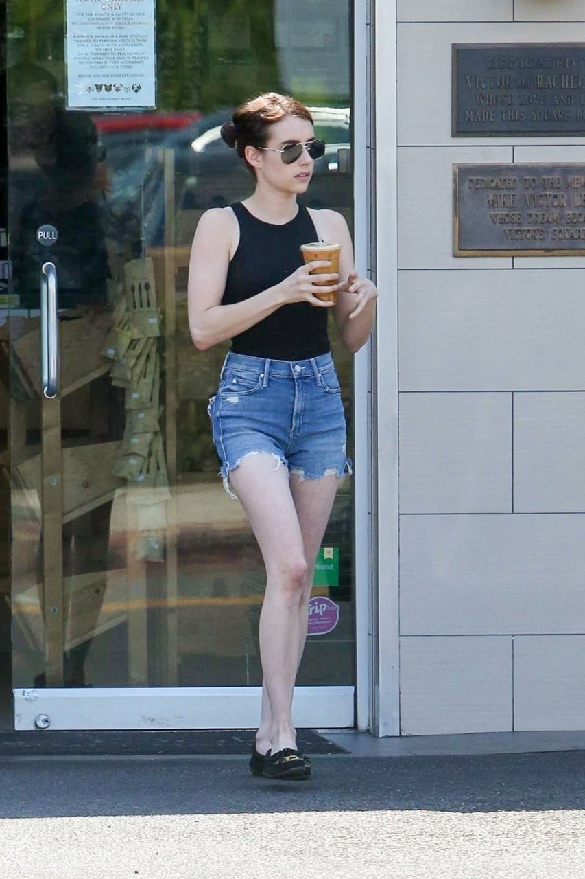 Emma Roberts combate el calor con un café helado mientras hace recados en Los Feliz, vistiendo shorts de mezclilla con una camiseta sin mangas negra y mocasines a juego, 25/07/2019.