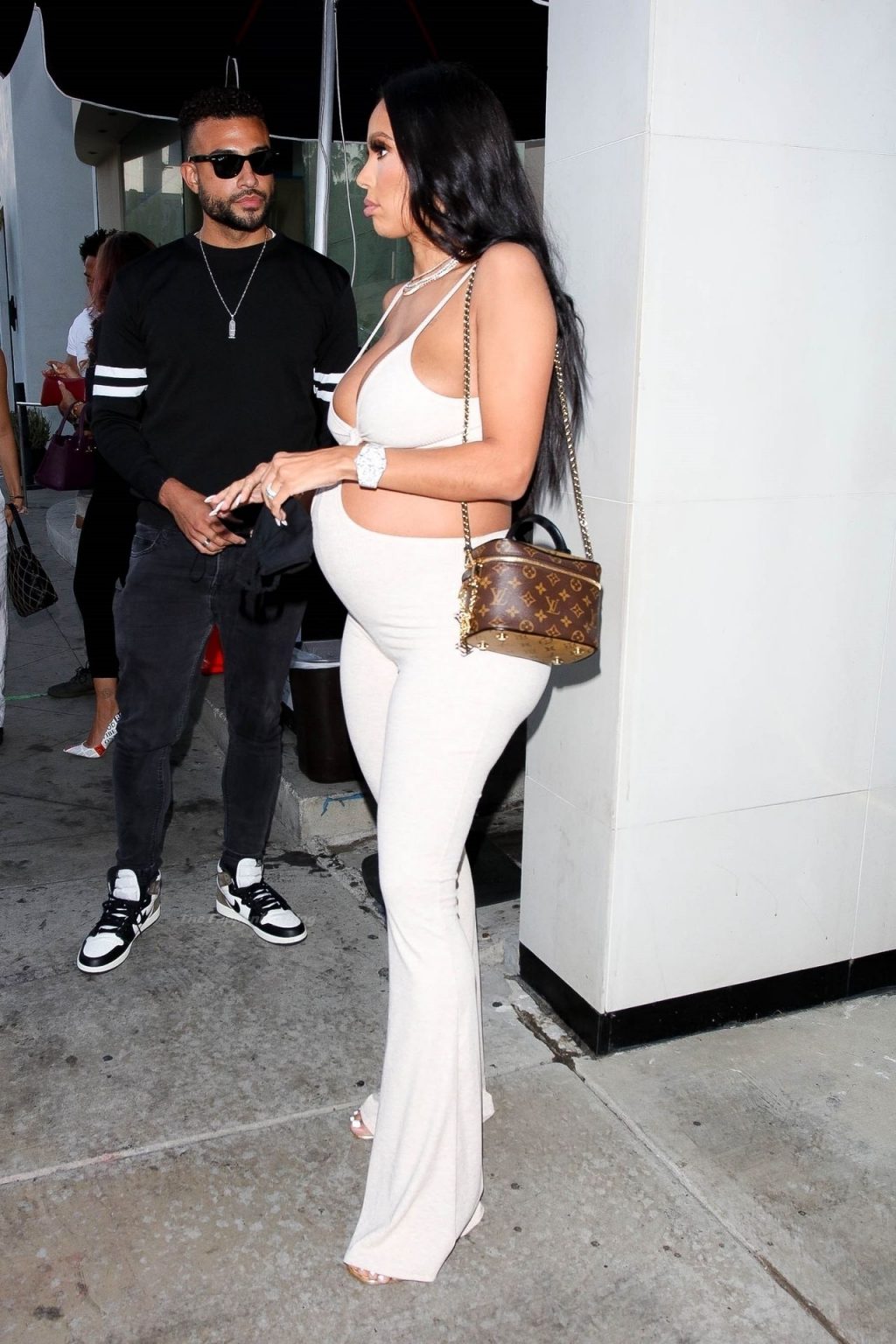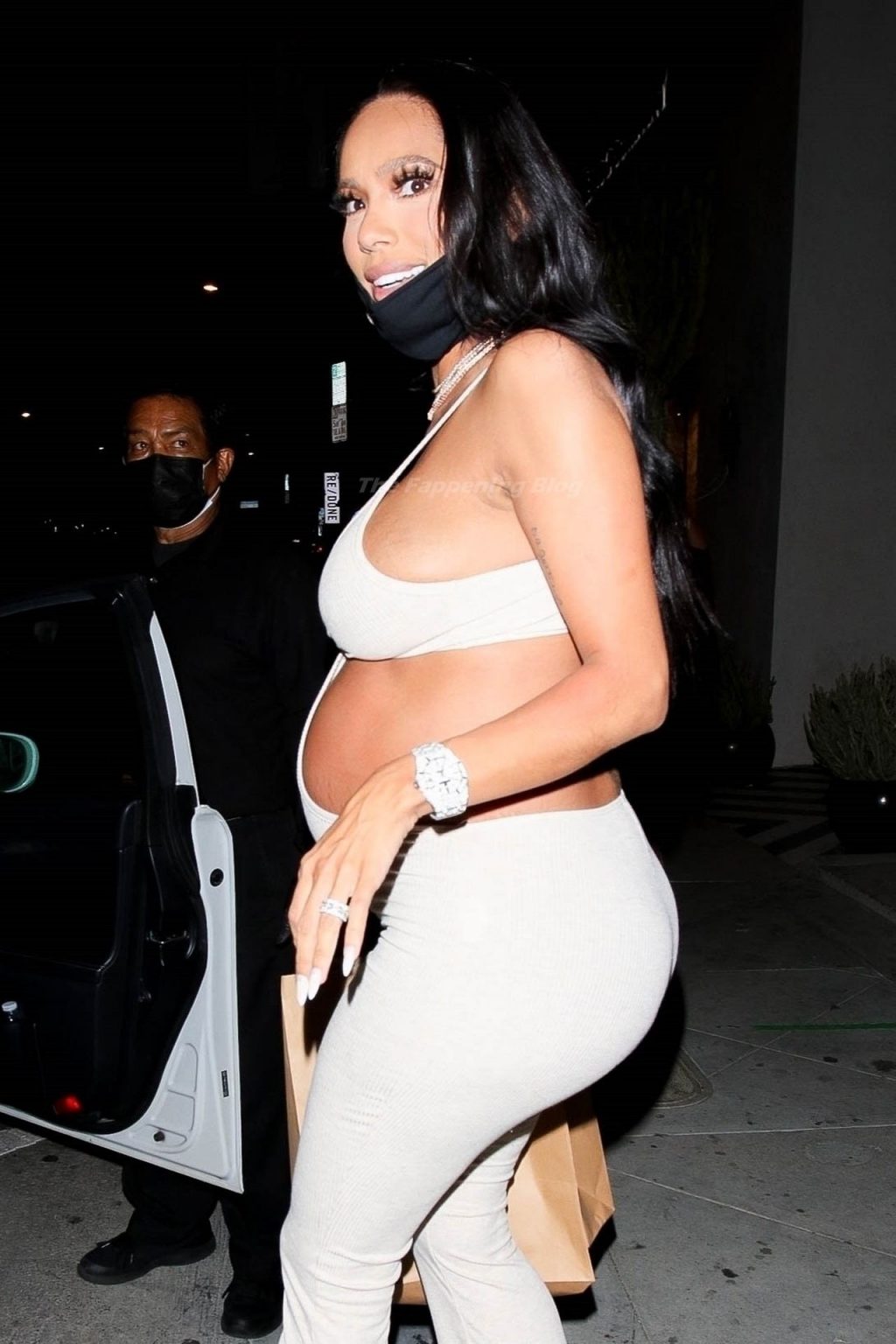 Una Erica Mena muy embarazada se muestra presumiendo su creciente barriga de bebé con un mono blanco revelador mientras llega a Catch LA en West Hollywood, 09/05/2021.