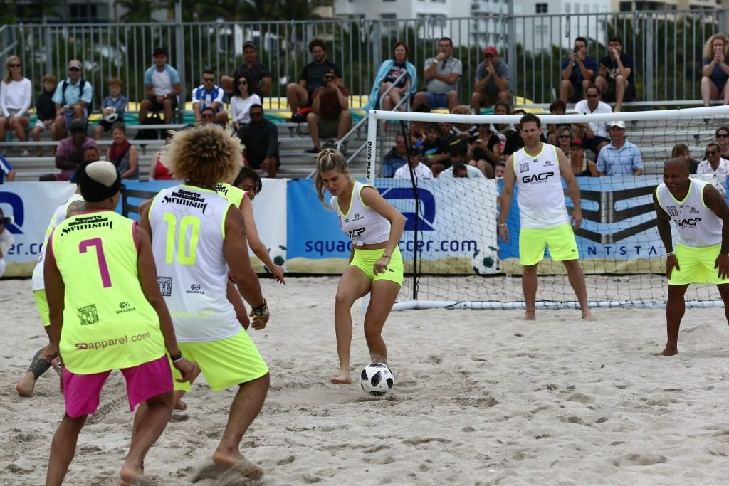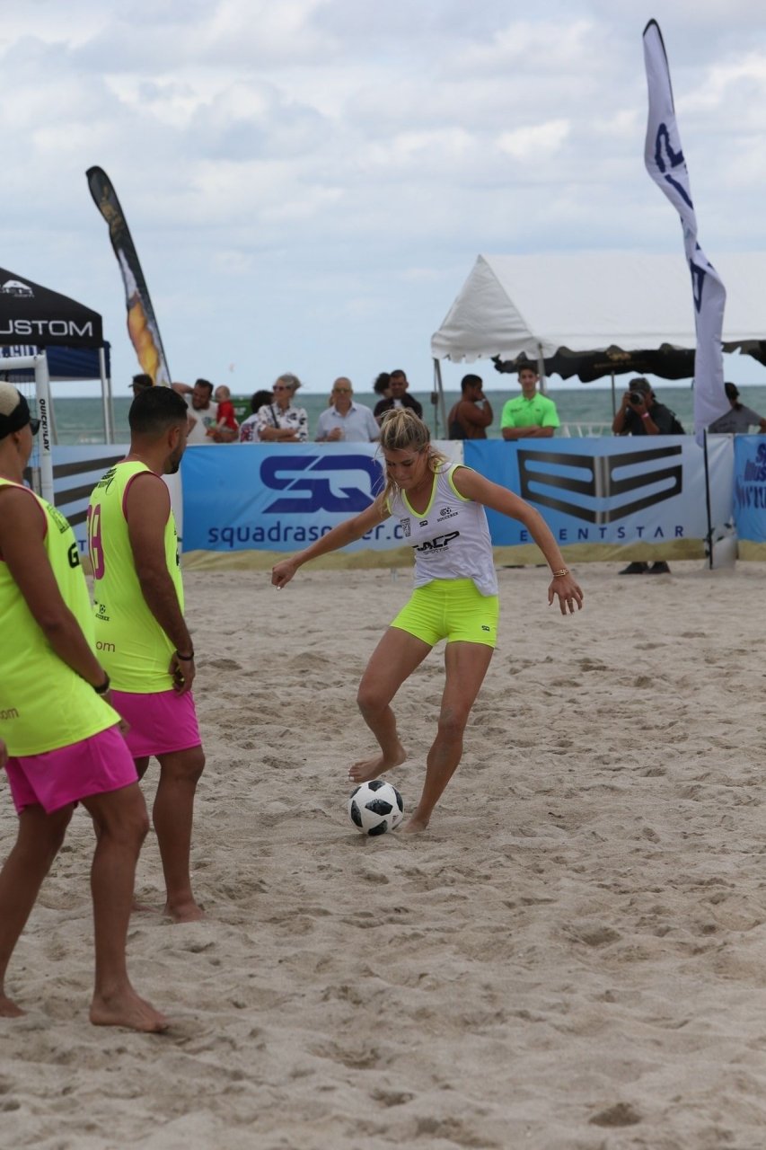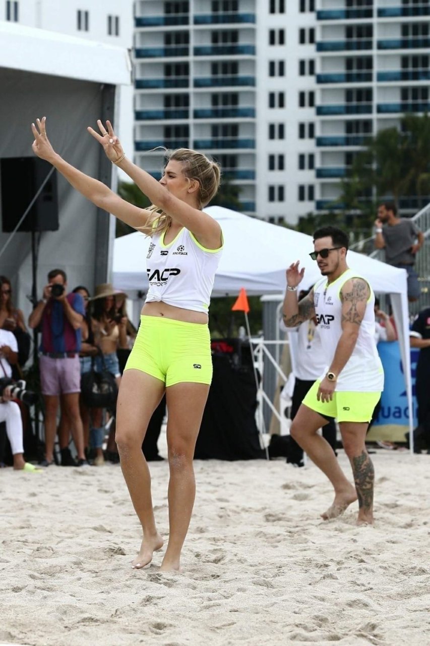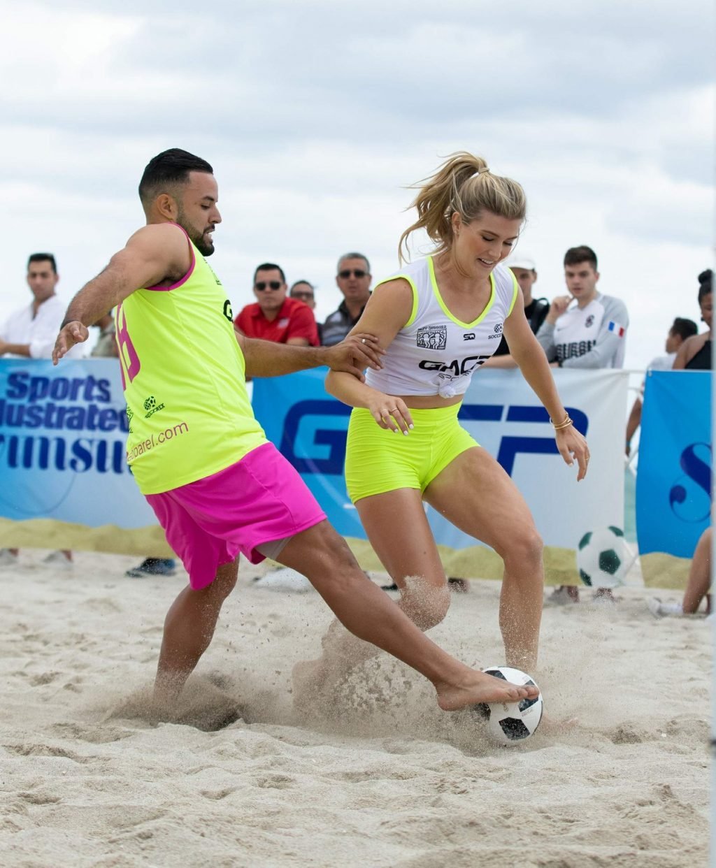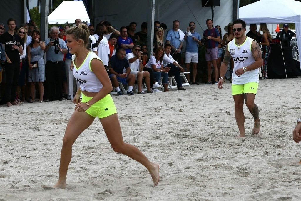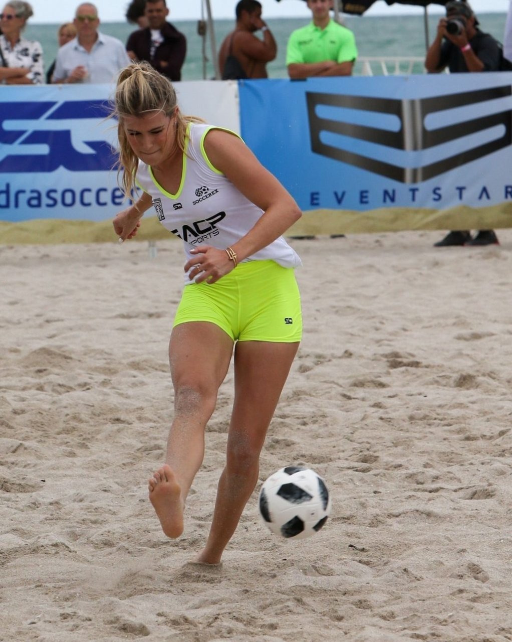 La tenista Eugenie “Genie” Bouchard (24) sorprendió a todos durante el Partido de Fútbol Playa de Celebridades de Sports Illustrated en Miami, 17/11/2018. Ella llevaba una camiseta sin mangas blanca y pantalones cortos neón que mostraban sus pezones y camel toe.