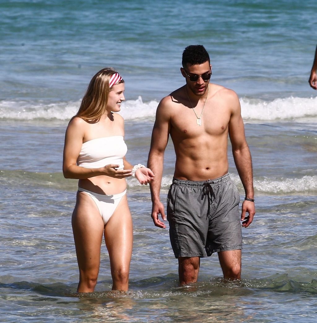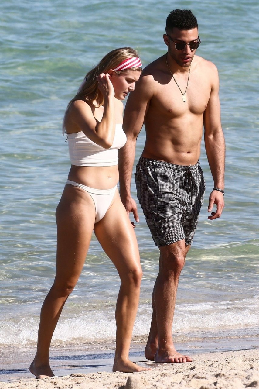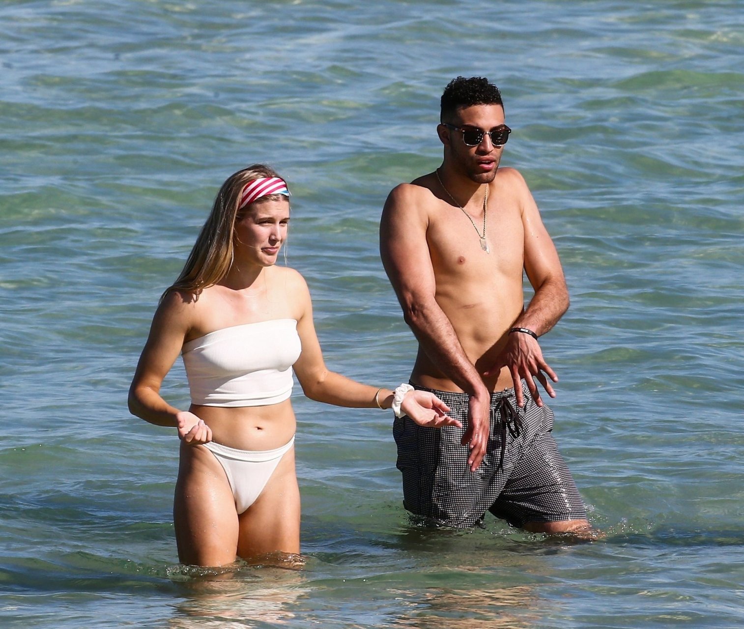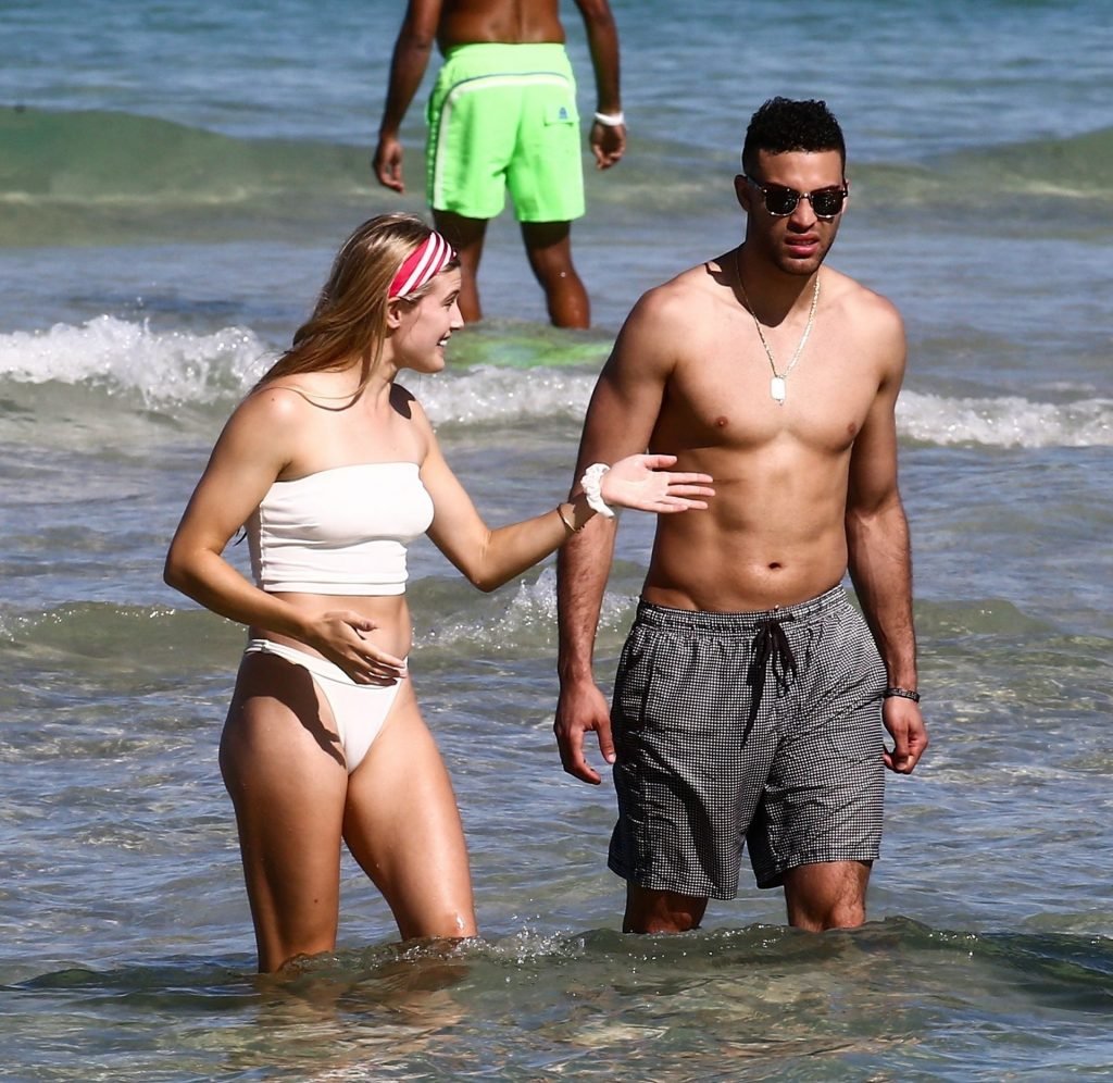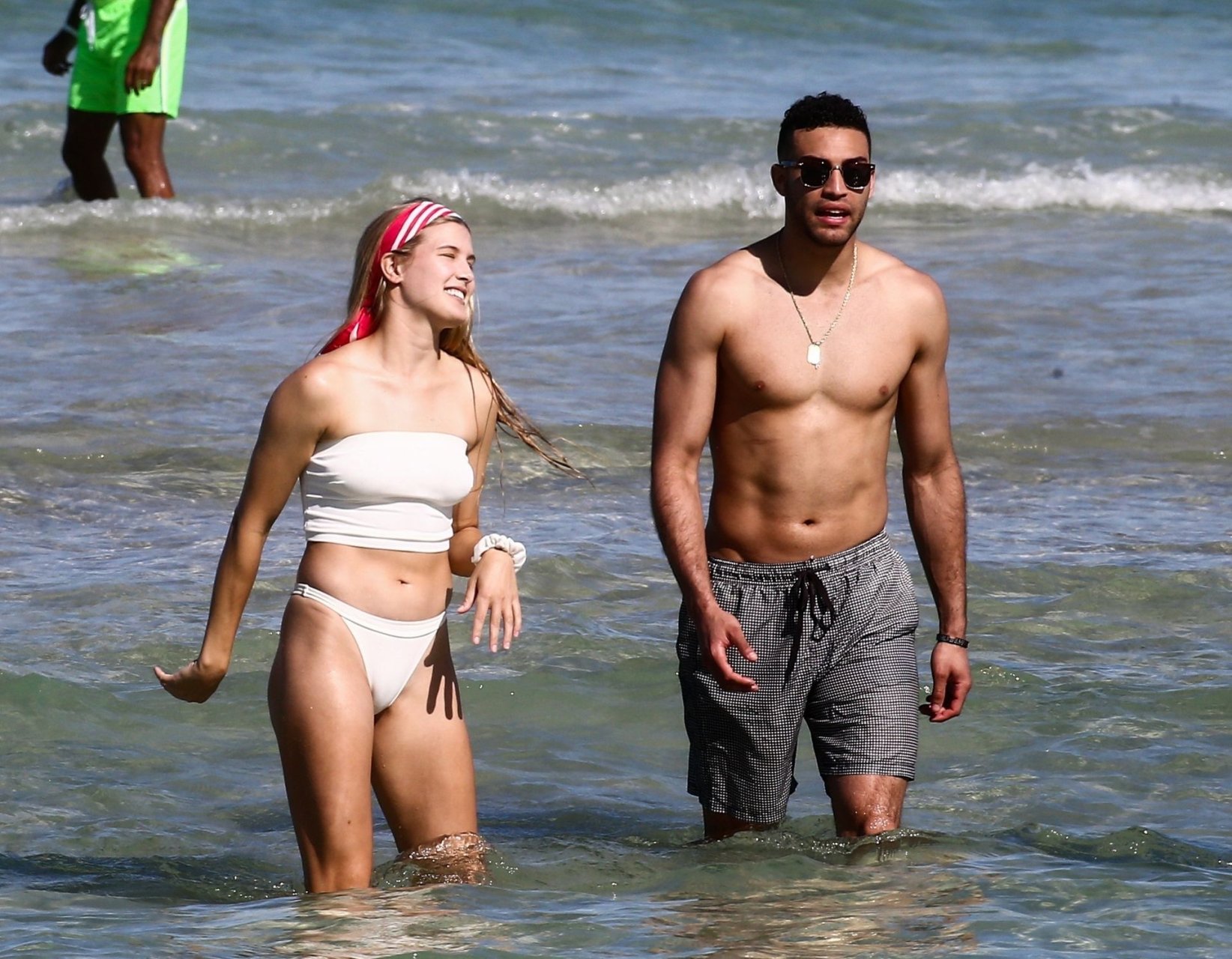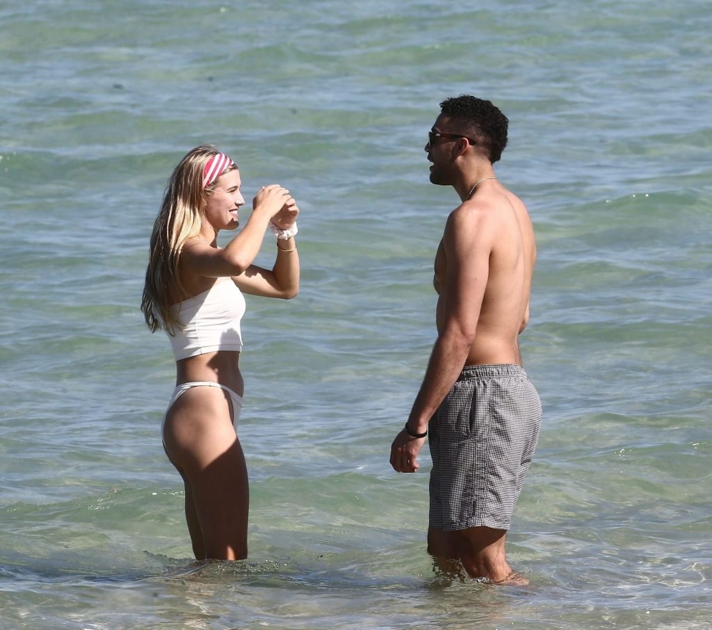 La estrella del tenis Genie Bouchard y un hombre misterioso están celebrando el Domingo de Pascua con un baño caliente en las aguas de Miami Beach, 21/04/2019. Genie, que llevaba un bikini blanco de dos piezas, sonríe mientras el musculoso hombre se une a ella para nadar.