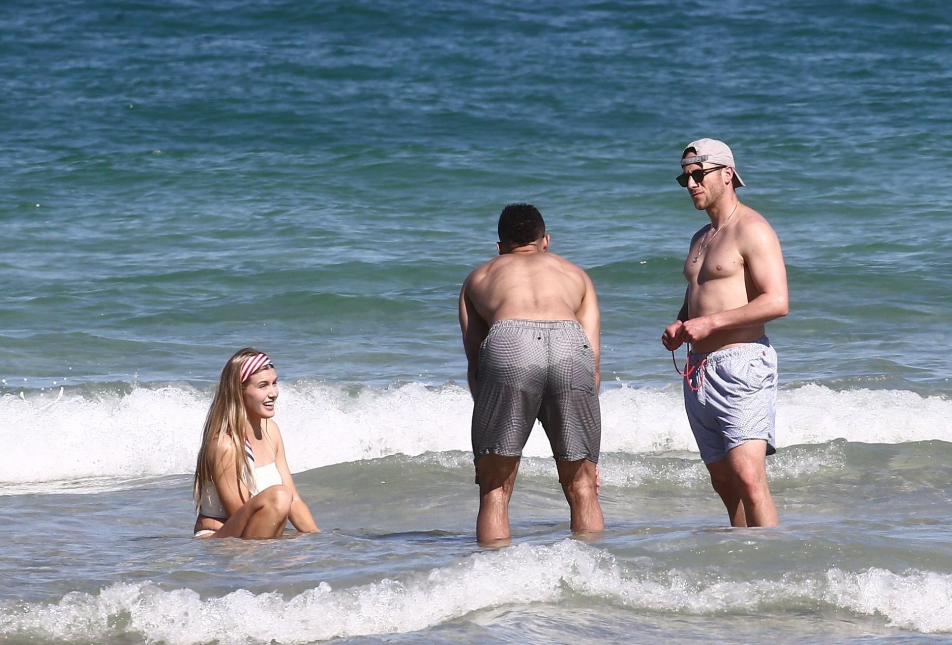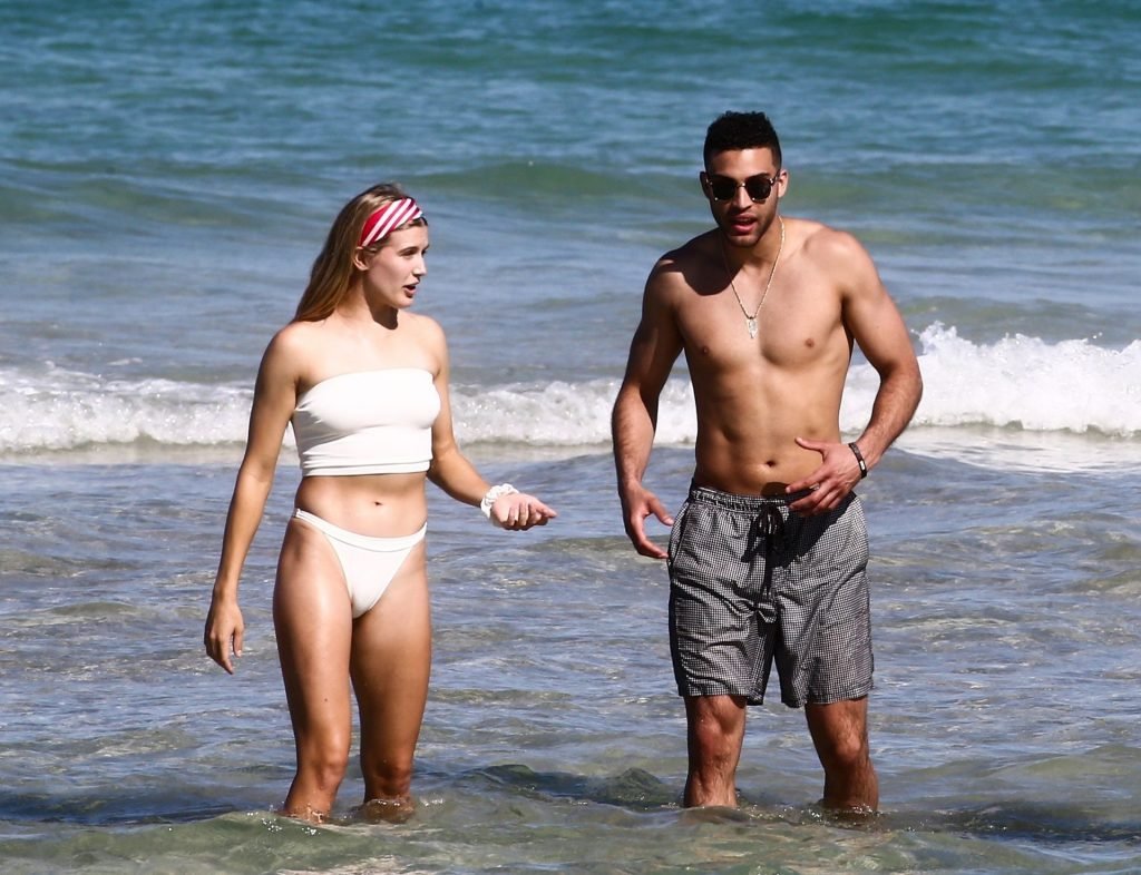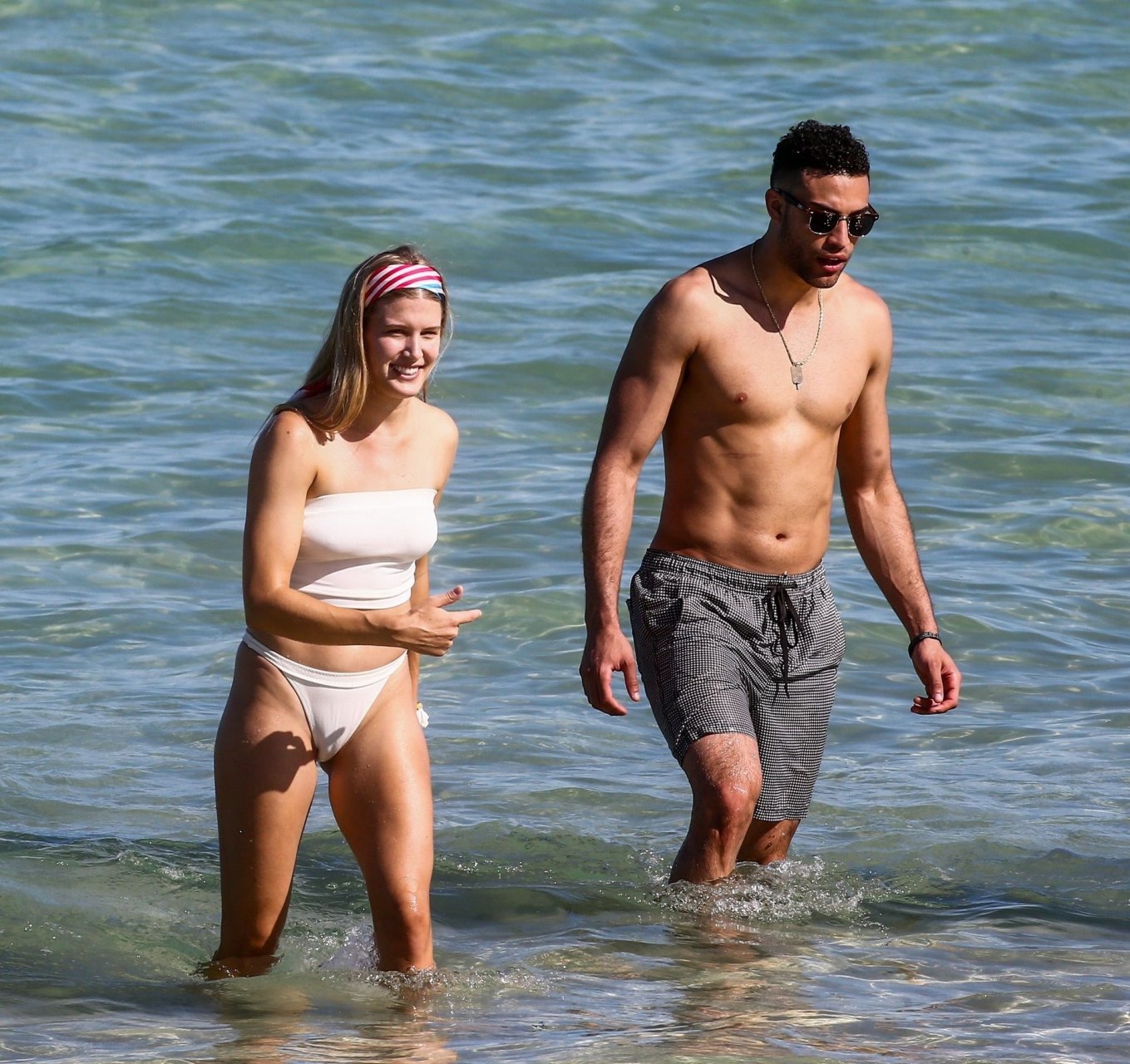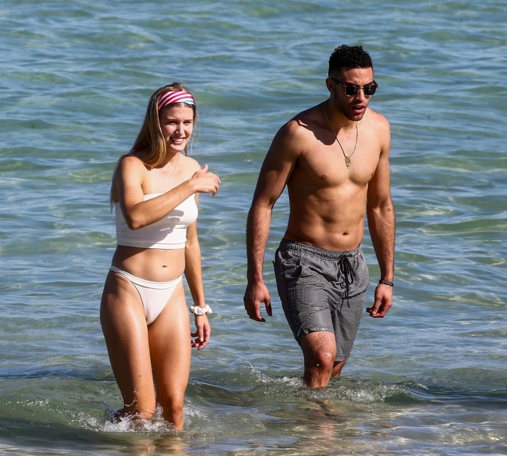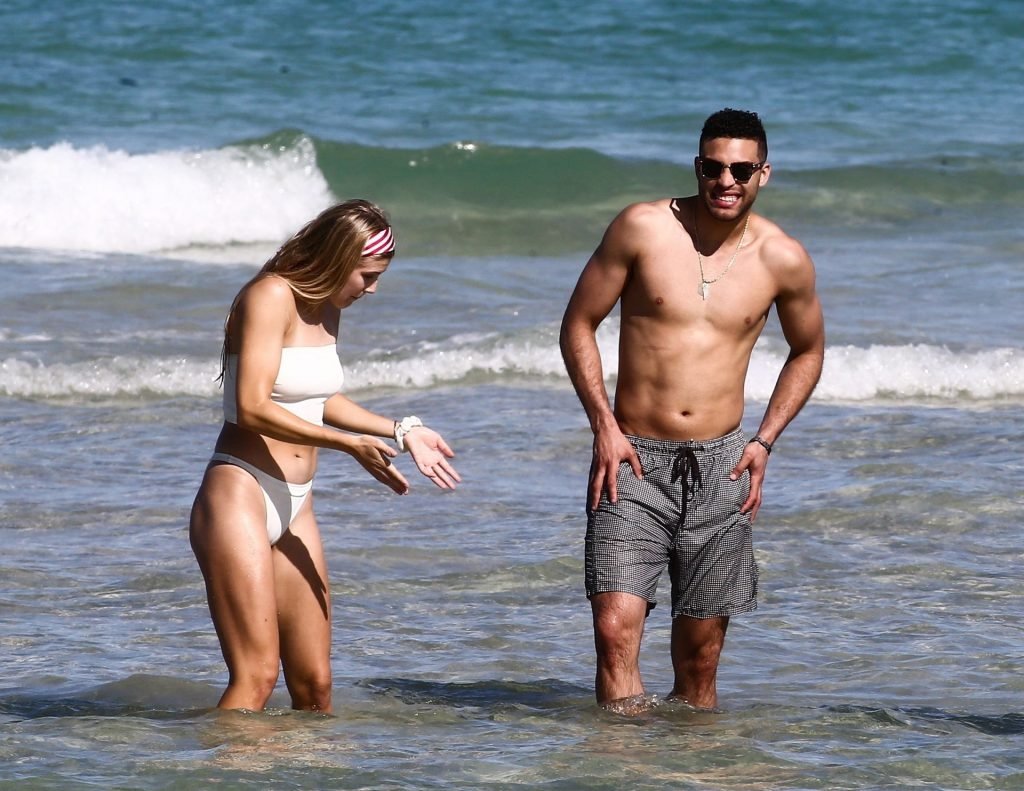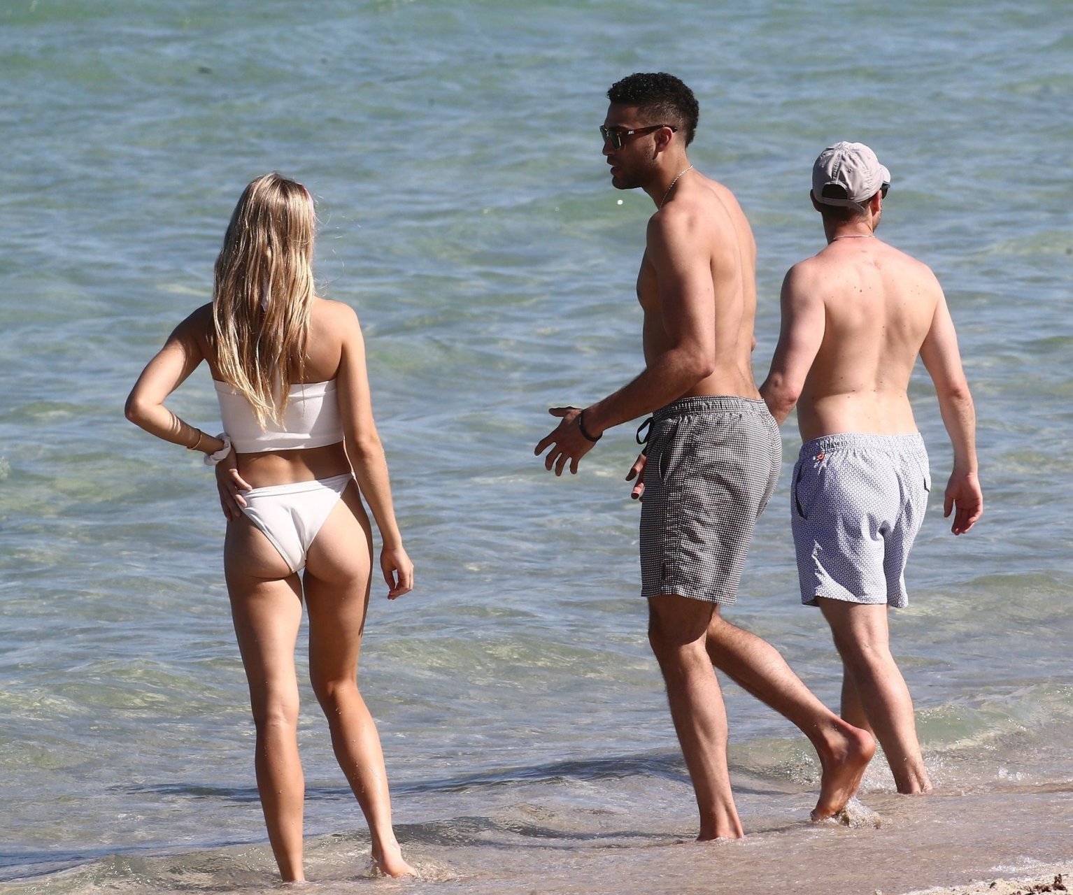 La estrella del tenis Genie Bouchard y un hombre misterioso están celebrando el Domingo de Pascua con un baño caliente en las aguas de Miami Beach, 21/04/2019. Genie, que llevaba un bikini blanco de dos piezas, sonríe mientras el musculoso hombre se une a ella para nadar.