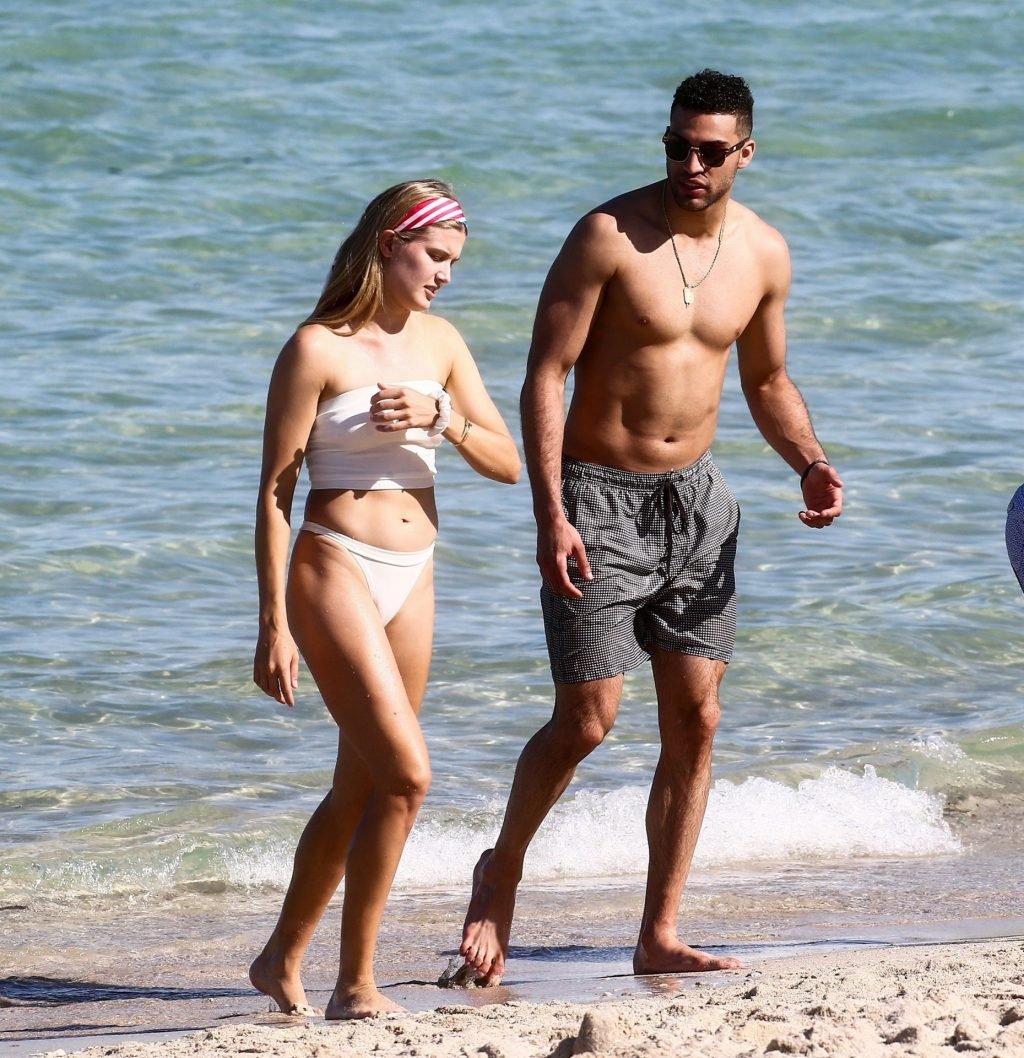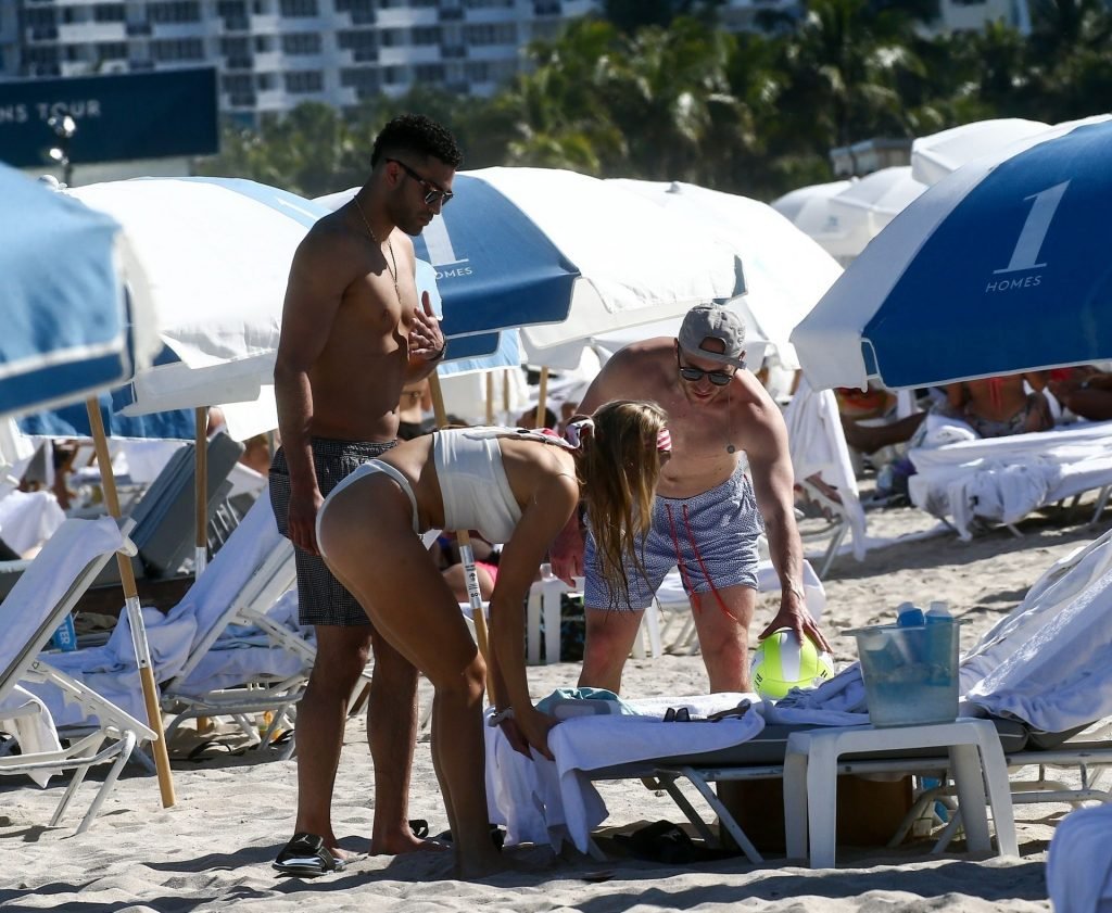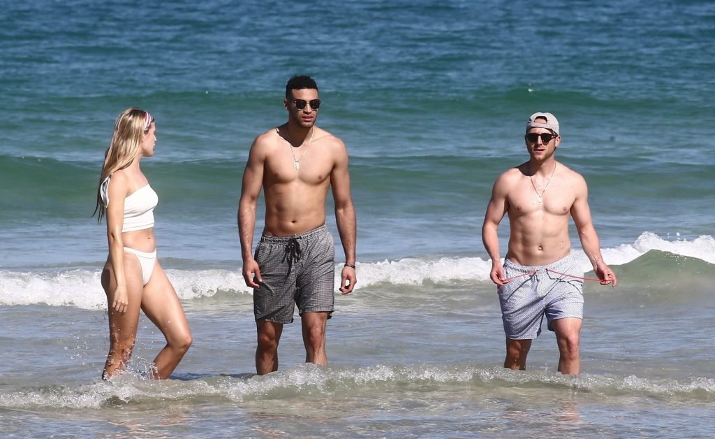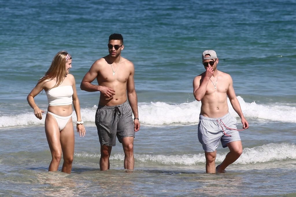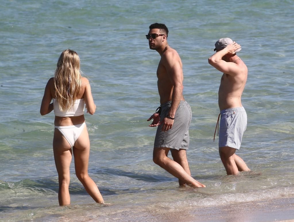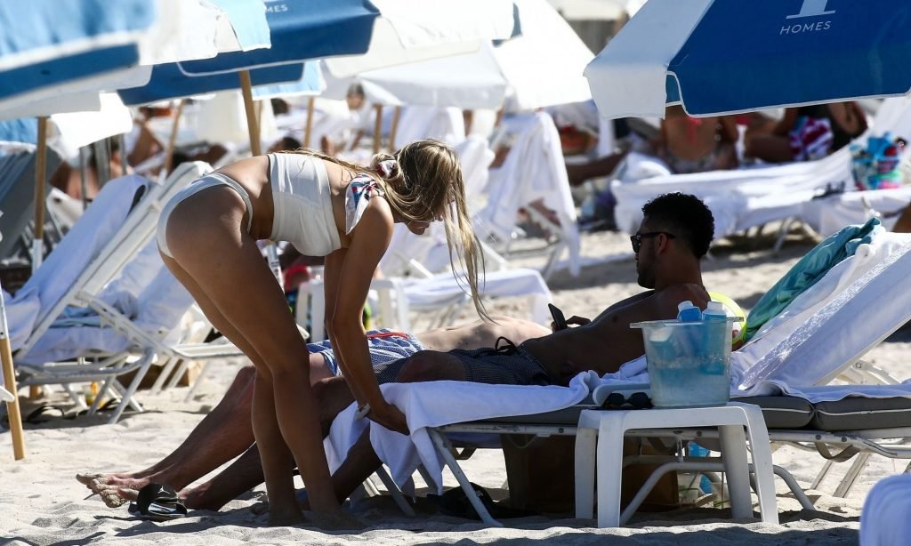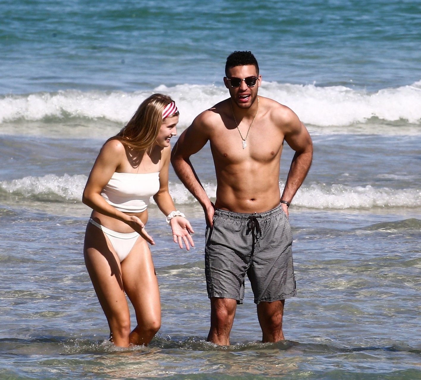 La estrella del tenis Genie Bouchard y un hombre misterioso están celebrando el Domingo de Pascua con un baño caliente en las aguas de Miami Beach, 21/04/2019. Genie, que llevaba un bikini blanco de dos piezas, sonríe mientras el musculoso hombre se une a ella para nadar.
