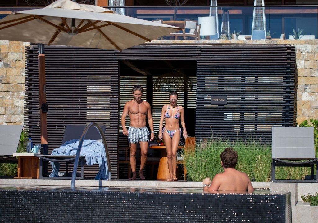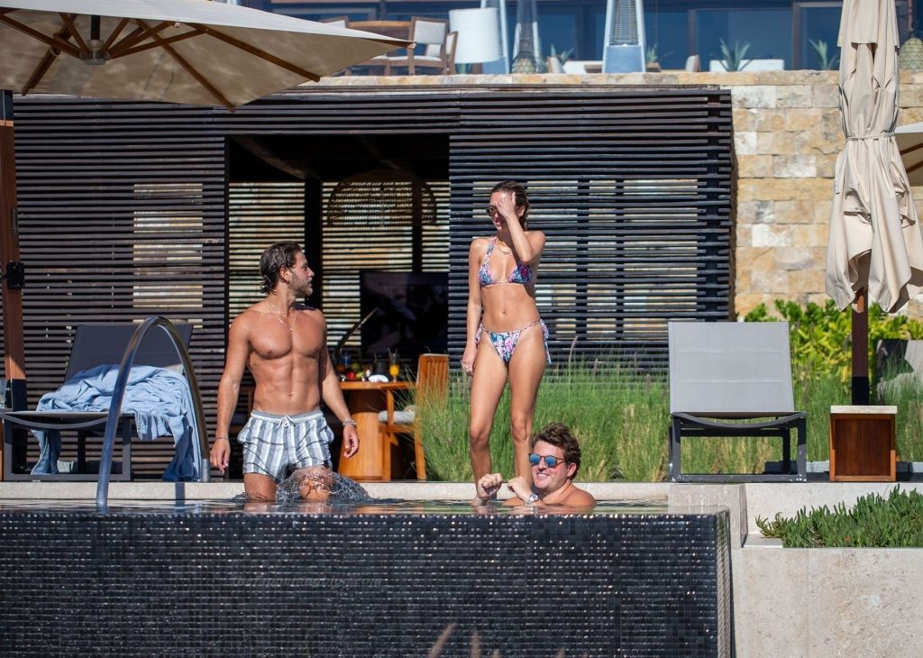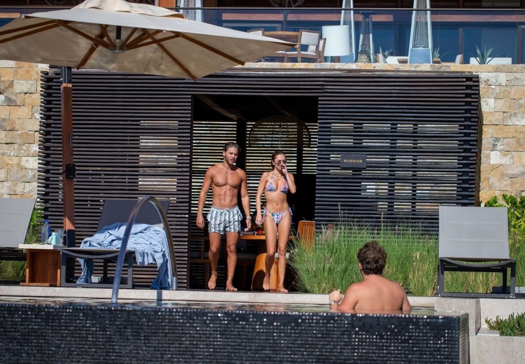 La hija del actor Harry Hamlin, Delilah, mostró su figura sexy y seductora con un bikini de estampado multicolor y Eyal con sus pantalones cortos a rayas. La pareja disfrutó de un poco de muestras públicas de afecto junto a la piscina.
