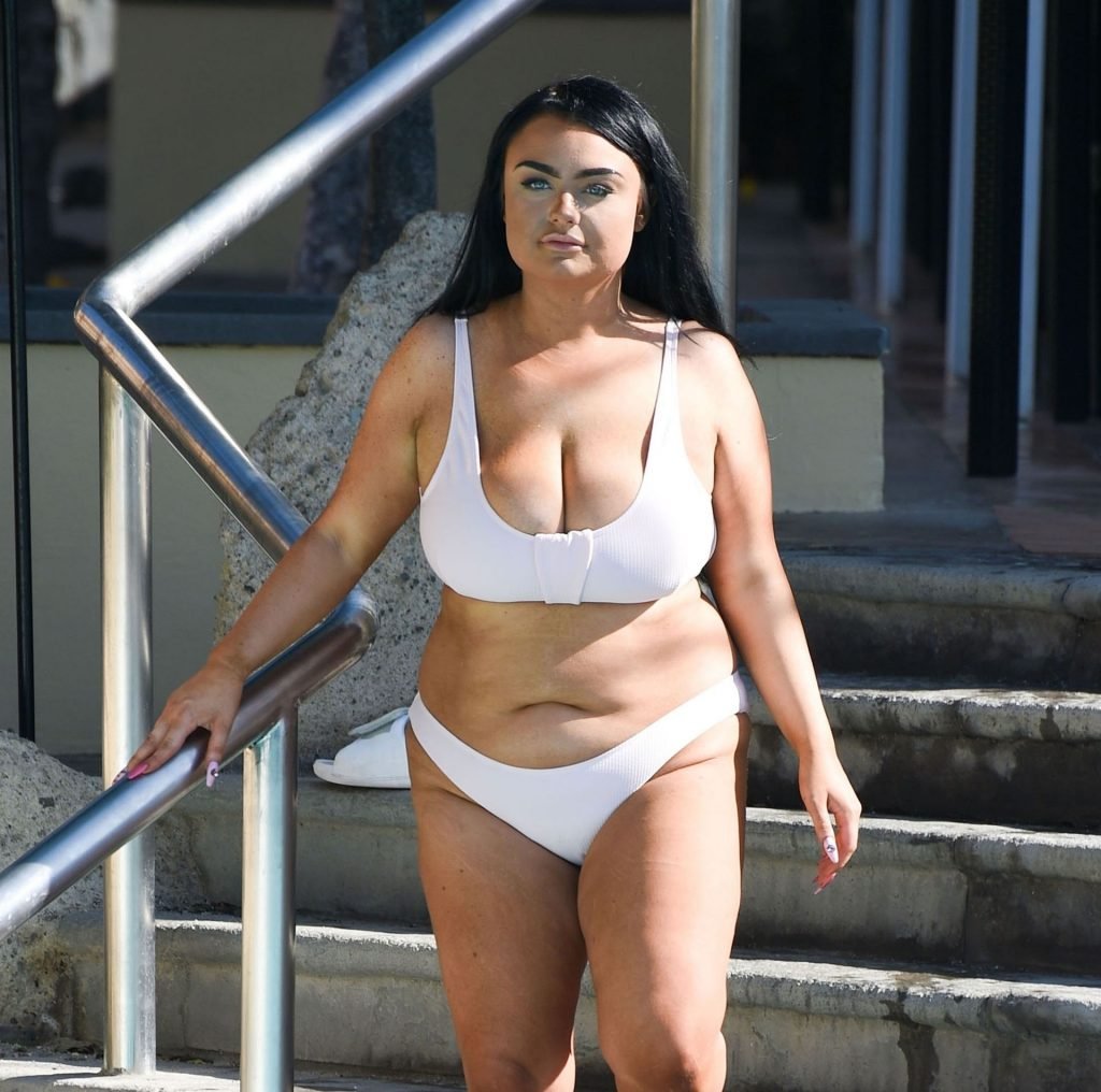 “La estrella de “Geordie Shore” Faith Mullen es vista tropezando mientras está de vacaciones en Lanzarote, 14/01/2019. La modelo de talla grande se muestra relajándose alrededor de la piscina con un bikini que acentúa su busto más lleno y sus curvas hermosas.