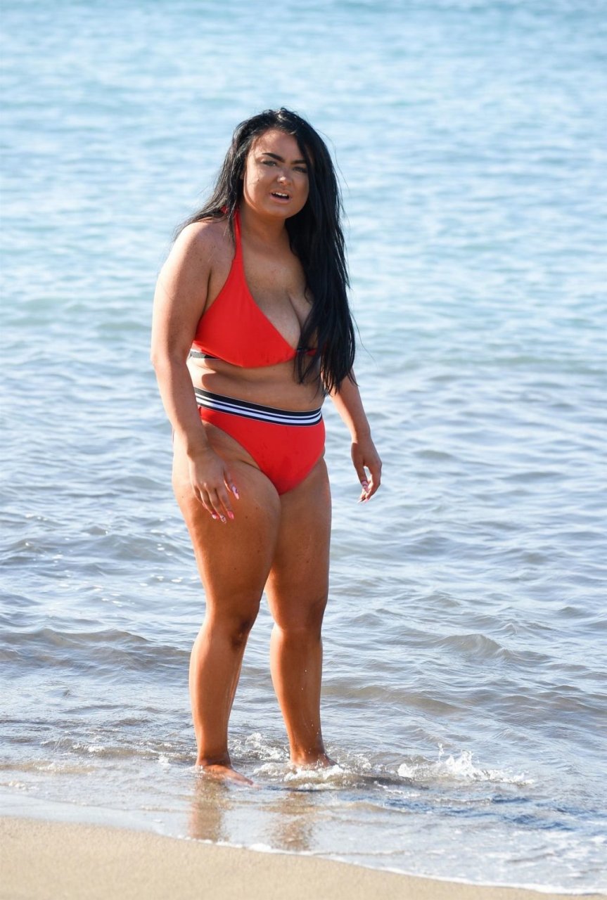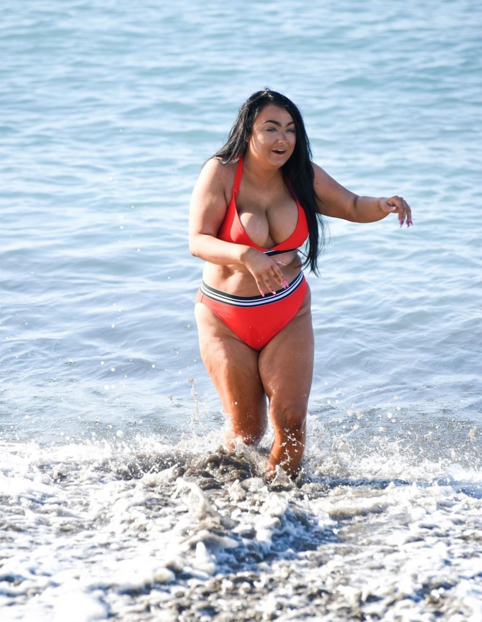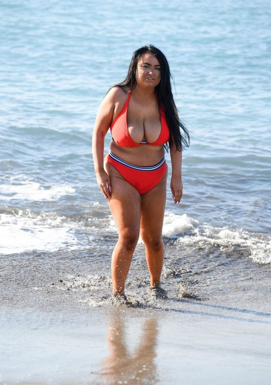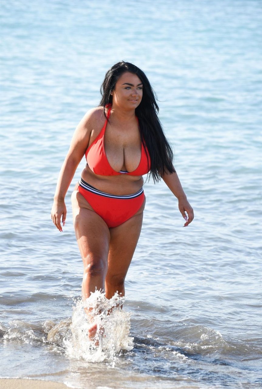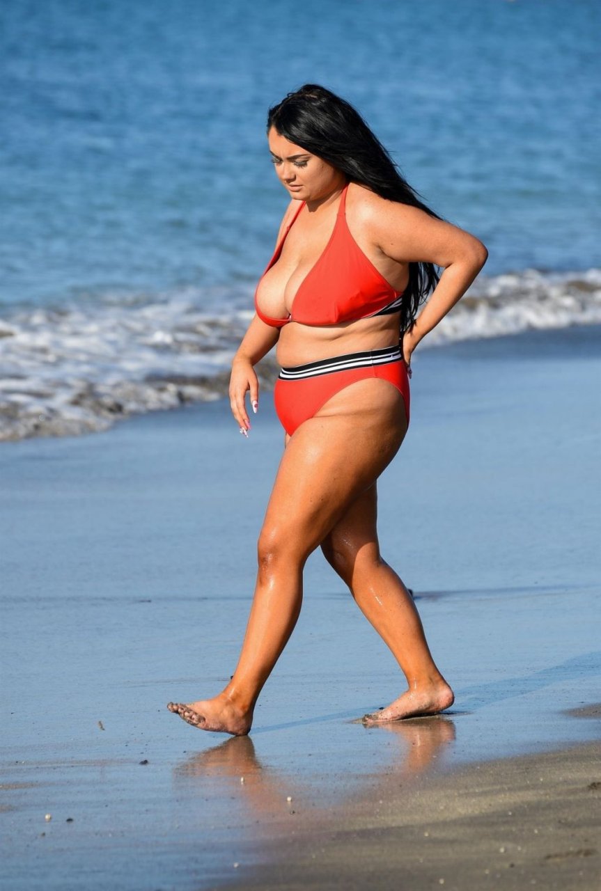La estrella de “Geordie Shore” Faith Mullen se muestra con un bikini rojo mientras está de vacaciones en Tenerife (2018). Faith reveló recientemente que es acosada diariamente por su peso y que la llaman gorda a diario.