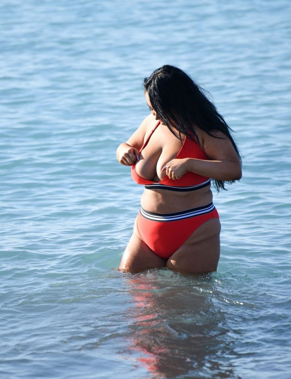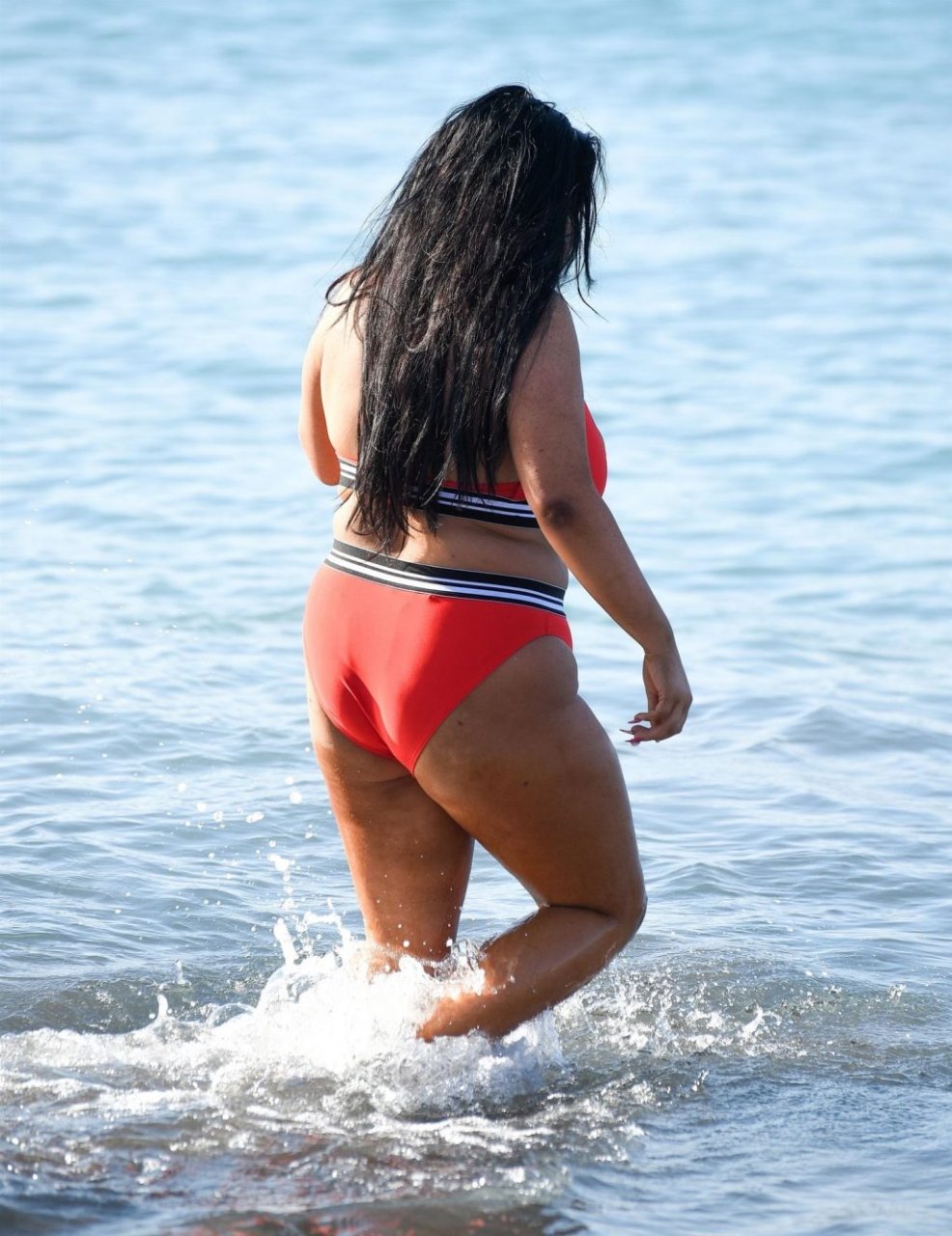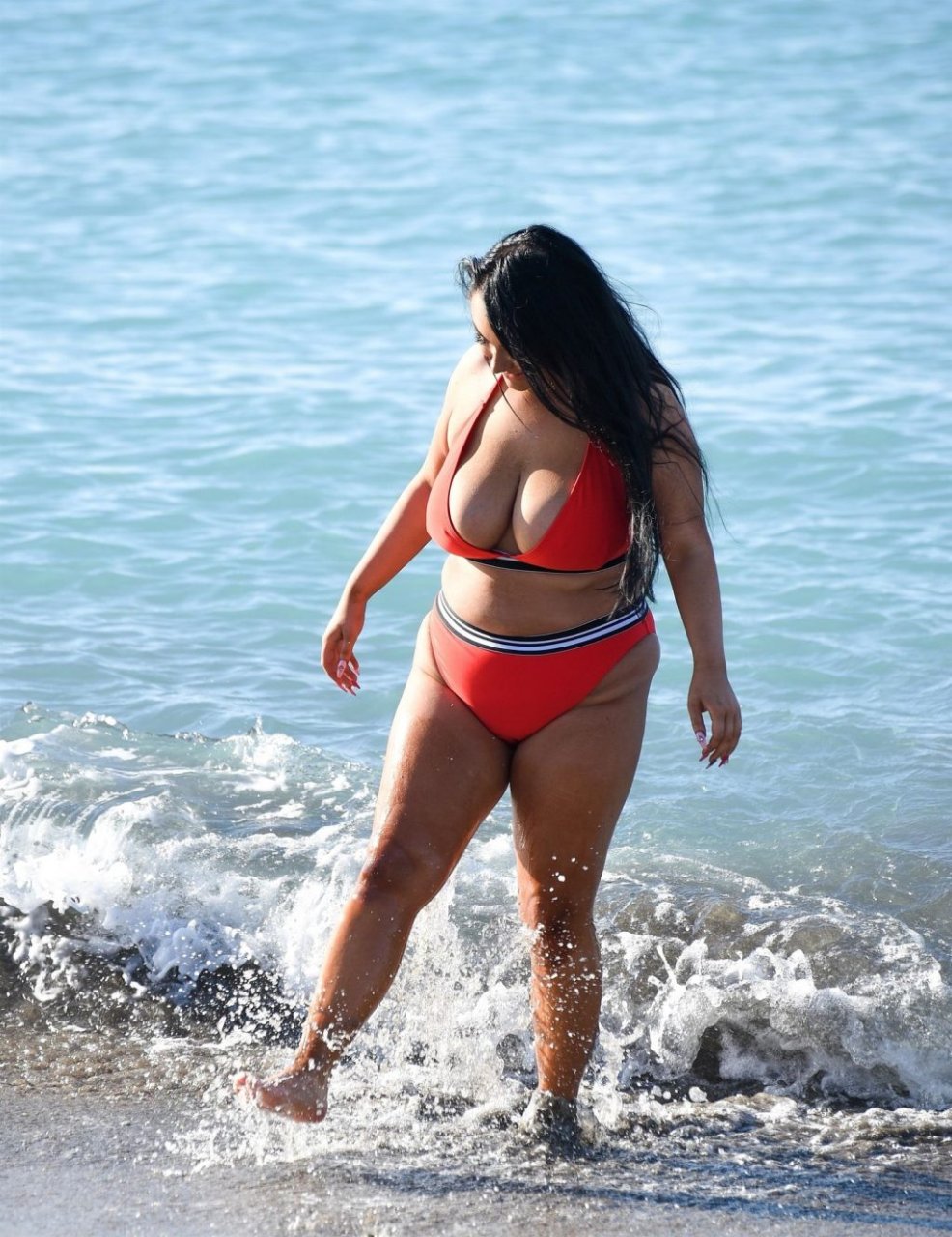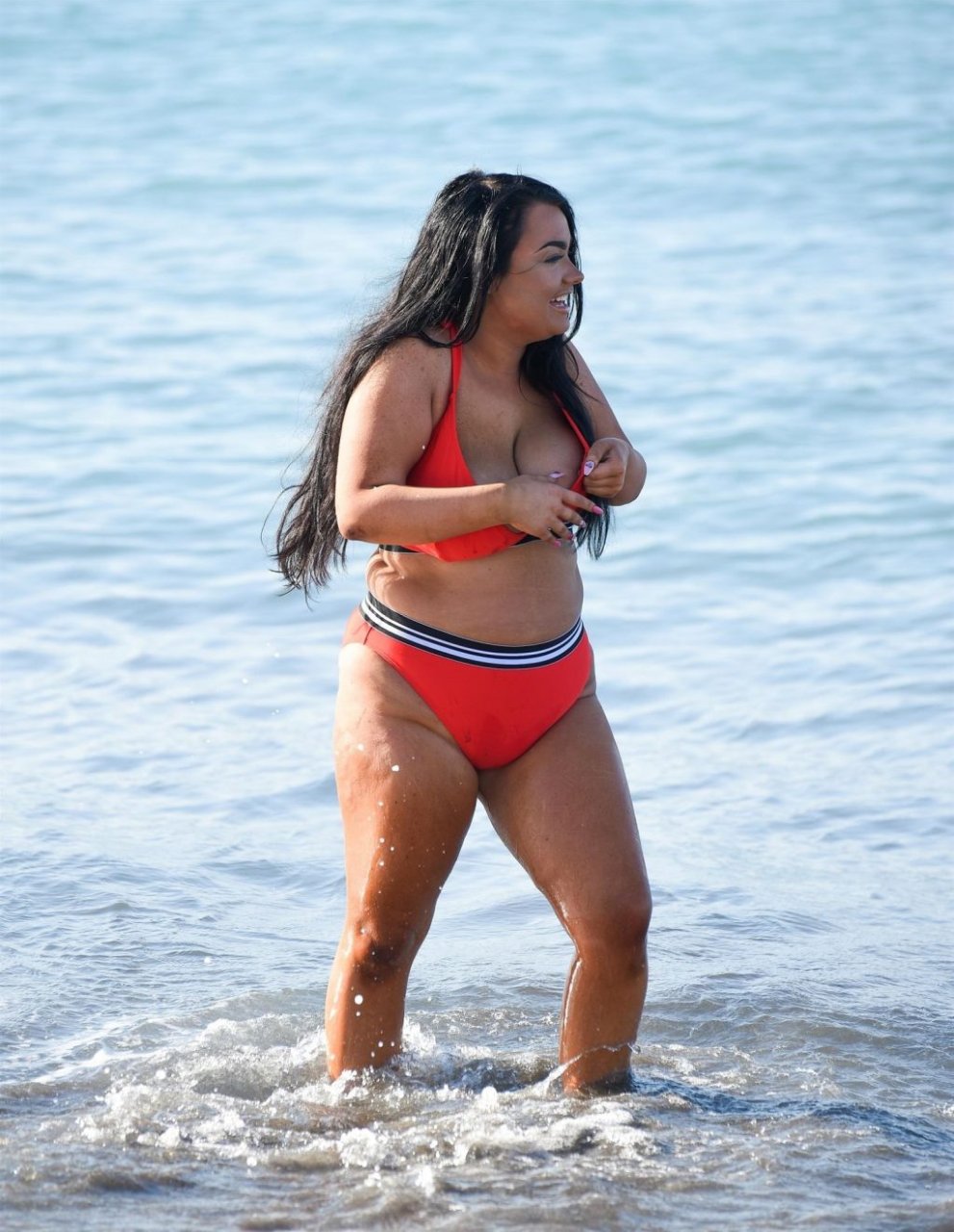 La estrella de “Geordie Shore” Faith Mullen se muestra con un bikini rojo mientras está de vacaciones en Tenerife (2018). Faith reveló recientemente que es acosada diariamente por su peso y que la llaman gorda a diario.