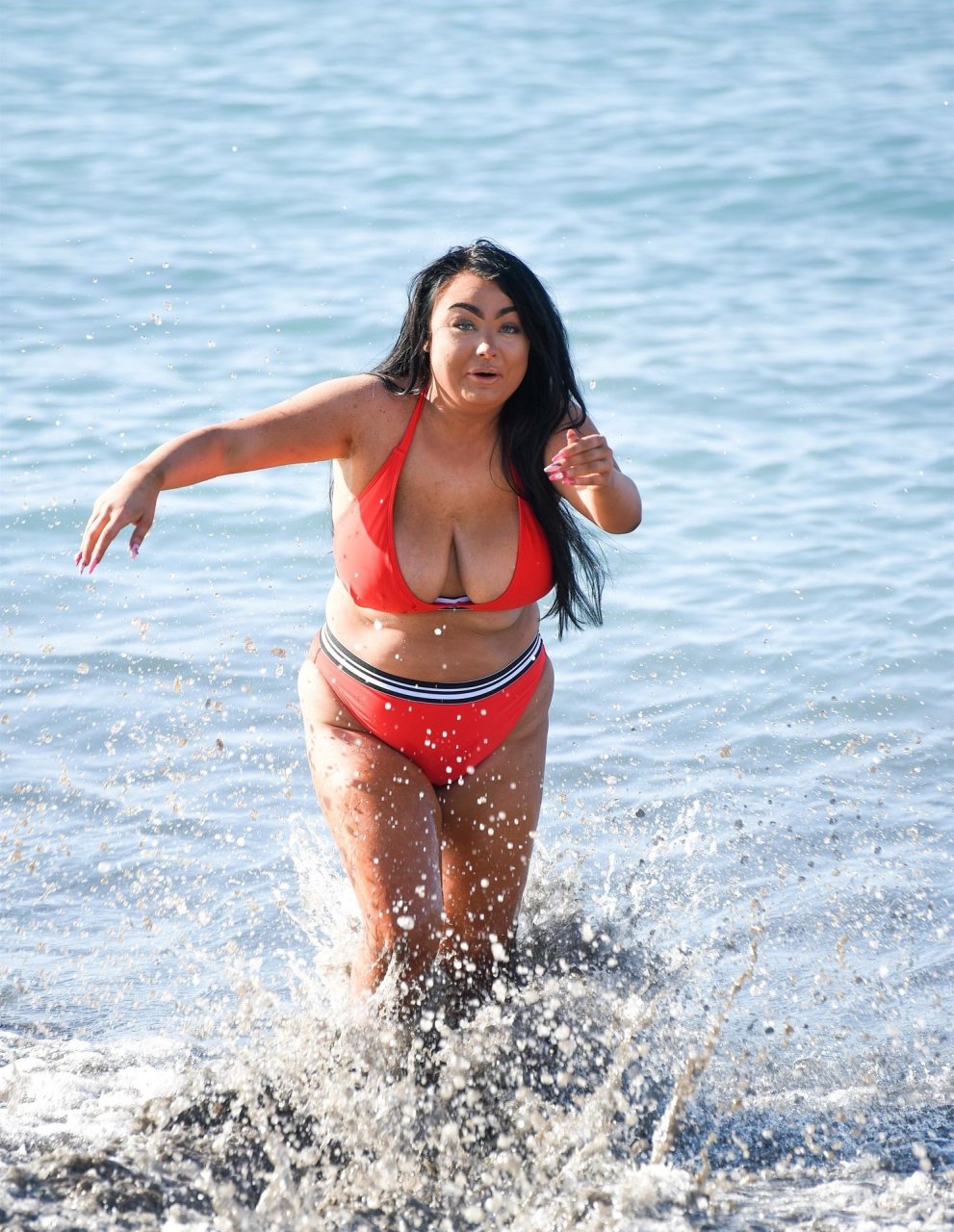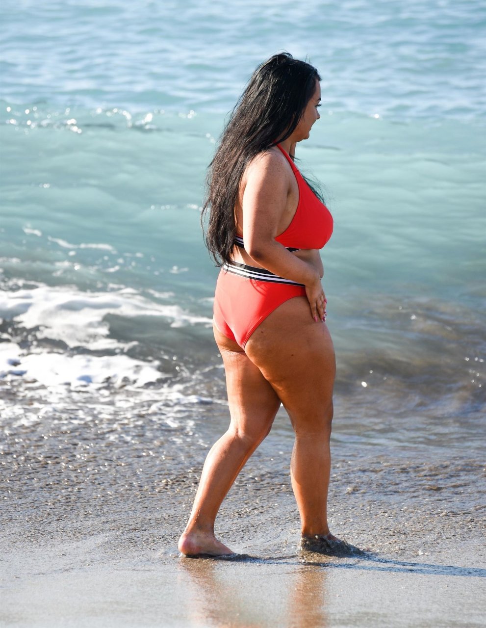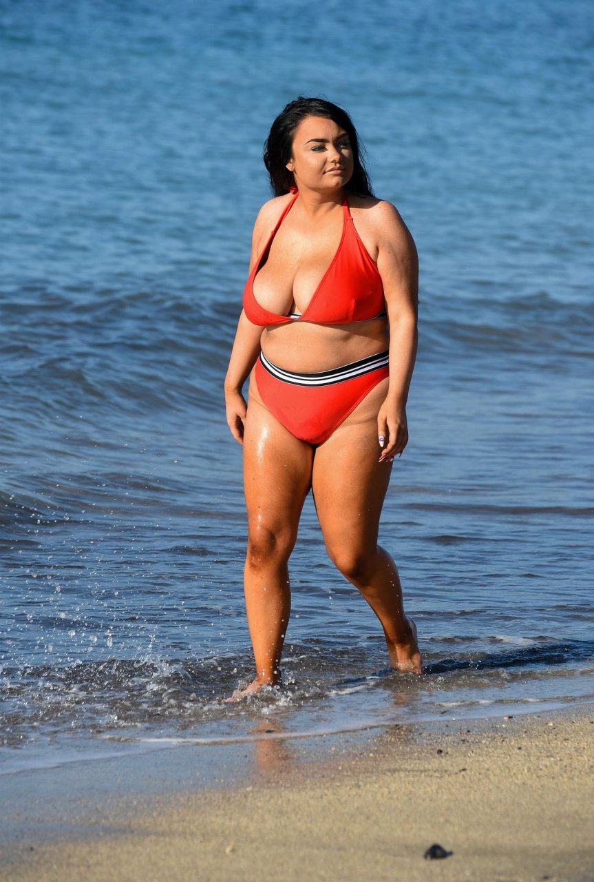 La estrella de “Geordie Shore” Faith Mullen se muestra con un bikini rojo mientras está de vacaciones en Tenerife (2018). Faith reveló recientemente que es acosada diariamente por su peso y que la llaman gorda a diario.