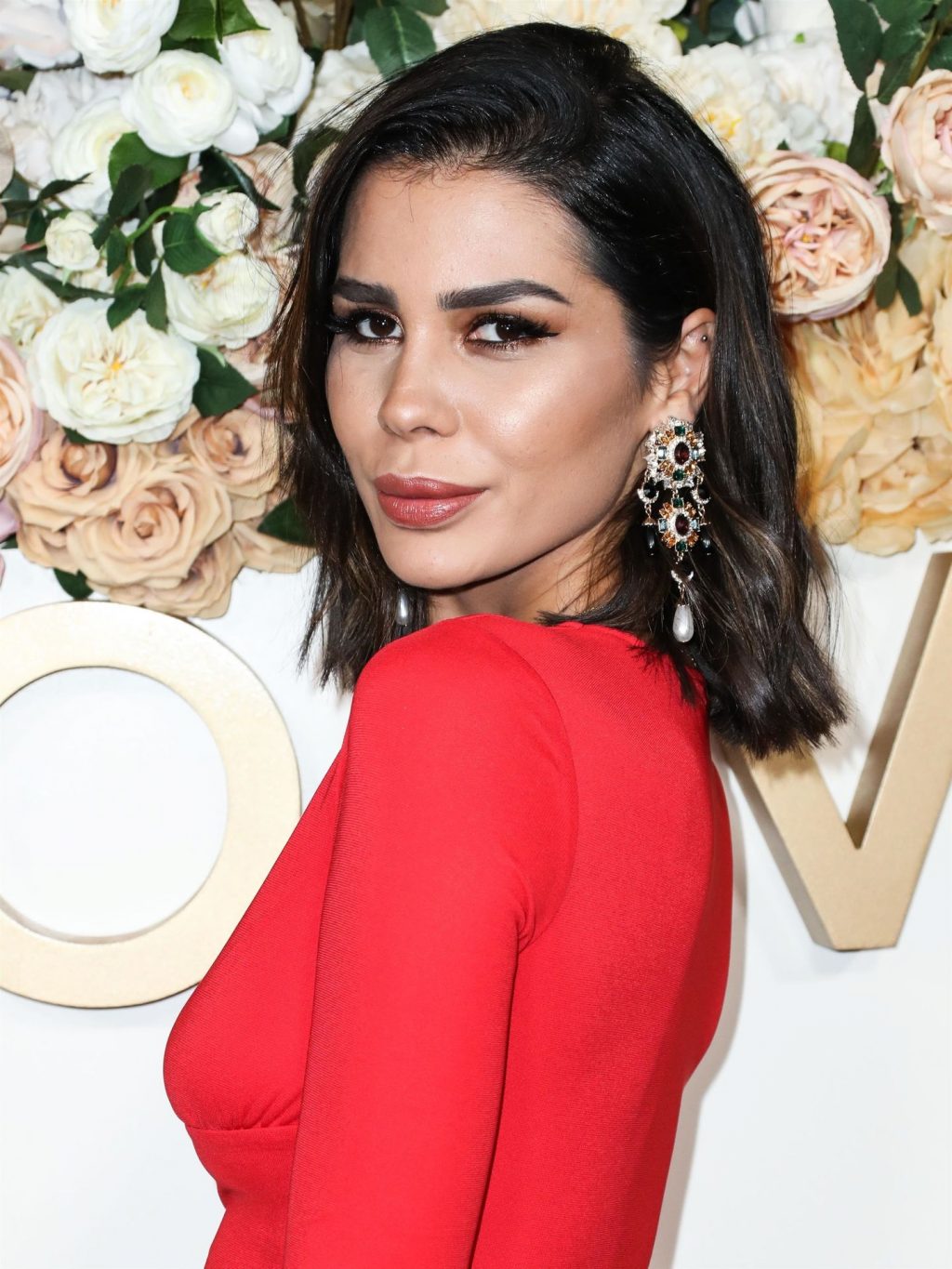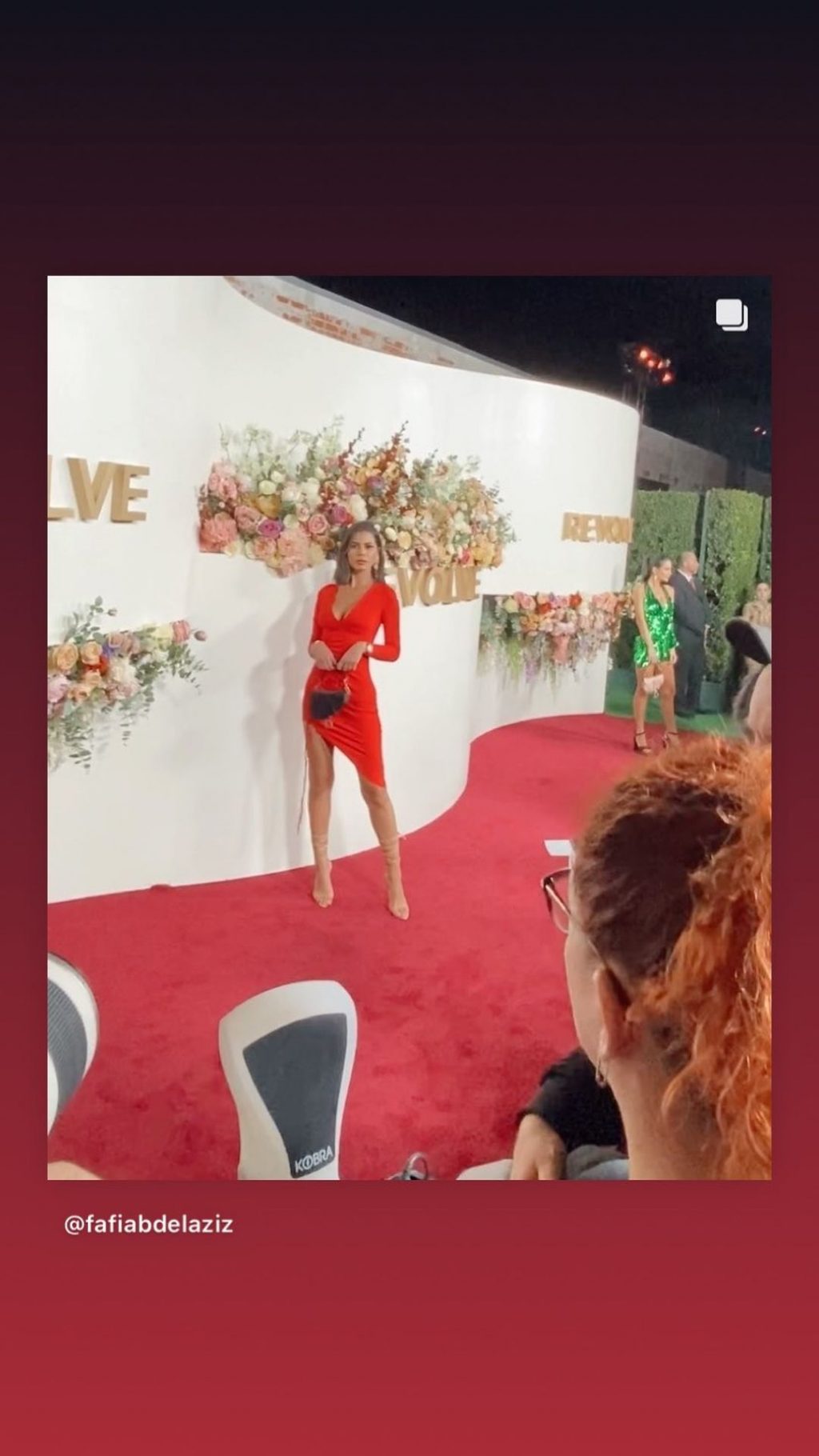 Farah Aziz mostró sus piernas delgadas y un bonito escote mientras posaba con un vestido rojo en la 3ª edición anual de los #REVOLVEawards 2019 celebrados en Goya Studios en Hollywood, Los Ángeles, 15/11/2019.