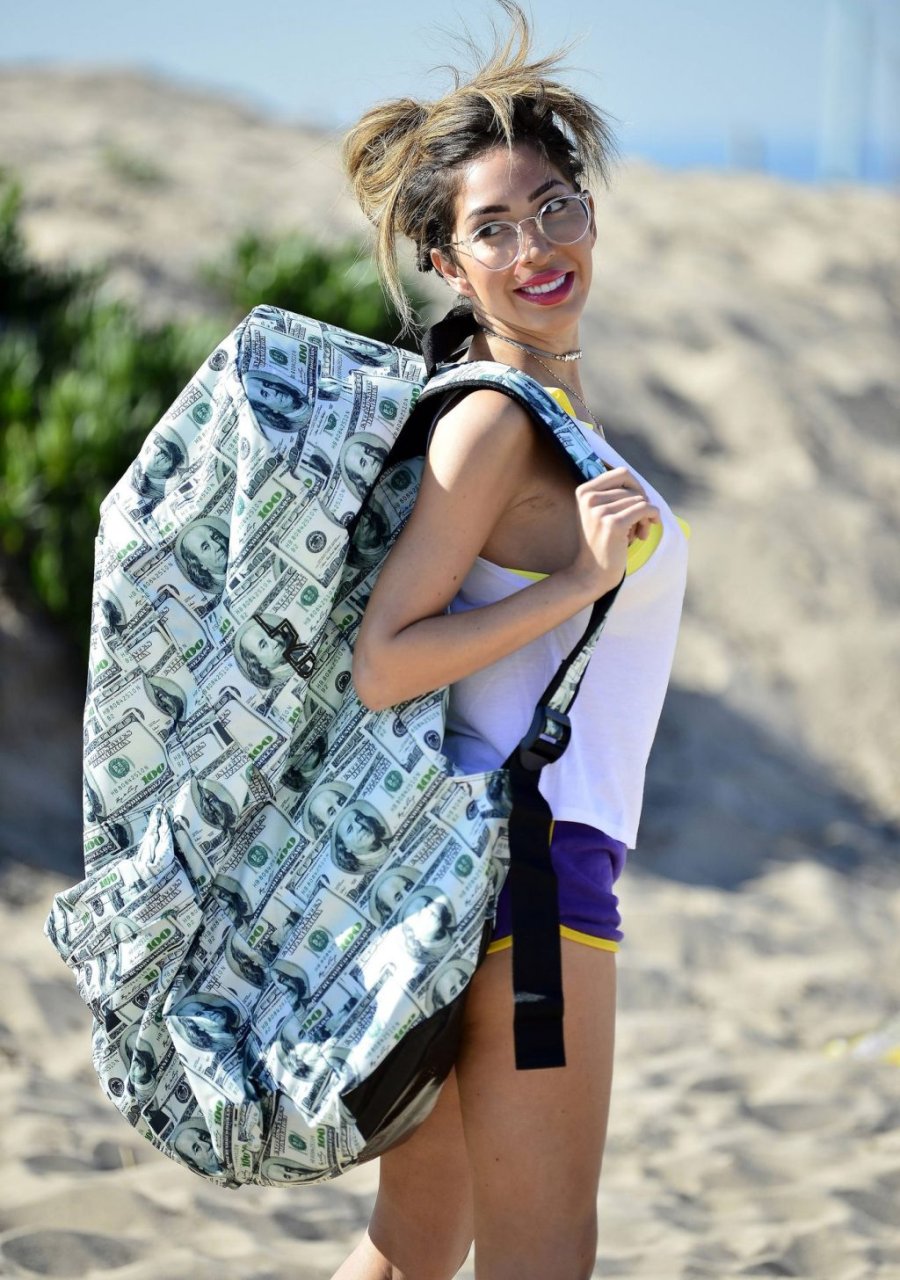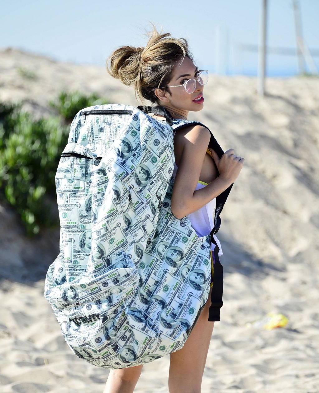 Farrah Abraham lleva una mochila gigante cubierta con billetes de $100 a la playa en Los Ángeles, 07/04/2019.