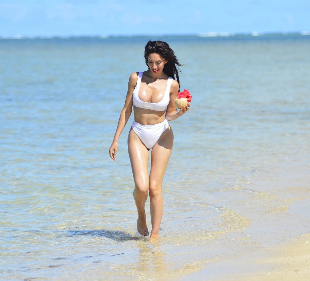 Farrah Abraham, 26, muestra su increíble cuerpo mientras disfruta del sol durante un día en la playa en Fiji, 05/05/2018. La estrella de la televisión reality llevaba un bikini blanco, destacando sus grandes pechos falsos y su trasero al estilo Kardashian.