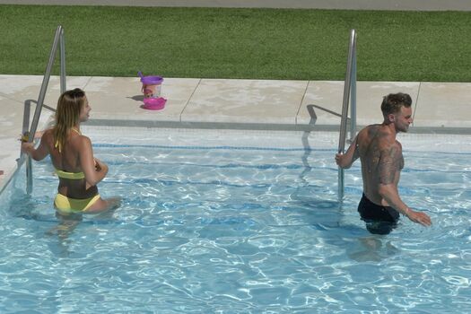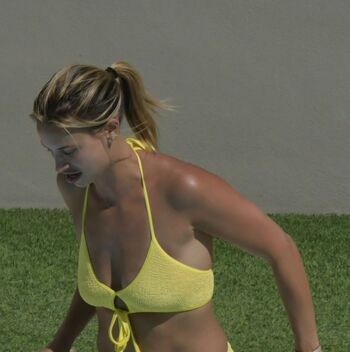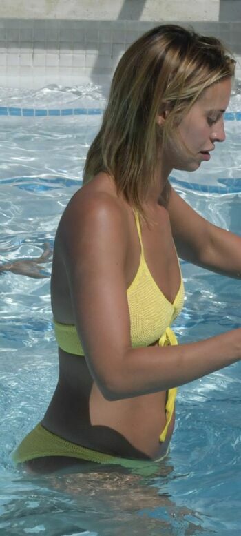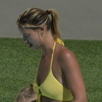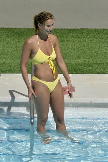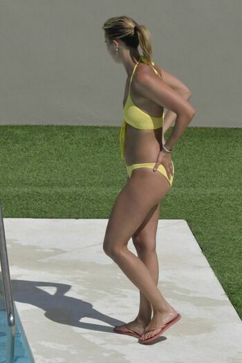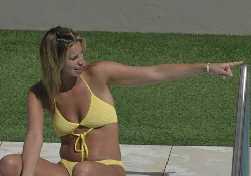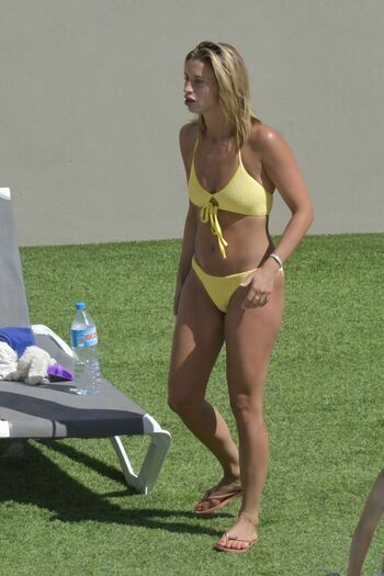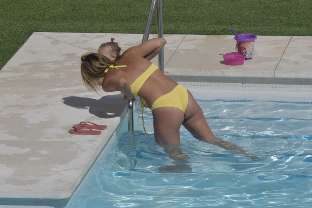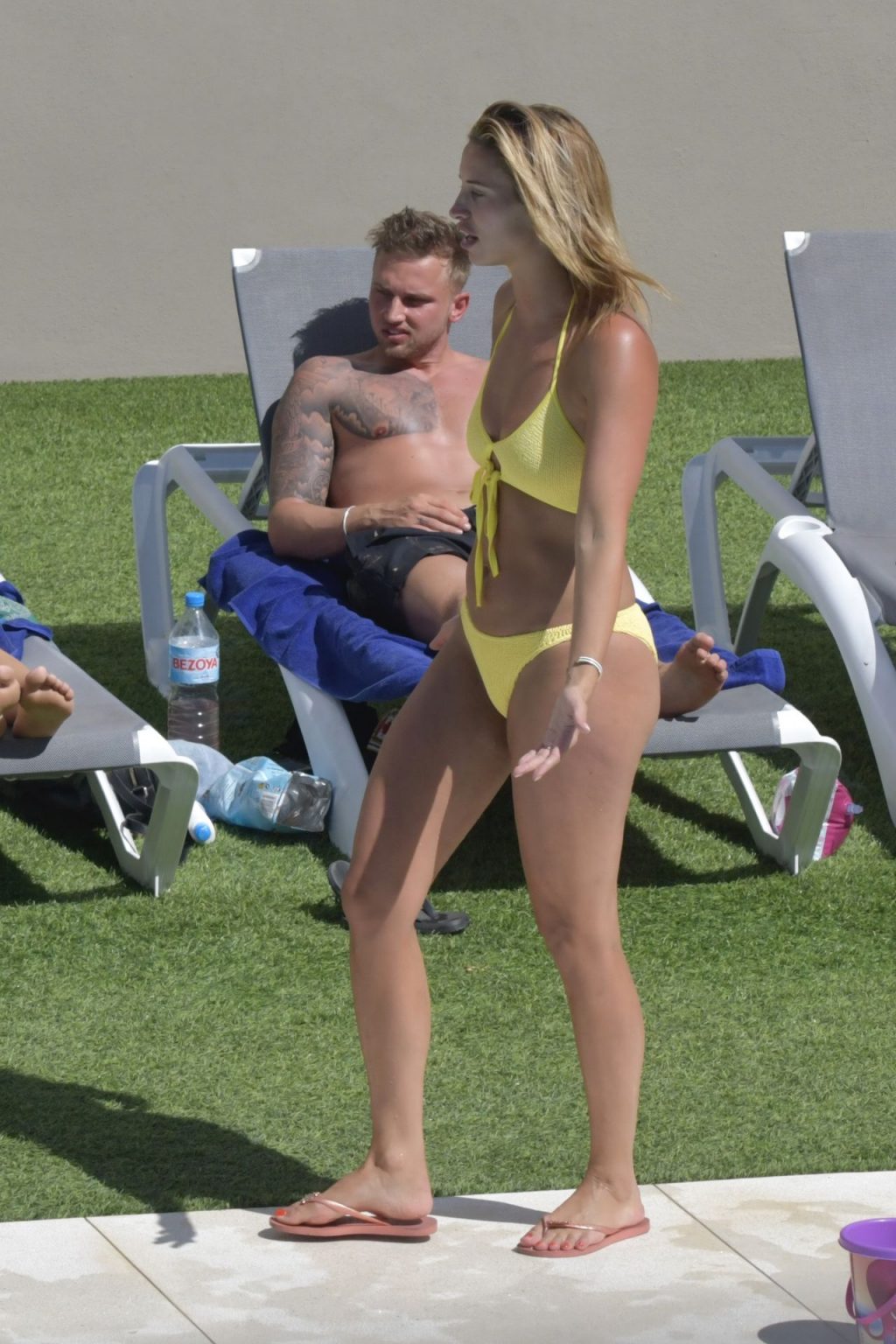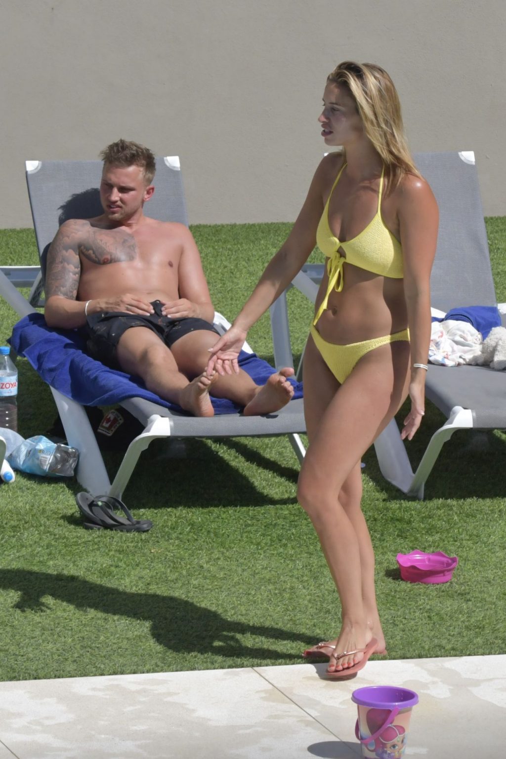 Ferne McCann muestra su figura de supermodelo con un bikini amarillo de dos piezas mientras se relaja en la piscina durante sus vacaciones en Marbella, 29/07/2019.