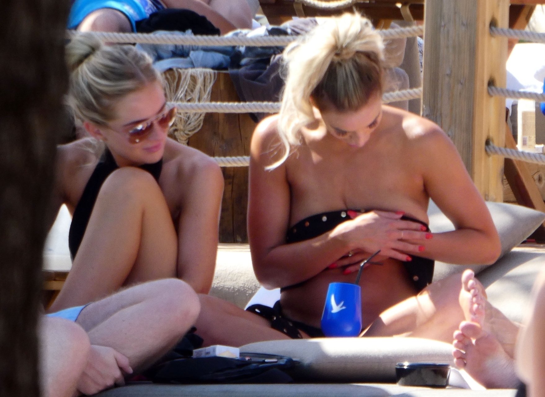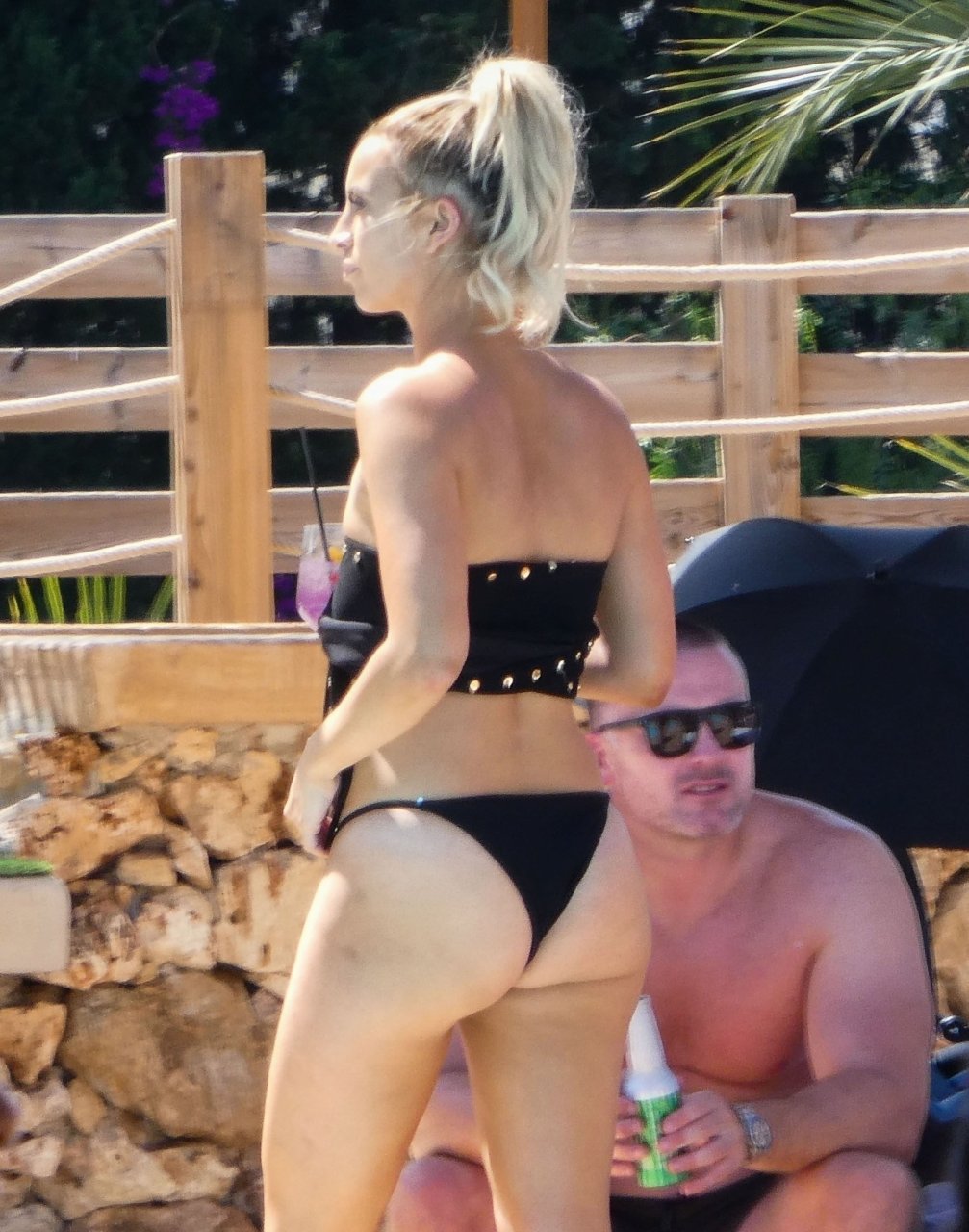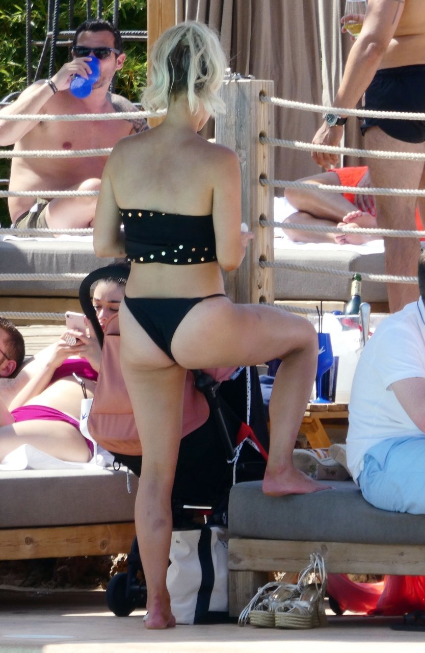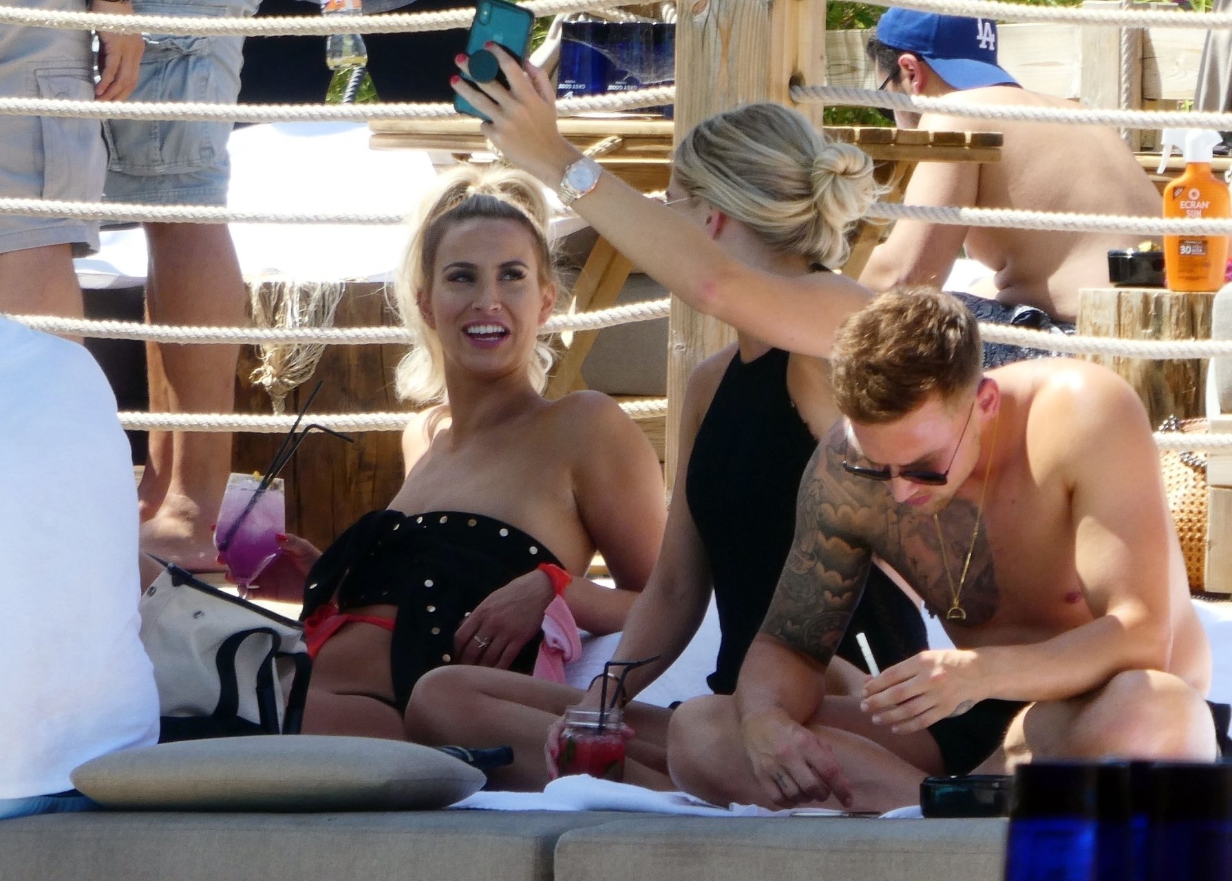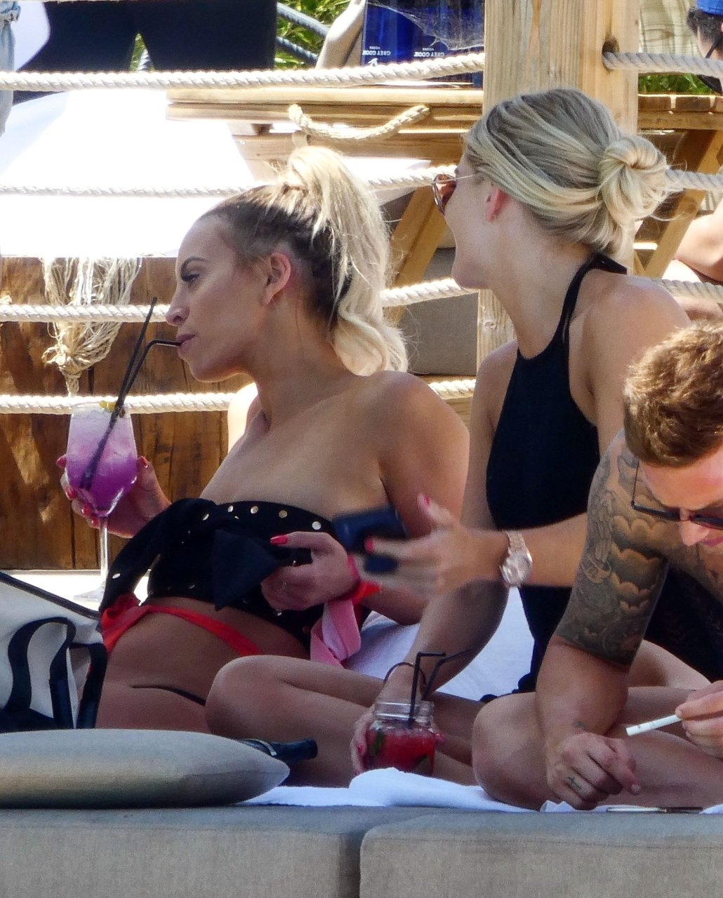 Estrella de TOWIE Ferne McCann fotografiada con un apuesto hombre misterioso mientras se relajaba en el moderno Nao Pool Club en Marbella, 22/06/2018. Ferne fue fotografiada luciendo relajada mientras tomaba el sol y disfrutaba de bebidas con sus amigos mientras descansaba junto a la piscina con un bikini negro que mostraba su físico playero y sus pechos desnudos.