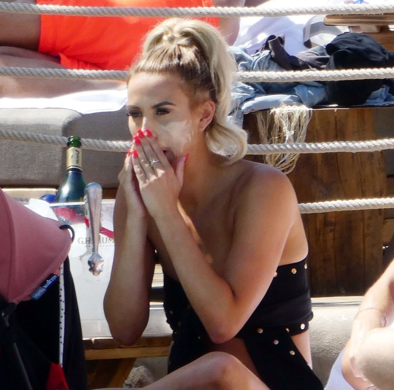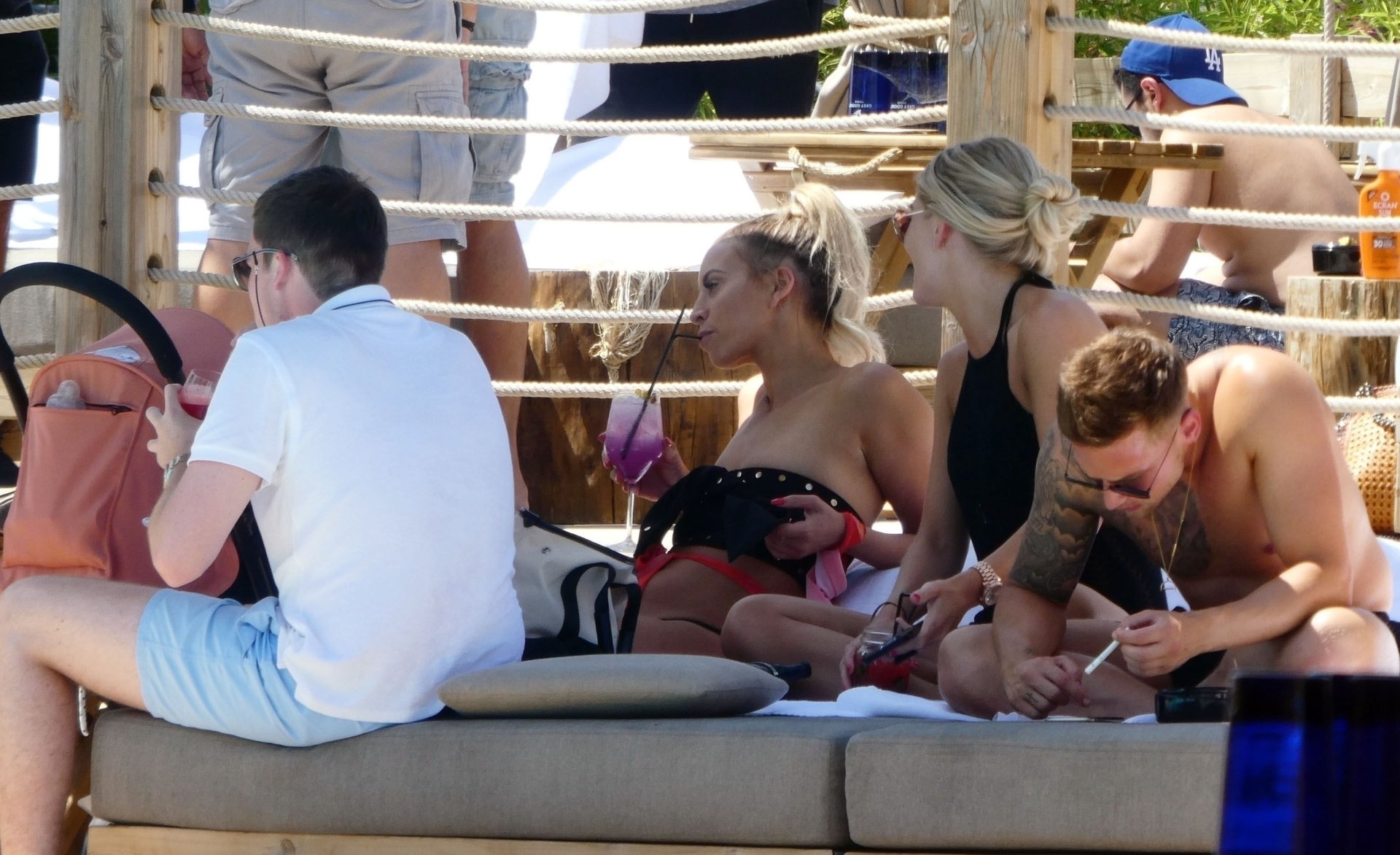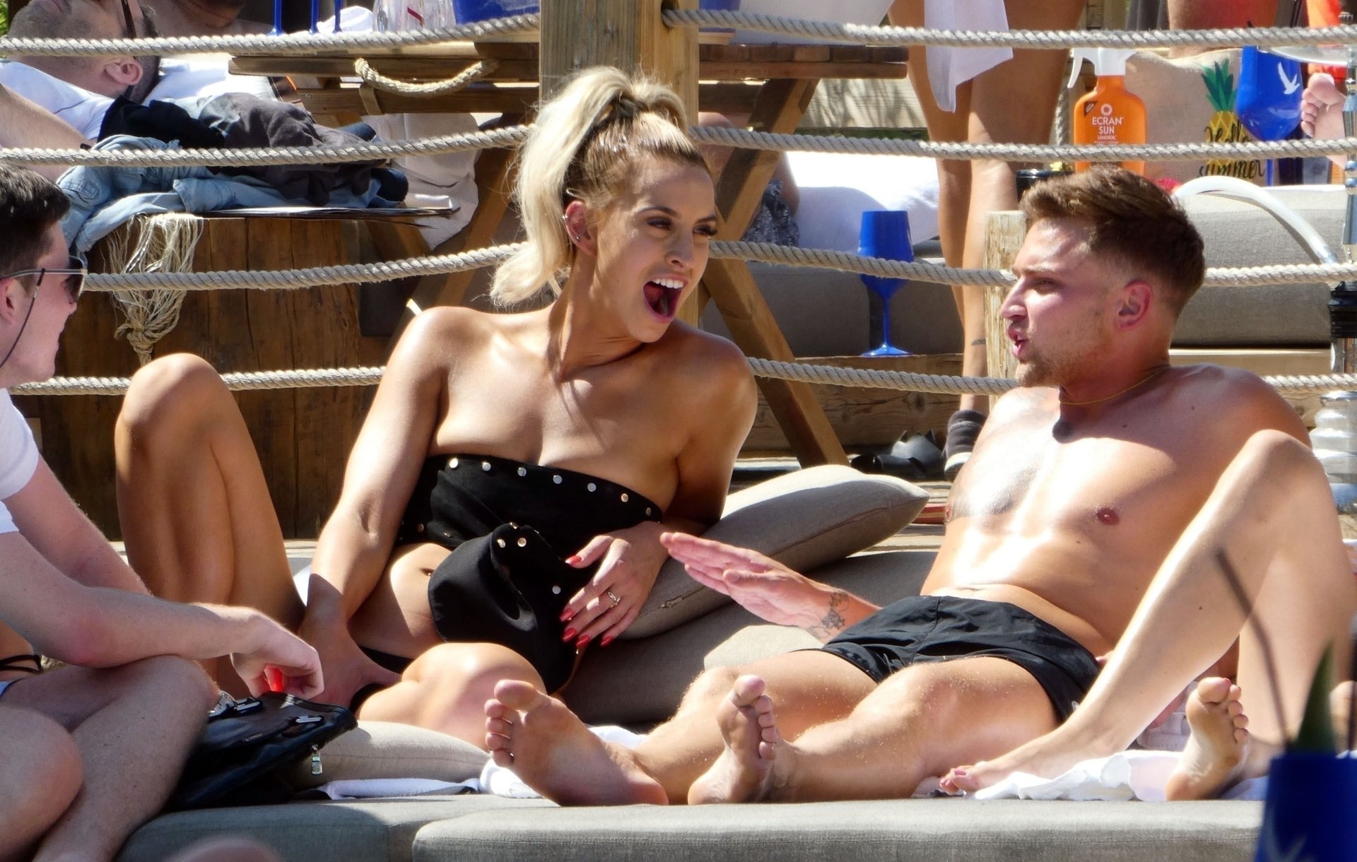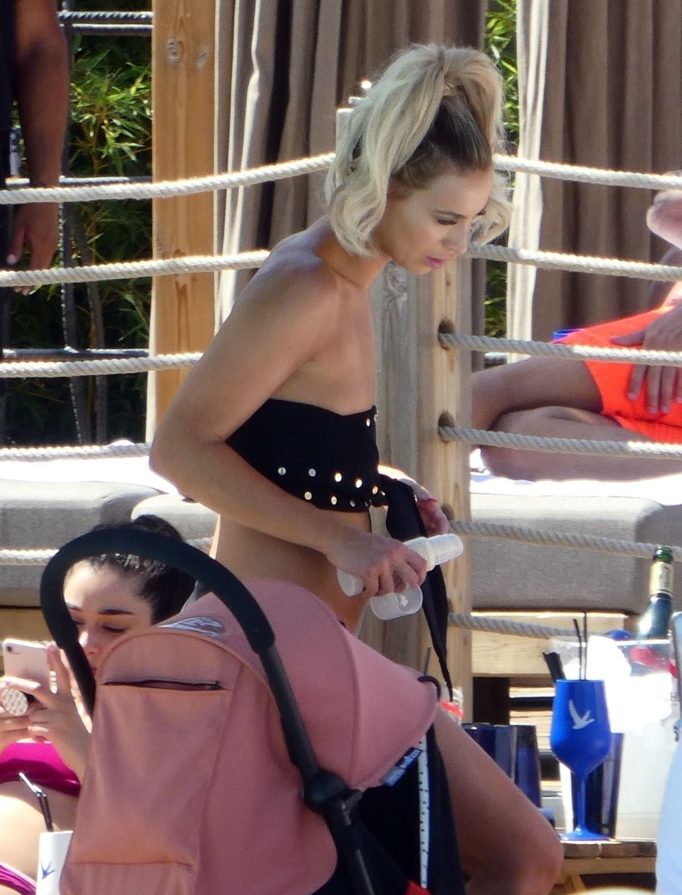 Estrella de TOWIE Ferne McCann fotografiada con un apuesto hombre misterioso mientras se relajaba en el moderno Nao Pool Club en Marbella, 22/06/2018. Ferne fue fotografiada luciendo relajada mientras tomaba el sol y disfrutaba de bebidas con sus amigos mientras descansaba junto a la piscina con un bikini negro que mostraba su físico playero y sus pechos desnudos.