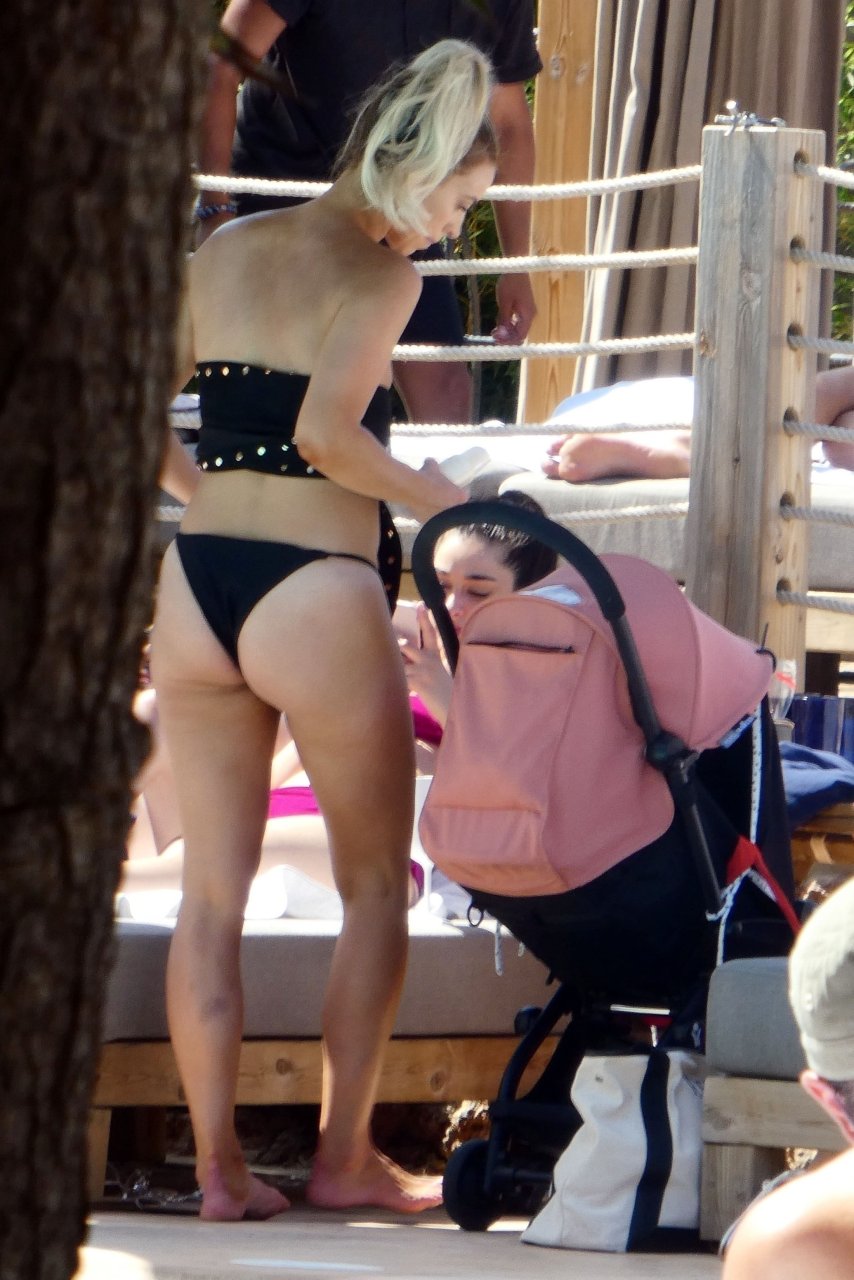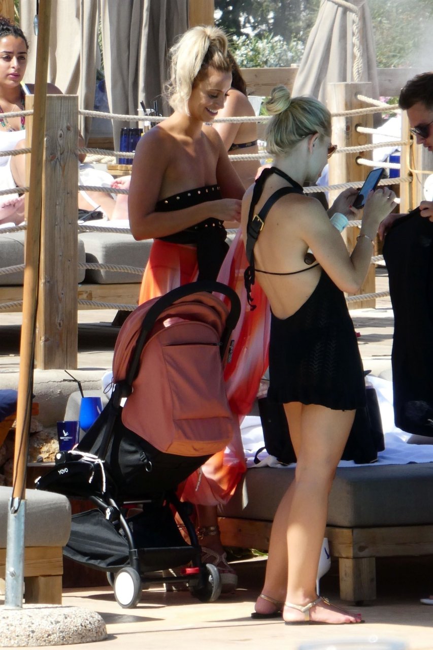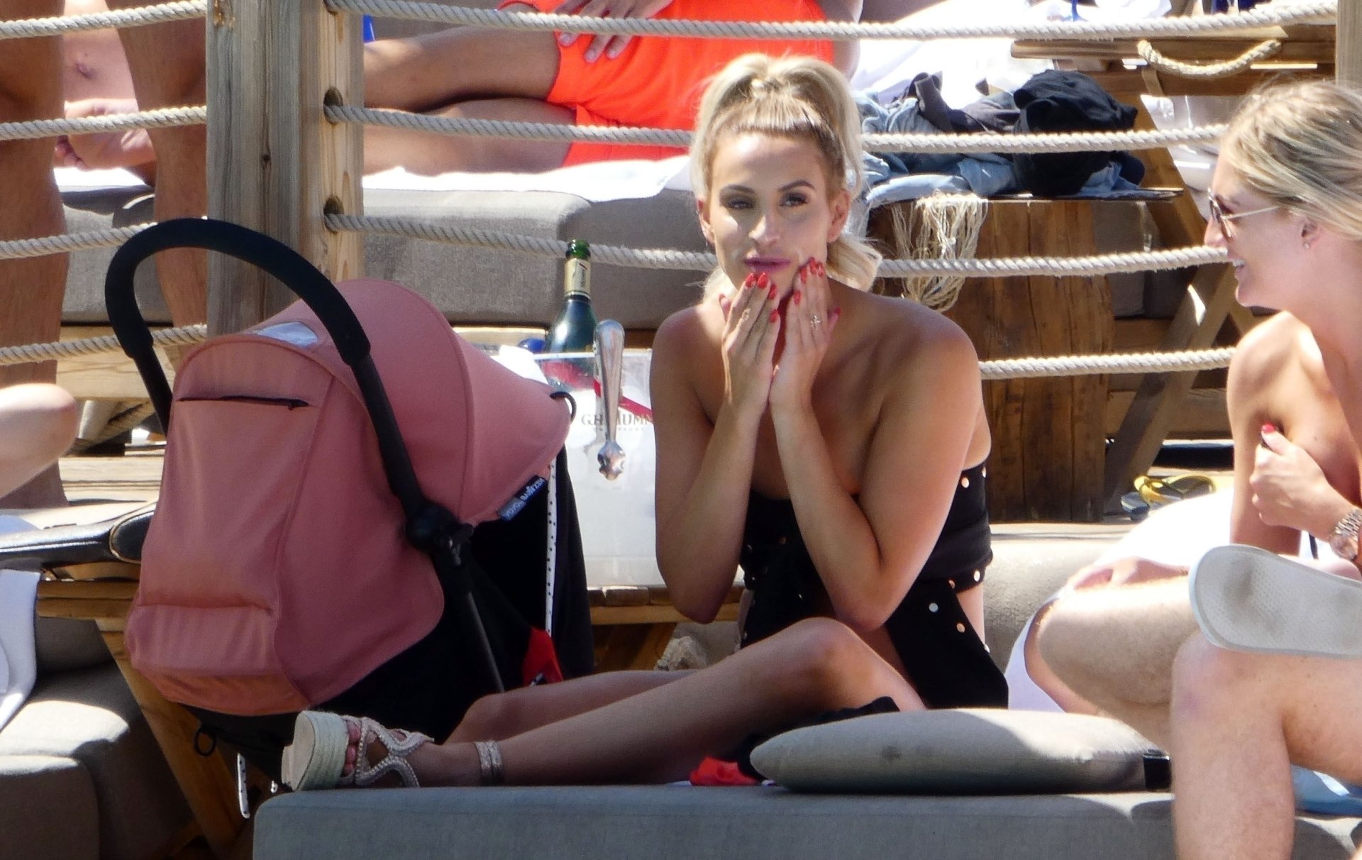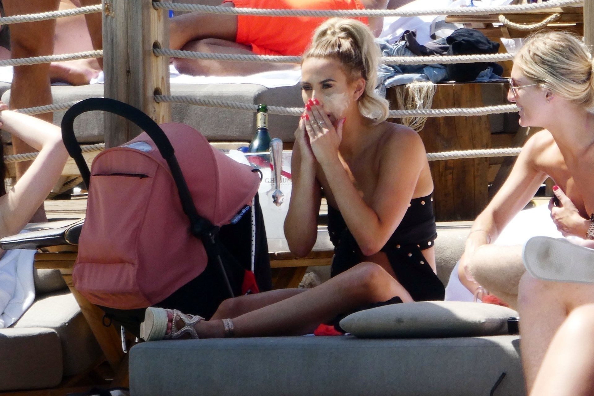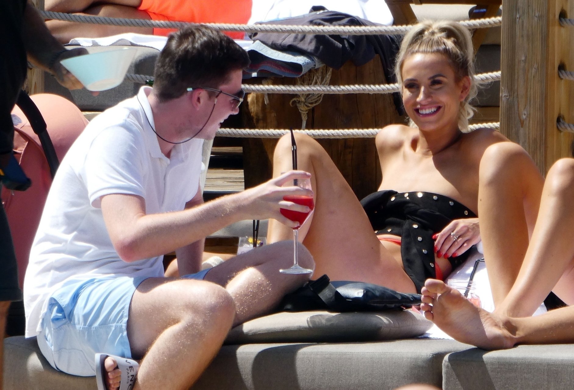Estrella de TOWIE Ferne McCann fotografiada con un apuesto hombre misterioso mientras se relajaba en el moderno Nao Pool Club en Marbella, 22/06/2018. Ferne fue fotografiada luciendo relajada mientras tomaba el sol y disfrutaba de bebidas con sus amigos mientras descansaba junto a la piscina con un bikini negro que mostraba su físico playero y sus pechos desnudos.