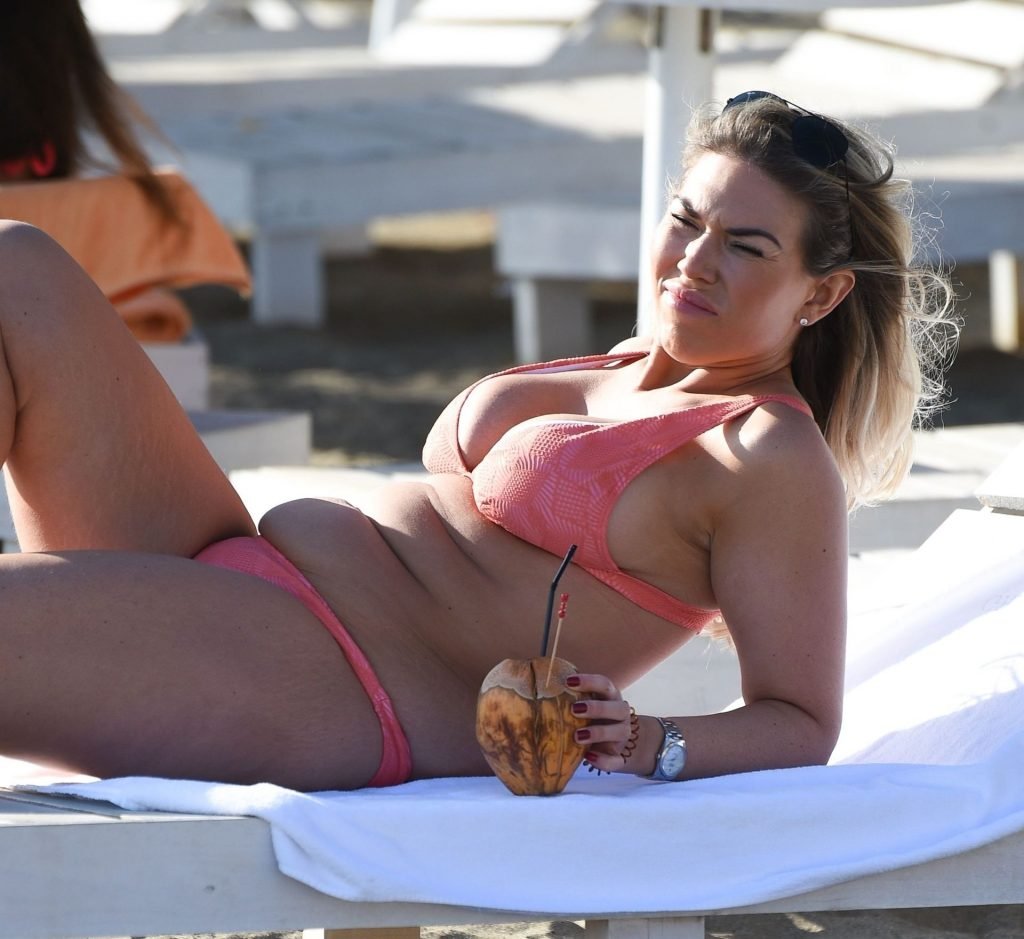 La ex estrella de TOWIE Frankie Essex muestra su reciente aumento de peso mientras disfruta de unas vacaciones soleadas en Tenerife (2018). Frankie (30) se la ve disfrutando de un cóctel en la playa con un bikini color durazno.
