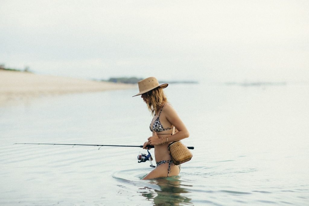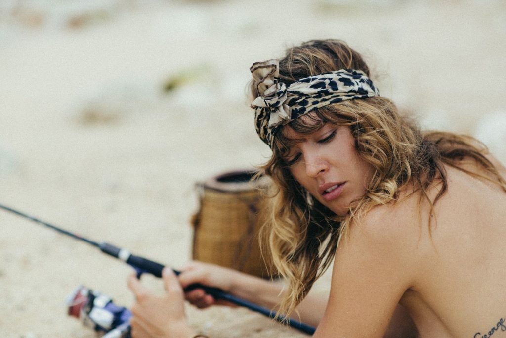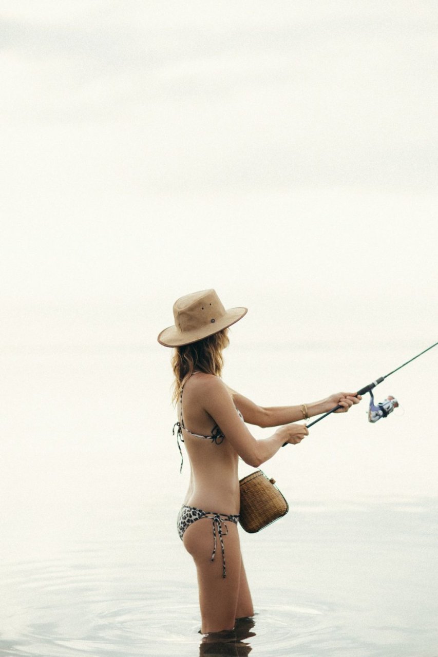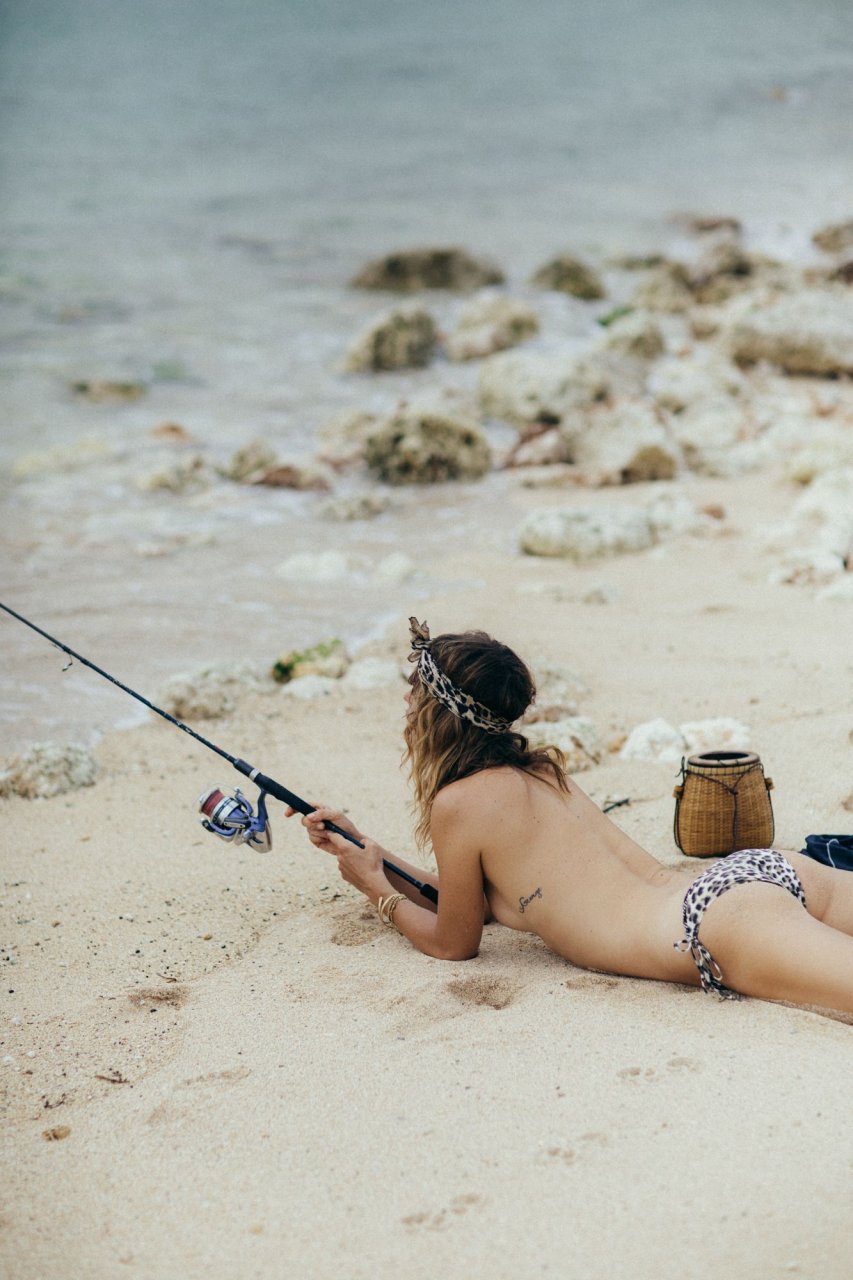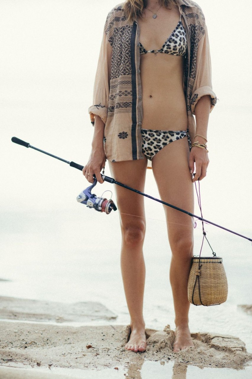 La modelo alemana Franziska von Tschurtschenthaler (Cisco) posa topless y en bikini mientras pesca en una sesión fotográfica de Carly Brown (2019).