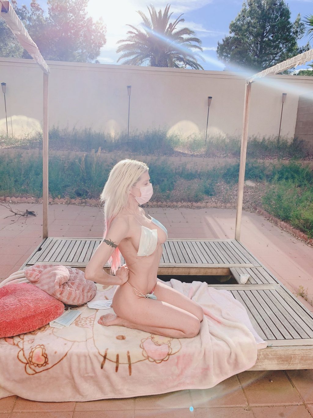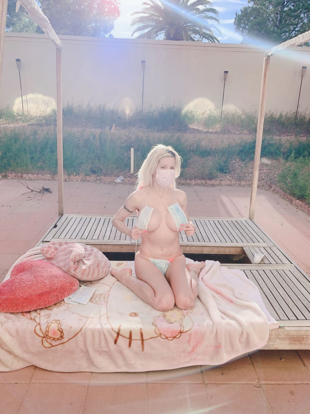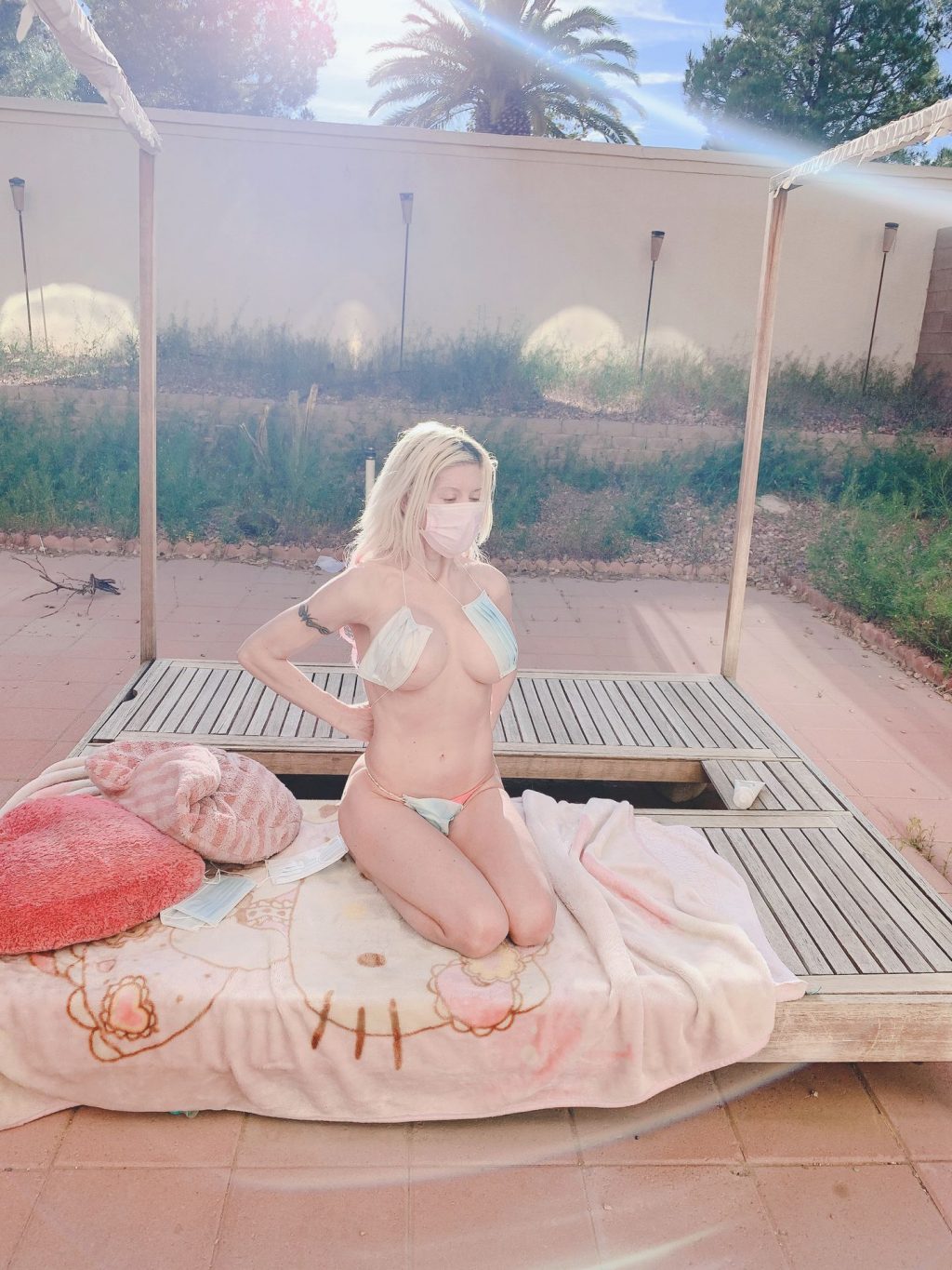 La estrella de Reality TV, Frenchy Morgan, que está volviéndose loca de estar encerrada, decide ser creativa durante el cierre por el coronavirus haciendo un bikini con mascarillas mientras permanece aislada en su casa de Las Vegas, 12/04/2020.