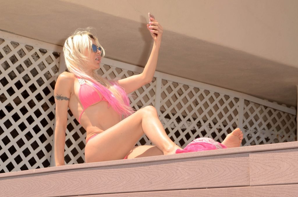 Frenchy Morgan vista con un bikini rosa tomando selfies en Malibu, 09/05/2017. Angelique “Frenchy” Morgan es una personalidad de la televisión de realidad (Celebrity Big Brother), actriz, modelo y bailarina de París. Edad – 41.