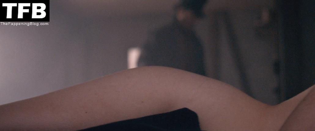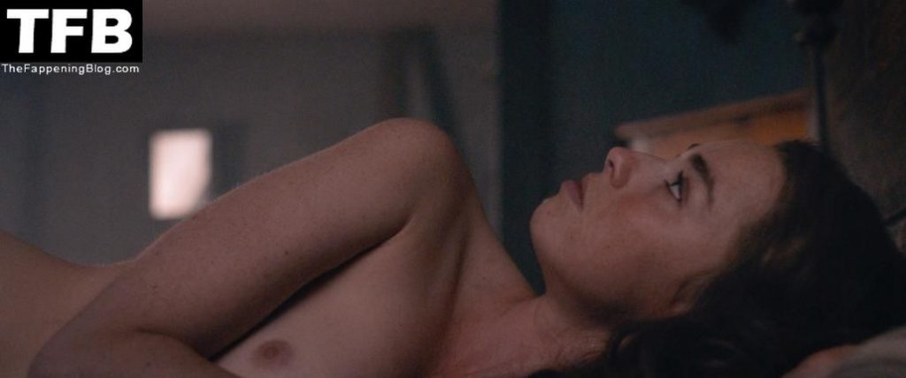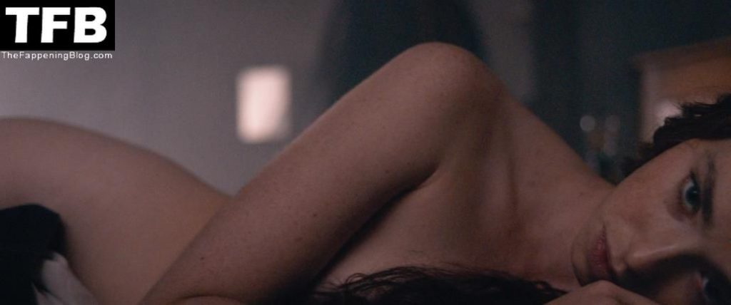 Freya Mavor está acostada desnuda de lado en la cama, mostrando primero su cadera desnuda y luego su pecho derecho después de mirar por encima del hombro a un hombre que sale de la habitación.