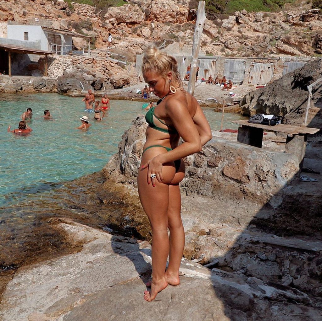 La ex estrella de Love Island fue vista disfrutando de su descanso bajo el sol español con amigos en Ocean Beach en Ibiza, 21/07/2020.
