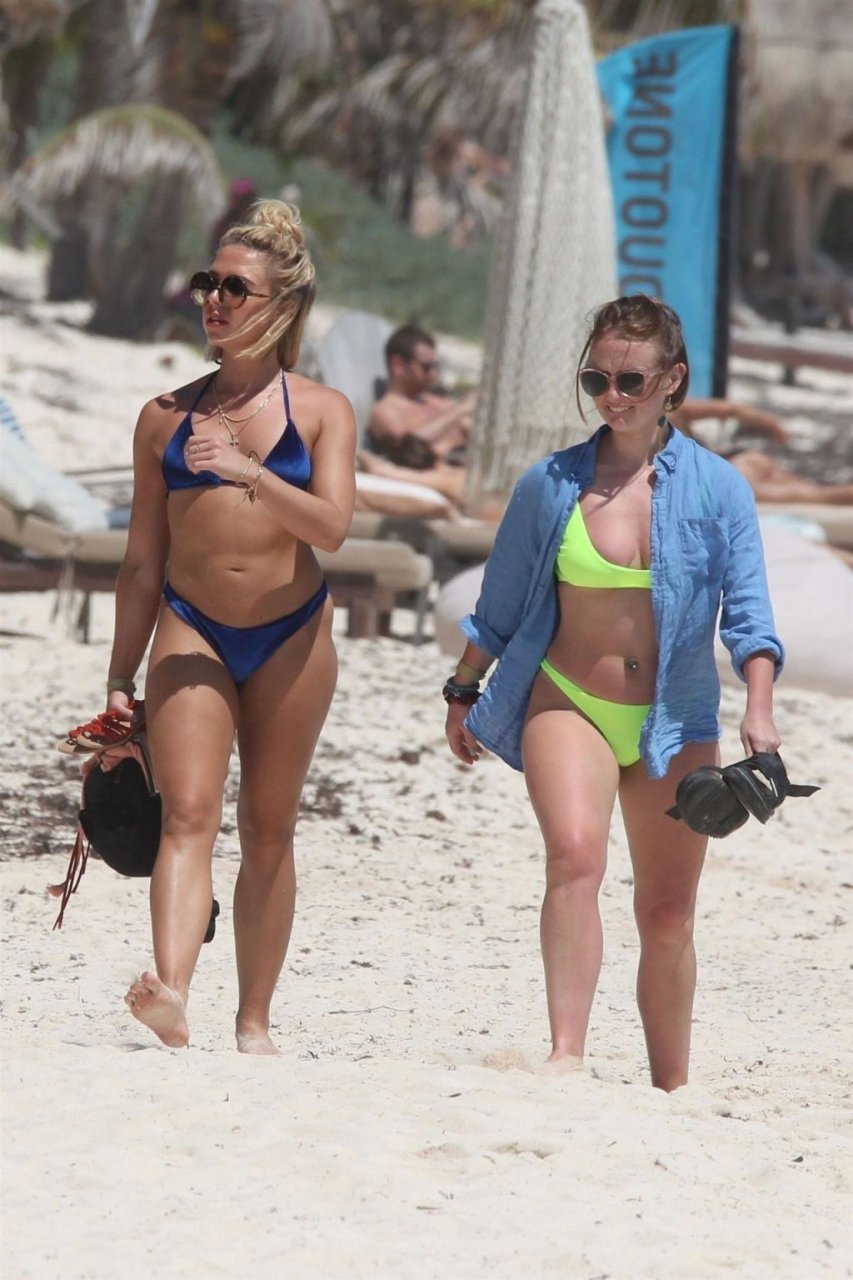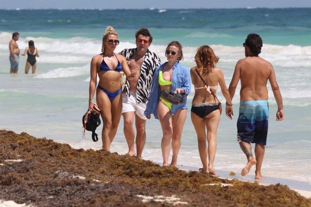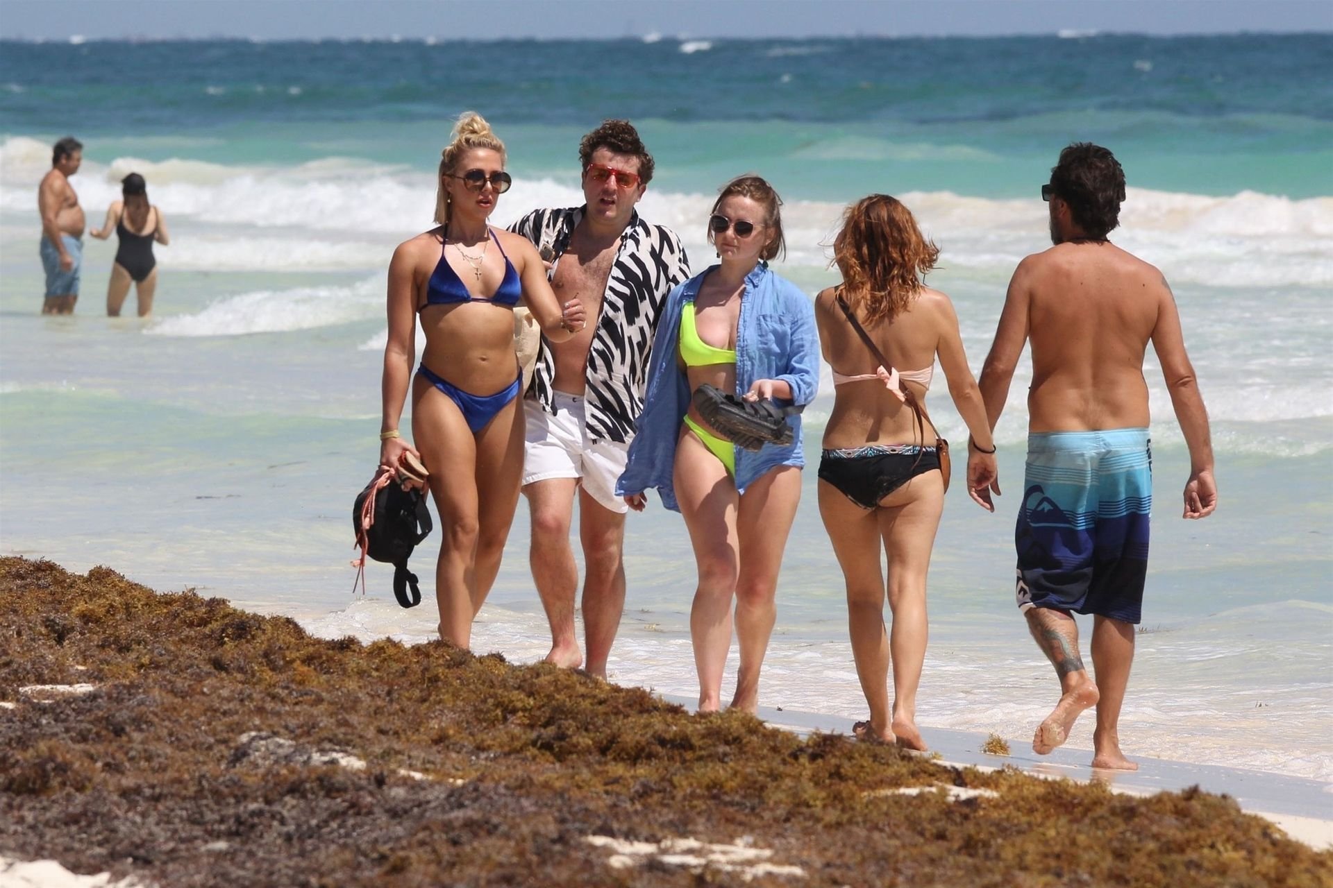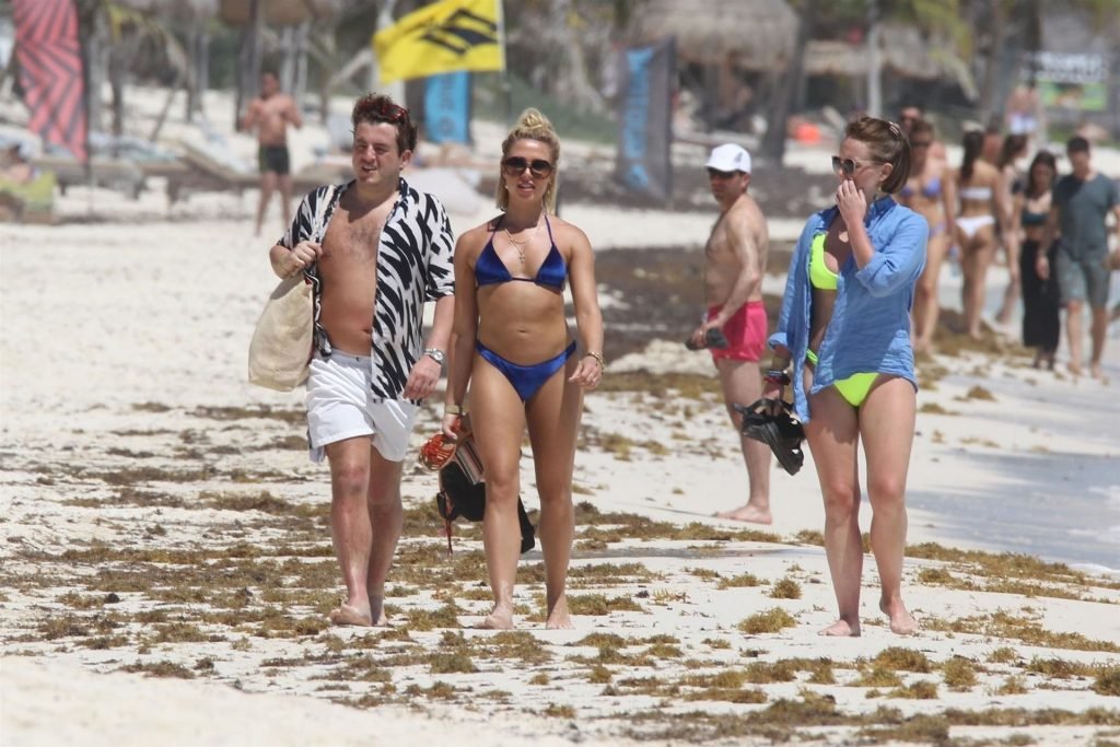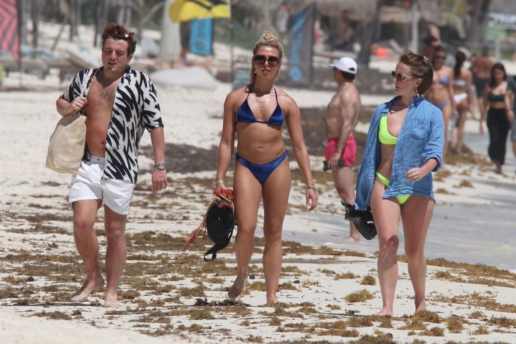 Gabby Allen de Love Island y algunos amigos disfrutan de un día en la playa durante sus vacaciones en Tulum, México, 08/03/2019. Gabby mostró su cuerpo tonificado con un bikini naranja antes de cambiarse a un bikini azul.