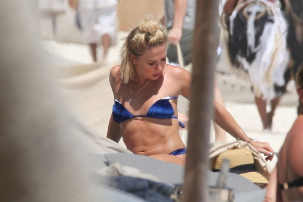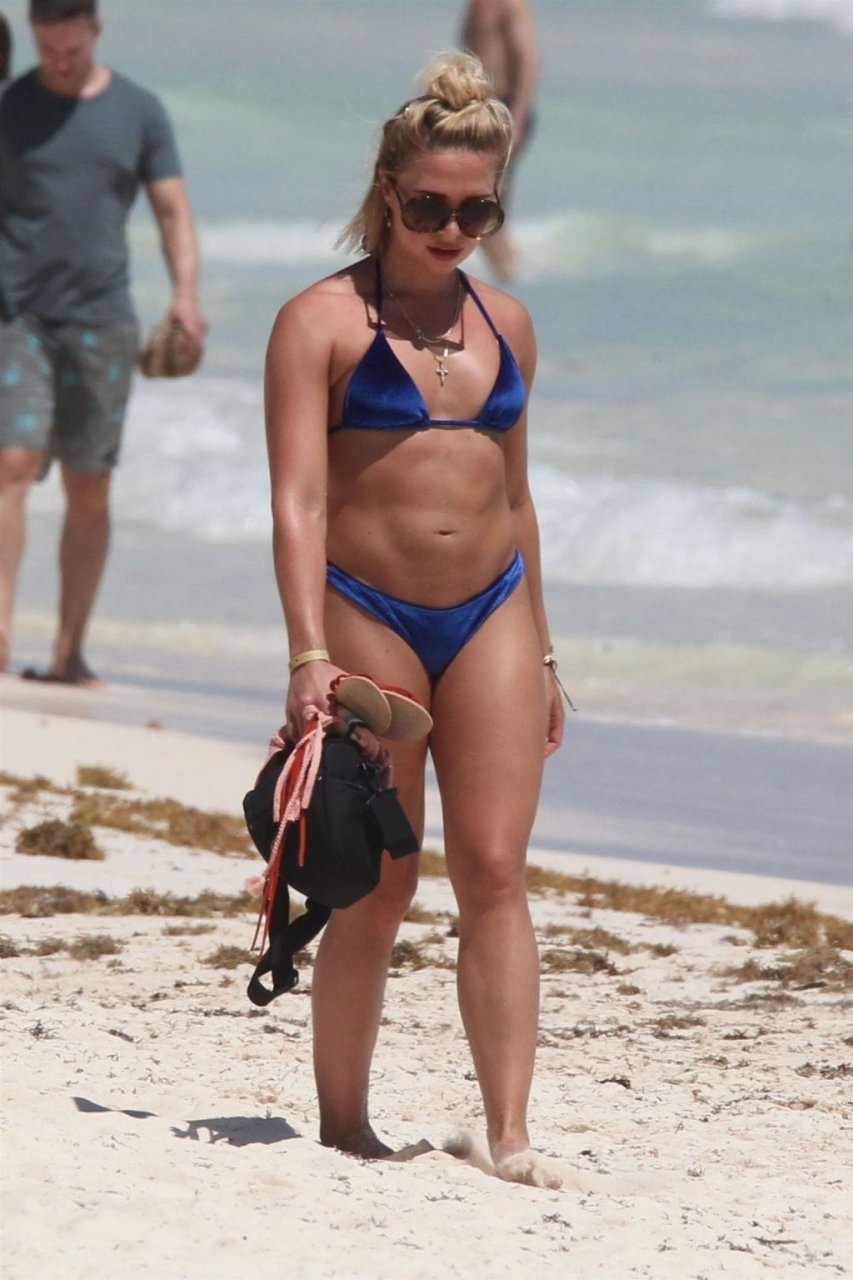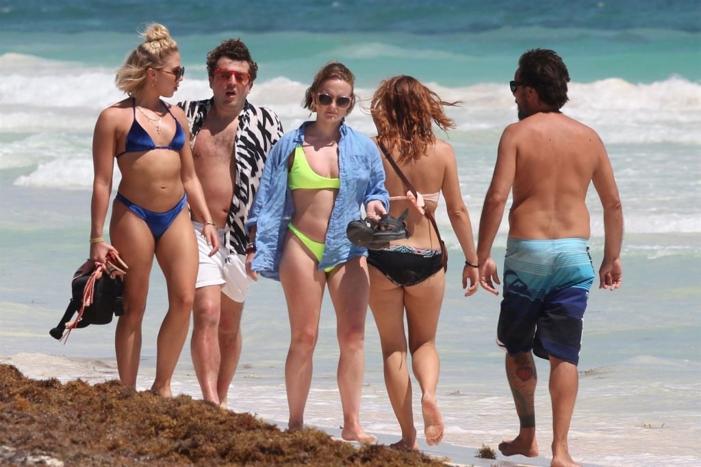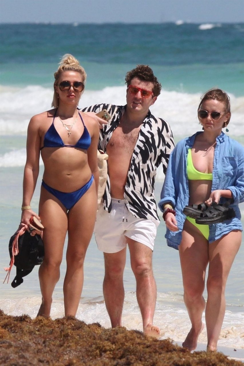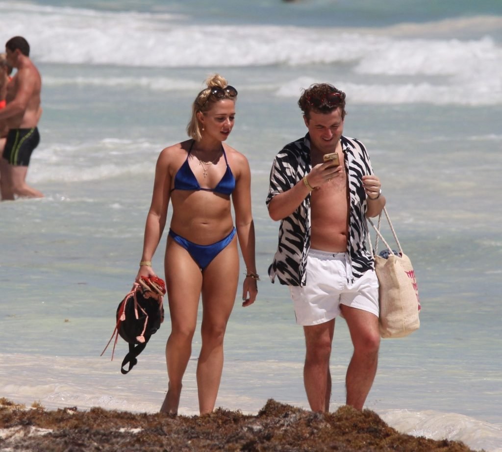 Gabby Allen de Love Island y algunos amigos disfrutan de un día en la playa durante sus vacaciones en Tulum, México, 08/03/2019. Gabby mostró su cuerpo tonificado con un bikini naranja antes de cambiarse a un bikini azul.