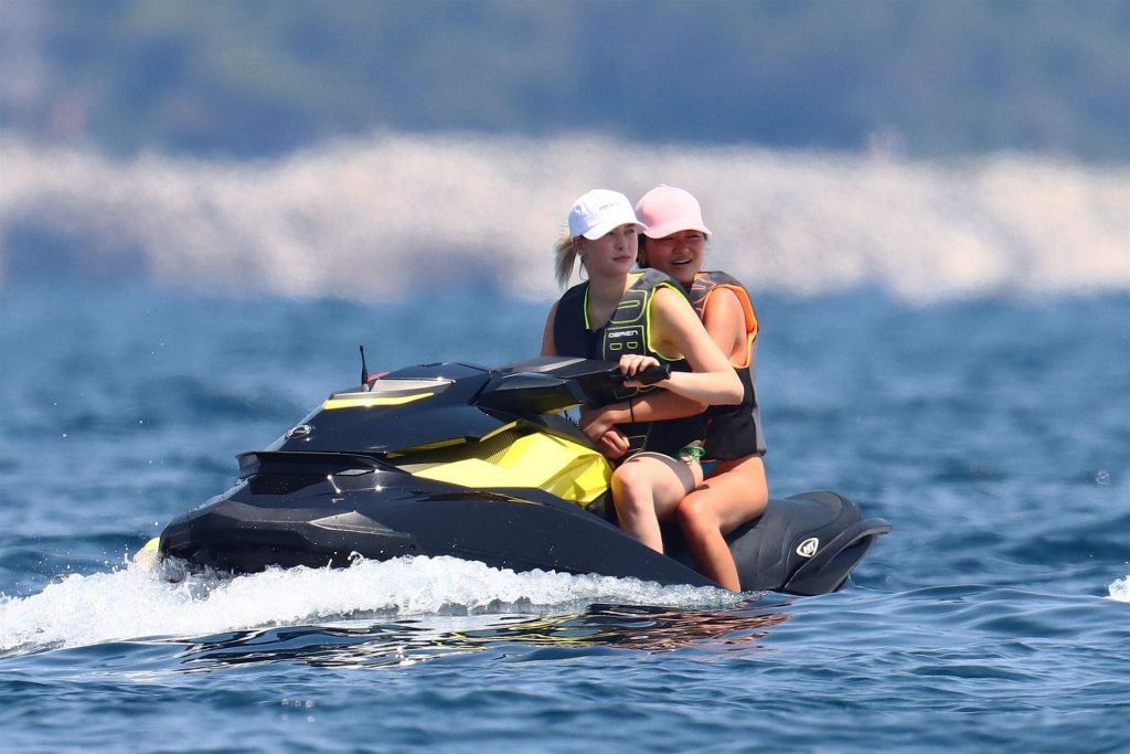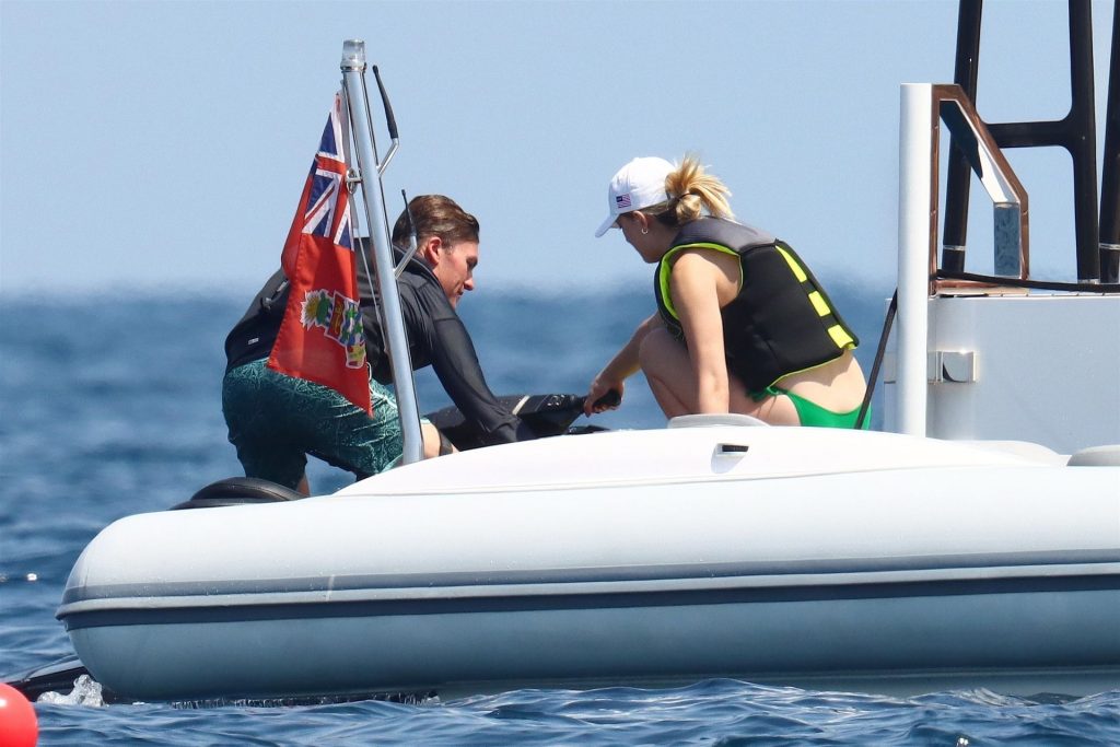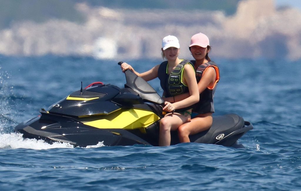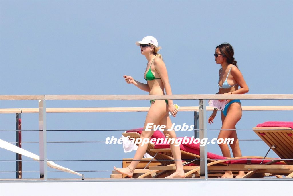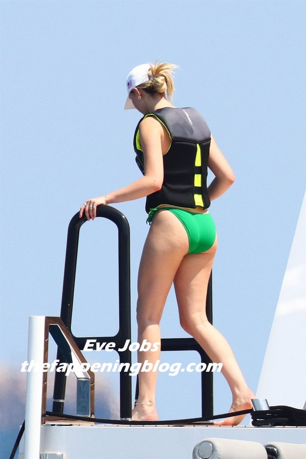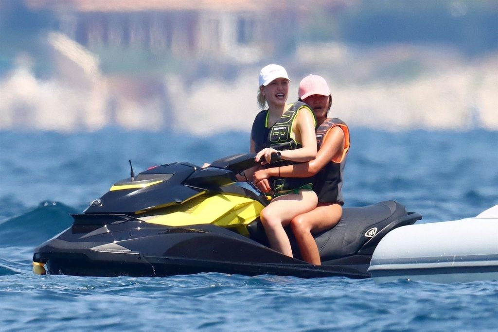 Eve, con poca ropa, luciendo su pequeño bikini verde, disfruta de un emocionante paseo en moto acuática y lleva una gorra que dice “Fuck It”, con la bandera de EE.UU. en el costado.