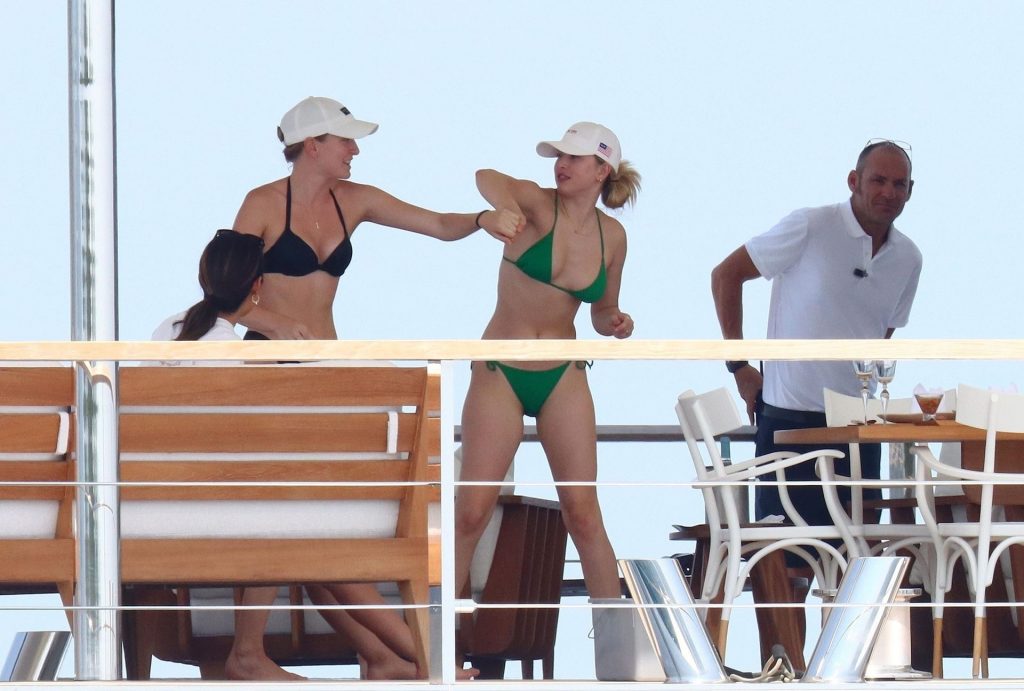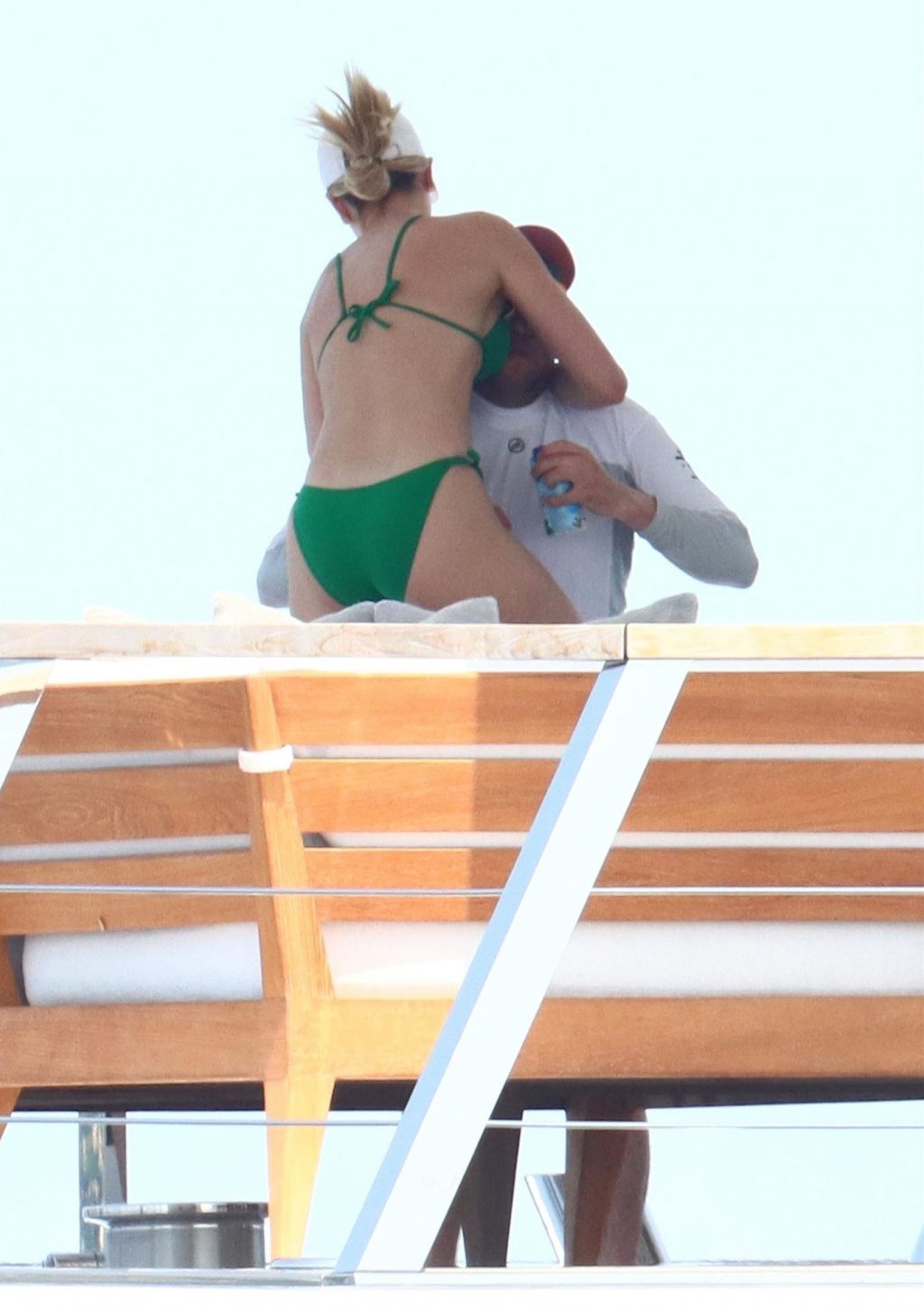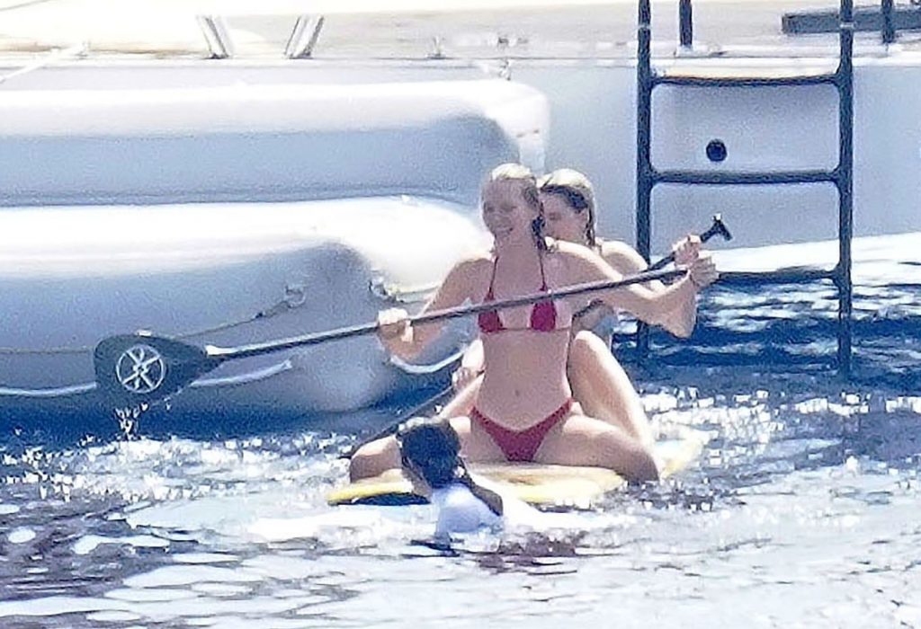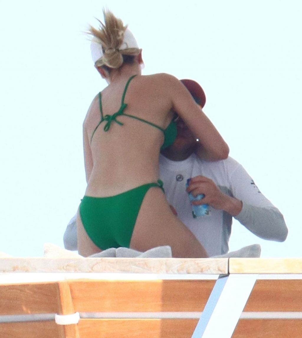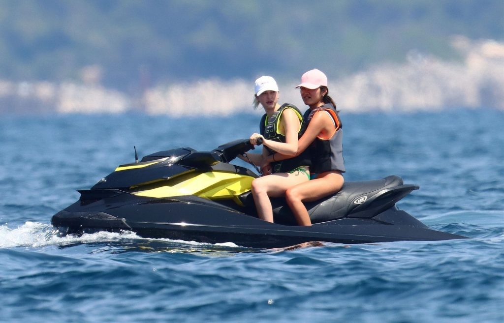 Eve, con poca ropa, luciendo su pequeño bikini verde, disfruta de un emocionante paseo en moto acuática y lleva una gorra que dice “Fuck It”, con la bandera de EE.UU. en el costado.