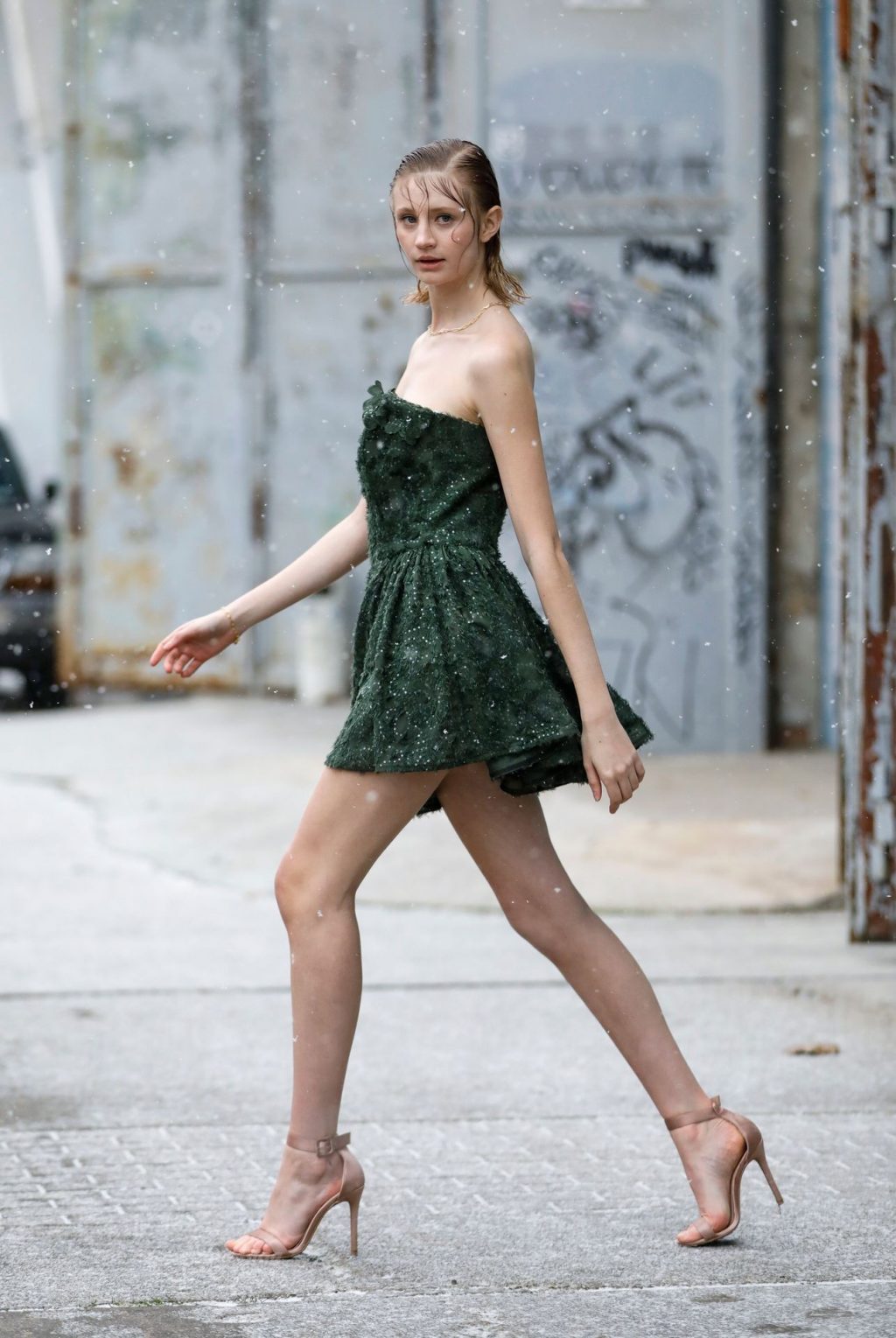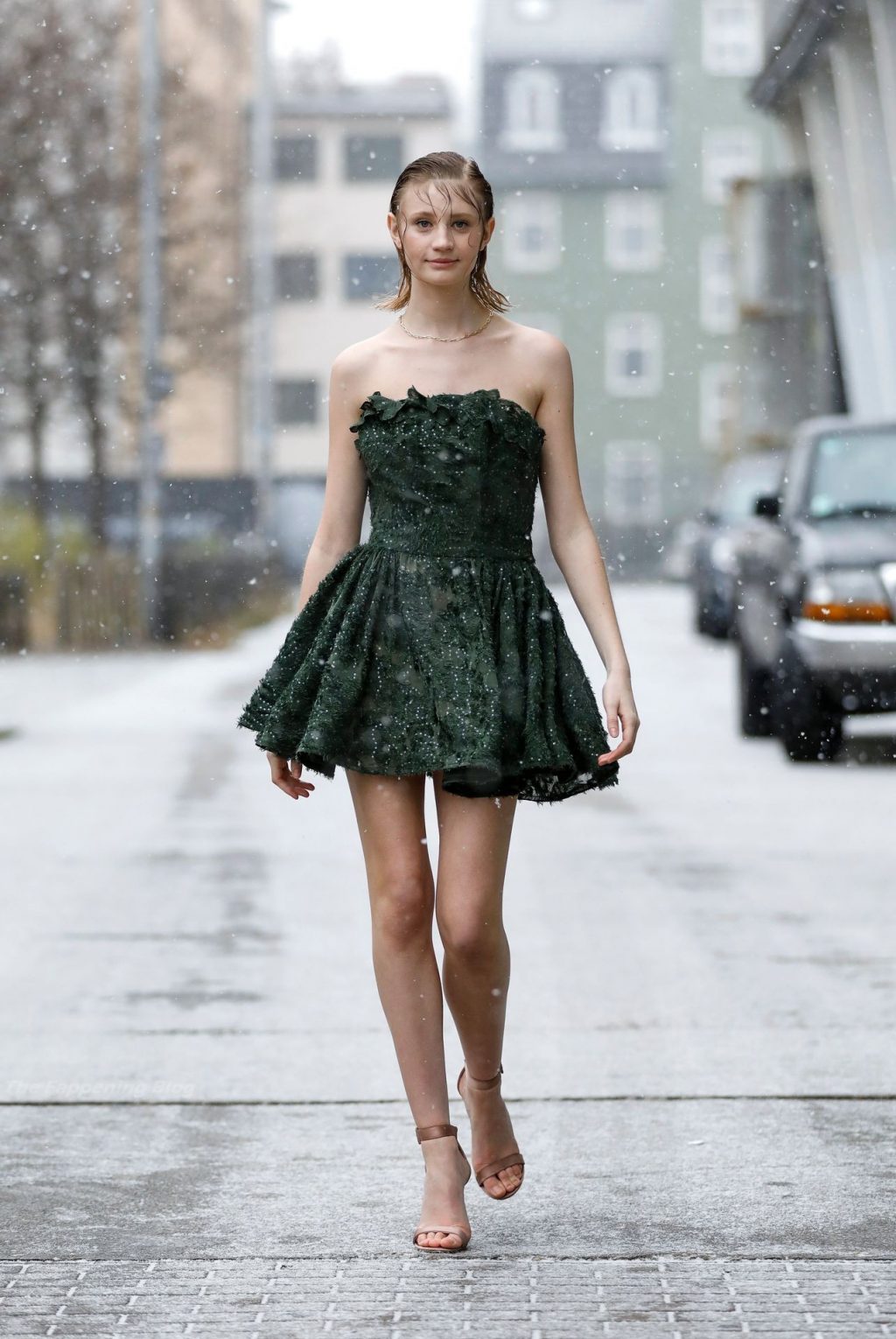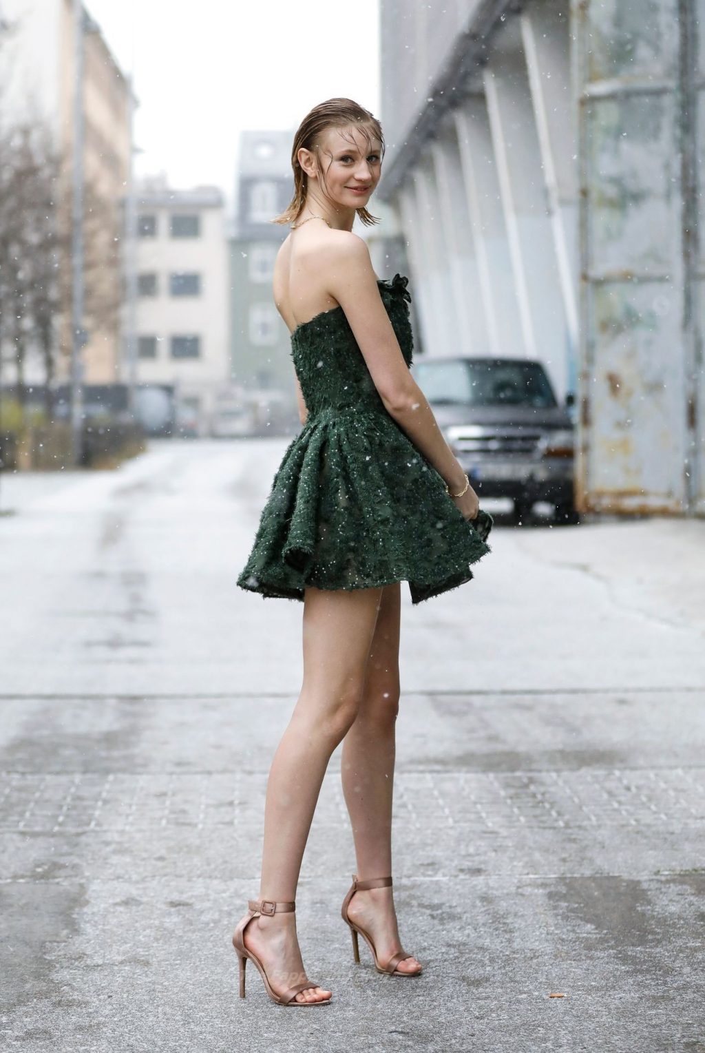 La modelo alemana Trixi Giese (21) aparece con un vestido mini strapless verde oscuro con detalles de lentejuelas y sandalias nude de Lana Mueller durante una sesión de estilo callejero en la Semana de la Moda Mercedes-Benz Berlín, 18/01/2021.
