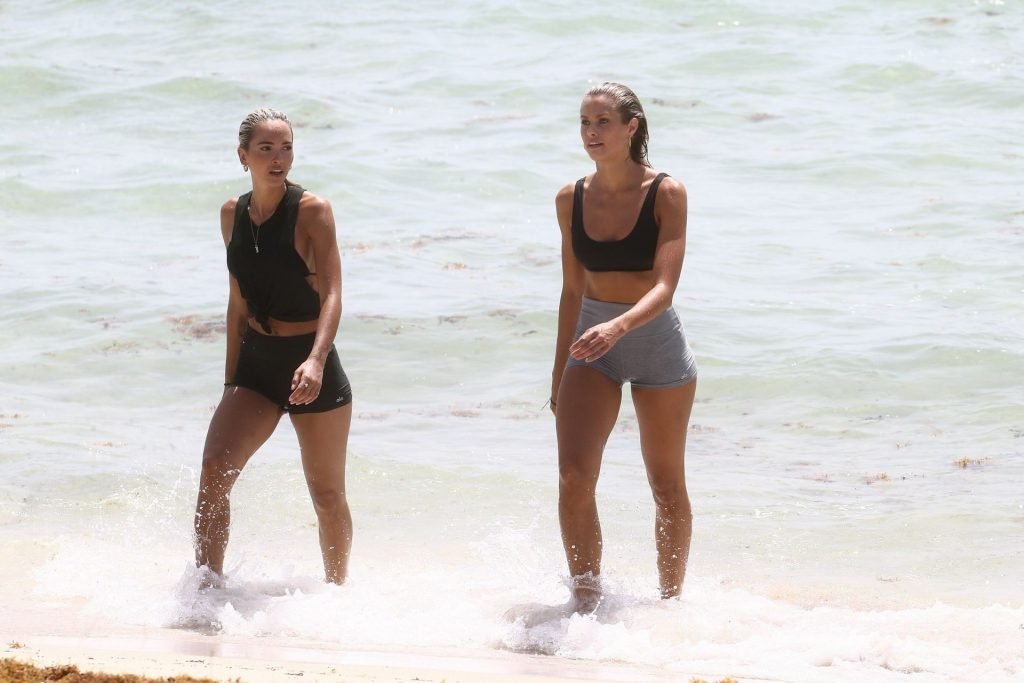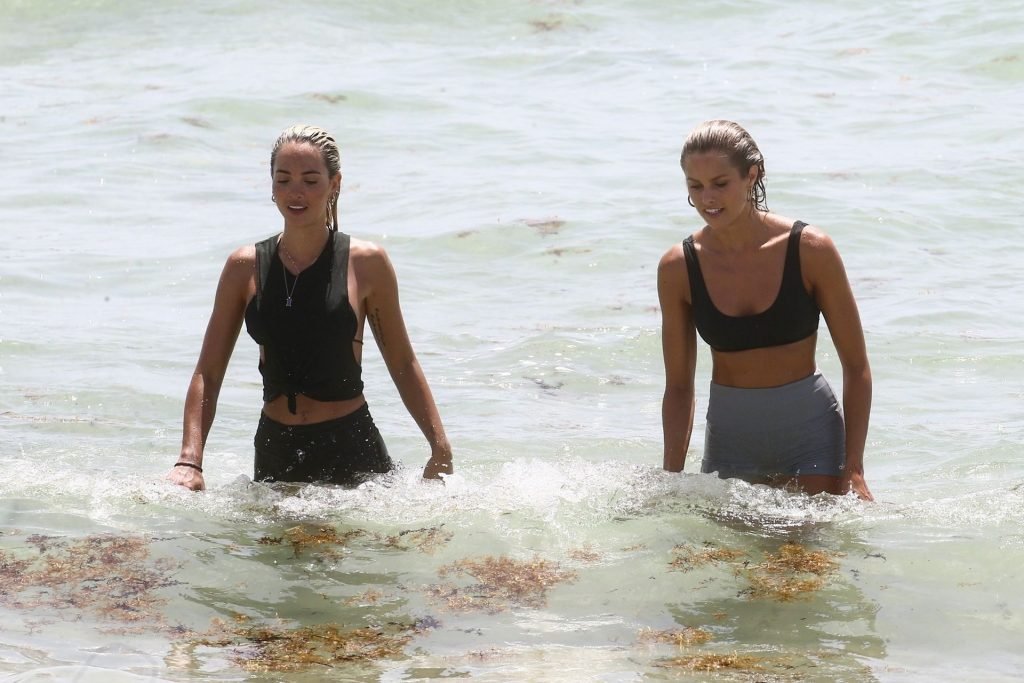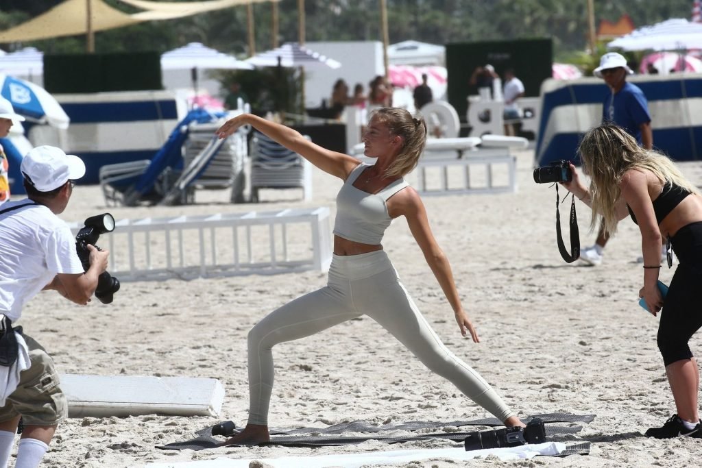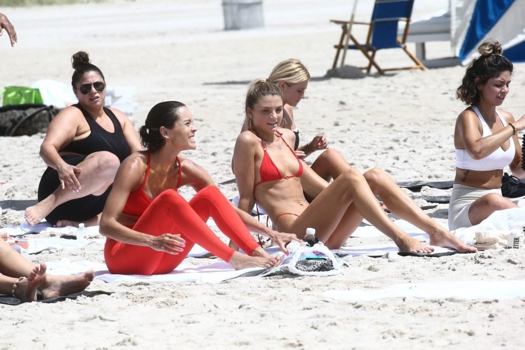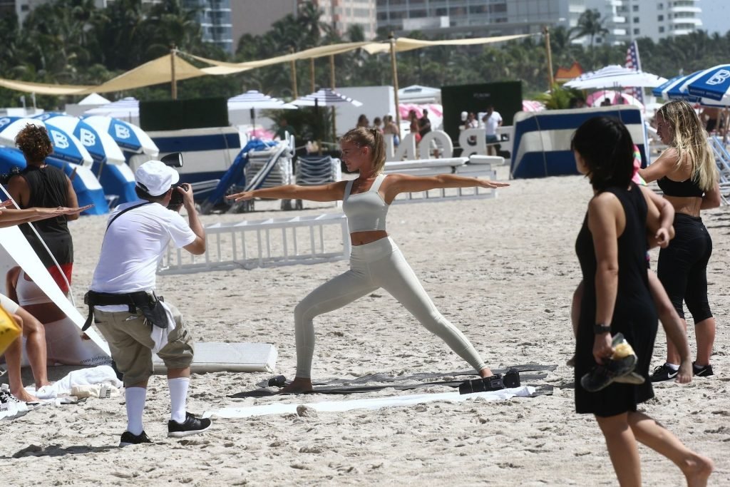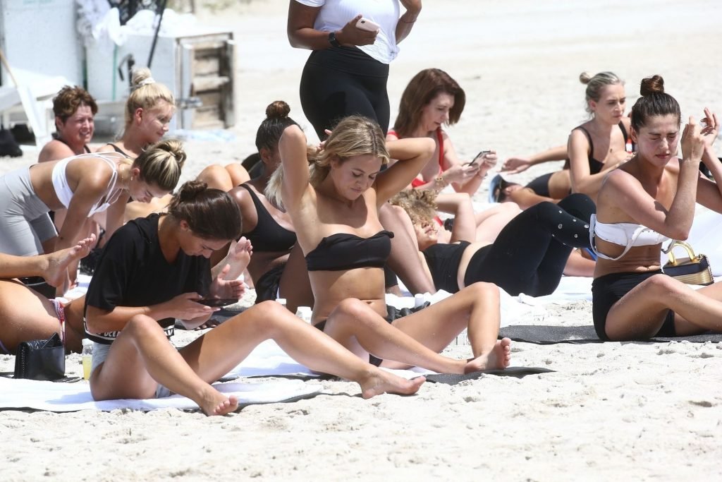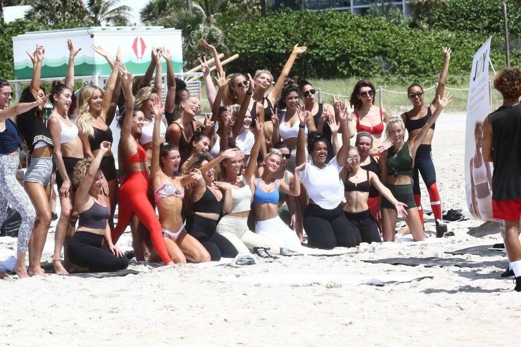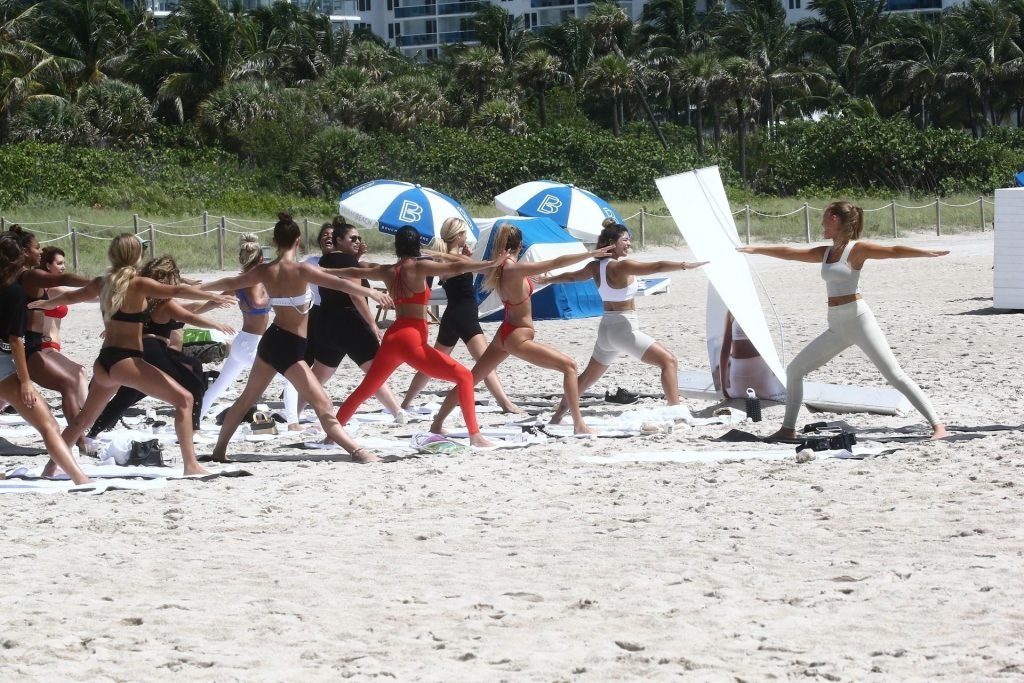 Las sensaciones de las redes sociales Georgia Gibbs, Lindsey Heppner, Natalie Rose y Bree Kleintop calientan la playa mientras participan en una clase de yoga durante la Peroni Swim Week: Fashion Show & Pop-Up en Miami, 14/07/2019. Después de su sesión, las chicas se dieron un chapuzón en el océano para refrescarse.