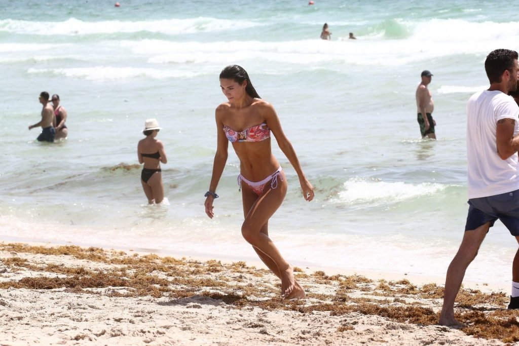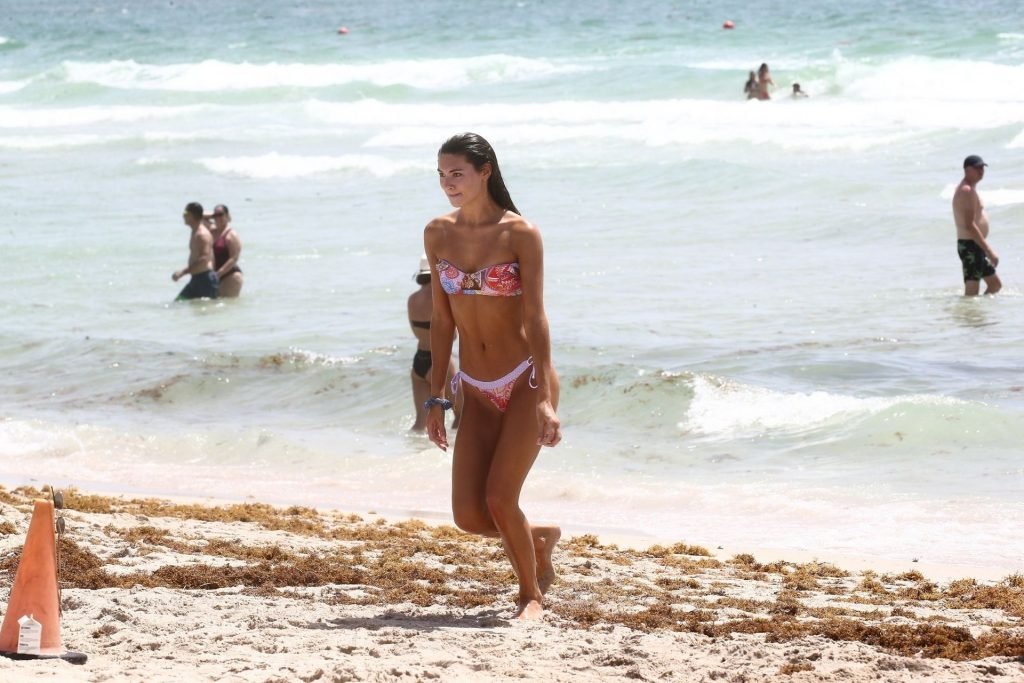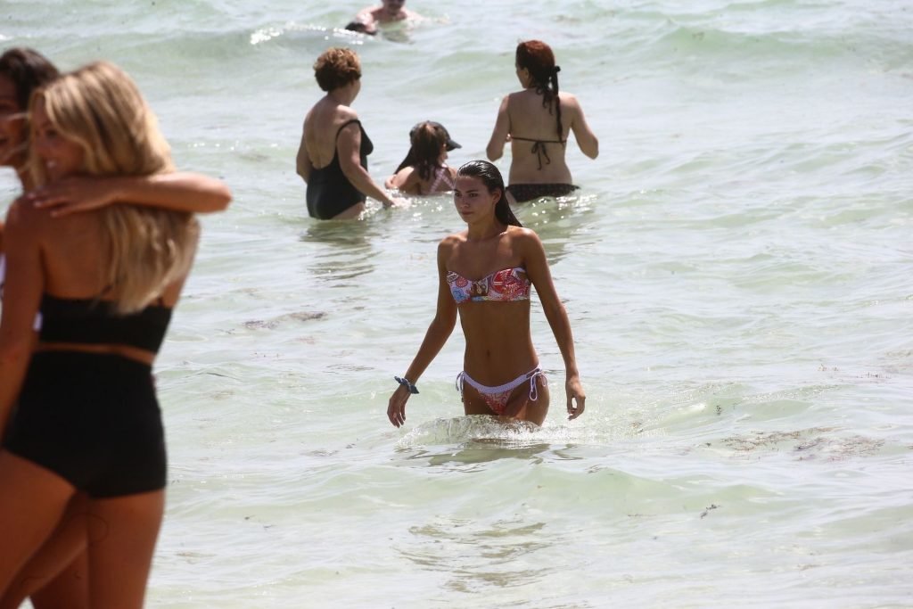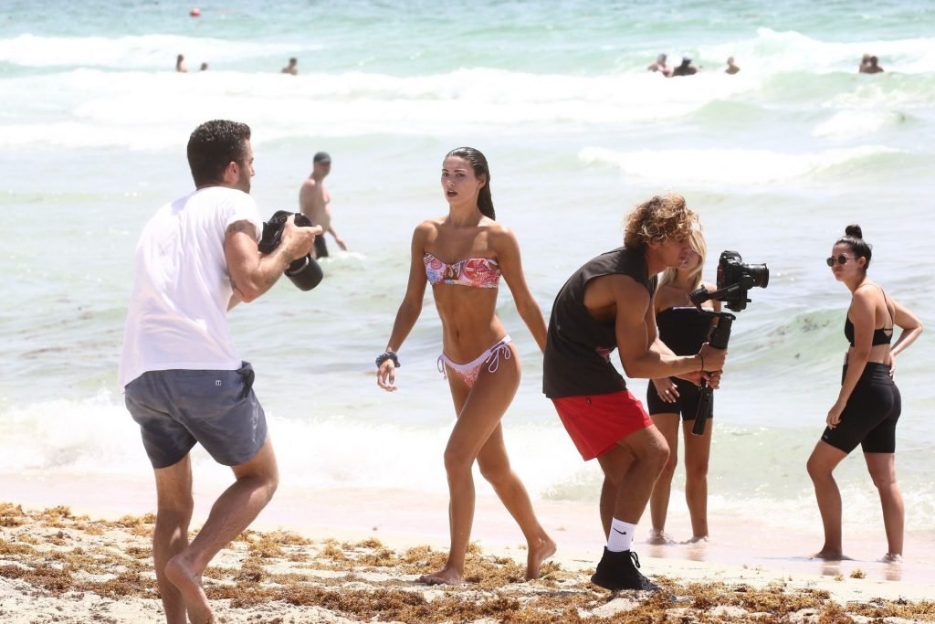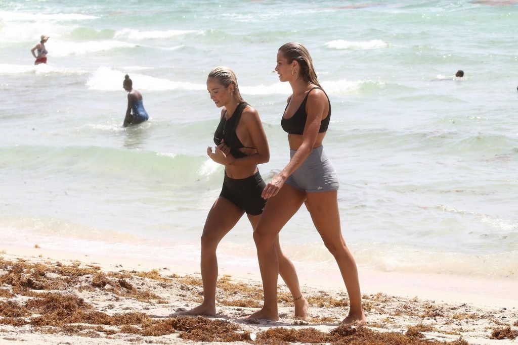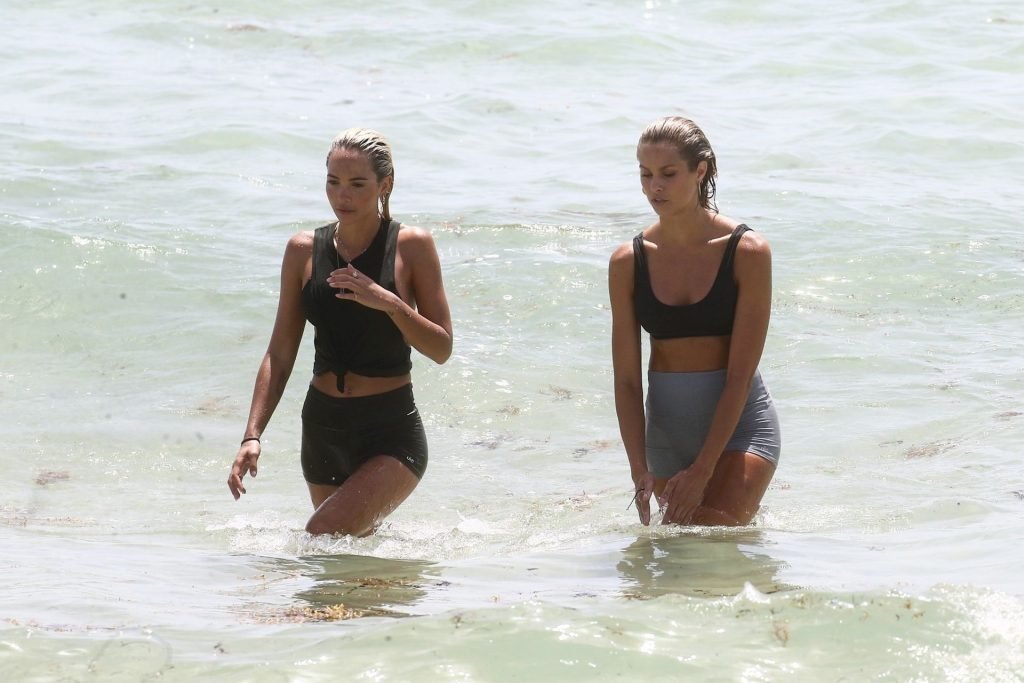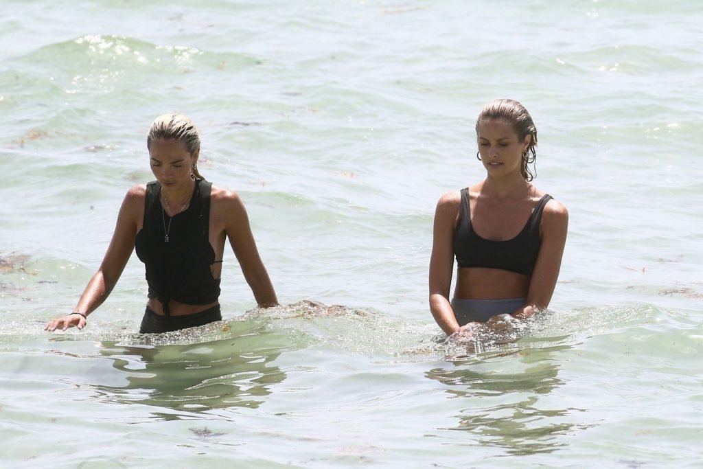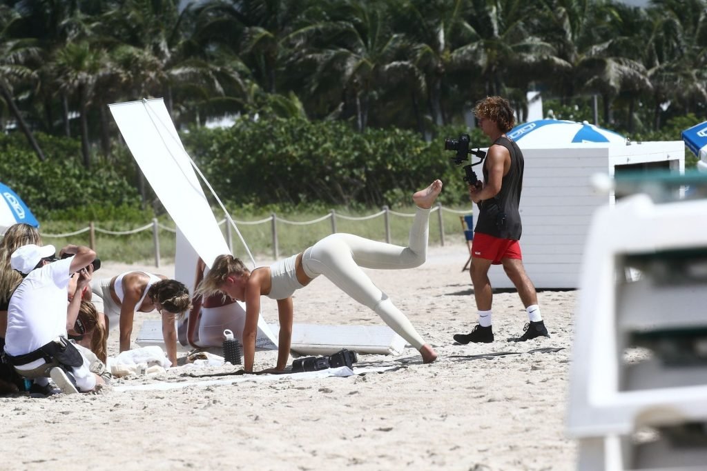 Las sensaciones de las redes sociales Georgia Gibbs, Lindsey Heppner, Natalie Rose y Bree Kleintop calientan la playa mientras participan en una clase de yoga durante la Peroni Swim Week: Fashion Show & Pop-Up en Miami, 14/07/2019. Después de su sesión, las chicas se dieron un chapuzón en el océano para refrescarse.